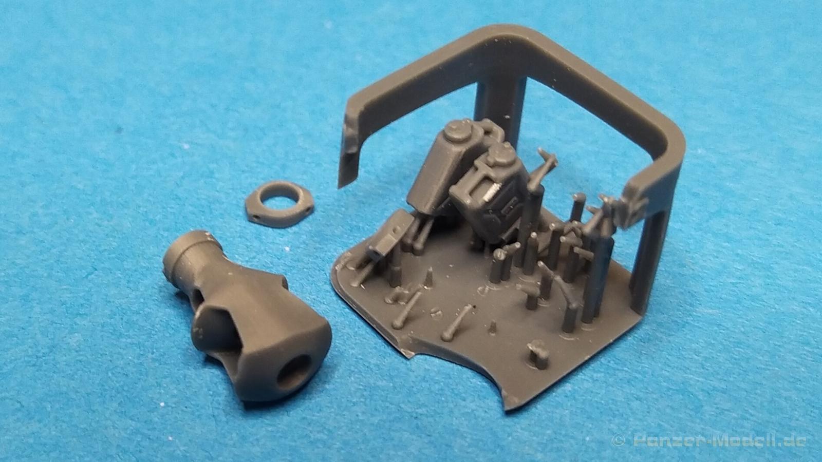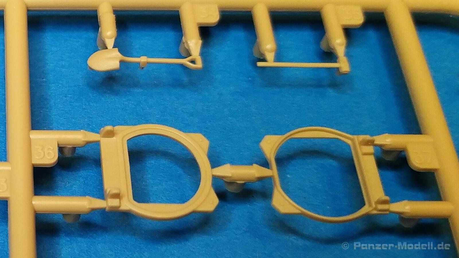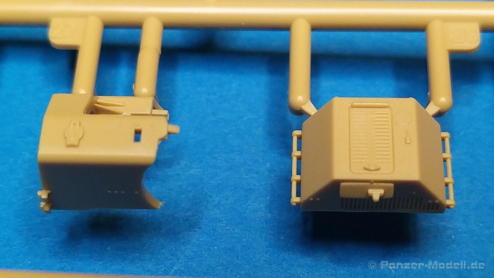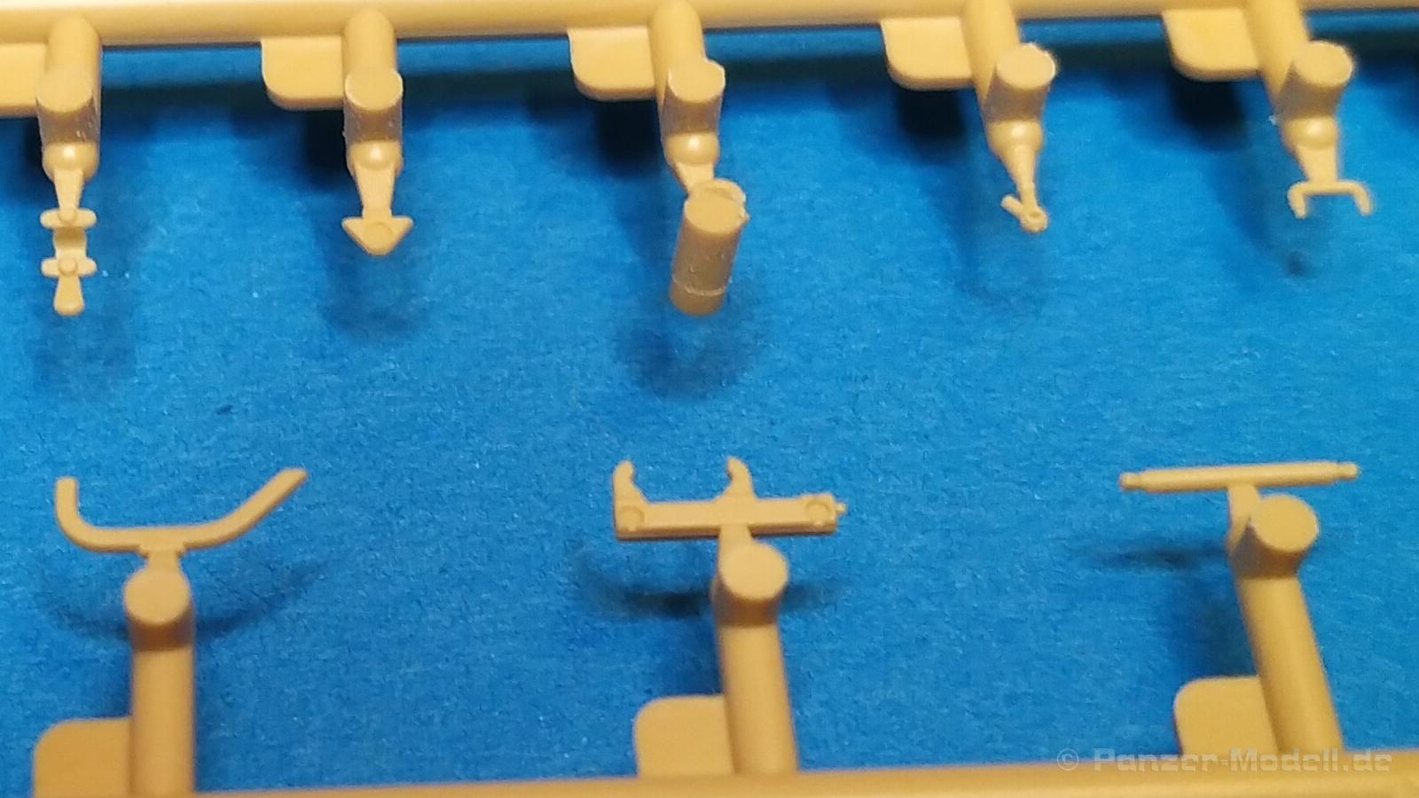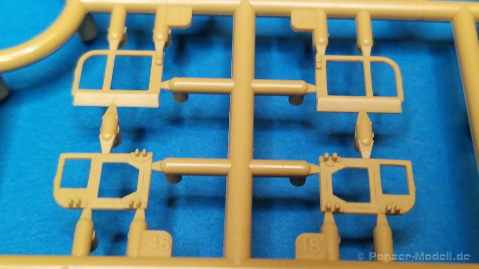Auf den ersten Blick überzeugen die Detailierung und Gravierung der einzelnen Bauteile. Die Aufteilung der Spritzlinge und die Angüsse sind sinnvoll gewählt, so dass man die Teile gut finden und auch leicht abtrennen kann. Auswerfermarken gibt es nur an später nicht sichtbaren Stellen, wie z.B. im Bereich der Innenseite der Kettensegmente. Diese müssten aber von den Laufrollen verdeckt werden. Kleine Grate / Fischhäute sind hier und da an den Endverbindern der Ketten zu finden. Mit einem scharfen Skalpell dürfte aber auch hier schnell Abhilfe geschaffen werden. Der Einsatz von Fotoätzteilen ist bei diesem Bausatz nur auf das nötigste bzw. sinnvollste beschränkt. Sie sind allerdings nicht optional zu Plastikteilen zu verwenden, sondern werden immer zum Bau benötigt. Unter anderem gilt es hier die Schmutzfänger und seitlichen Schürzen an der Wanne, sowie das Gittermaterial für die seitlichen Staukörbe am Turm aus diesem Material zu verarbeiten. Das dürfte aber nicht schwierig werden, da dazu nichts gebogen, sondern alle Teile plan angebracht werden müssen. Zu den an sich schon guten Spritzgussteilen des Rohres und der Mündungsbremse gibt es als Alternativteile ein gedrehtes Alurohr und ein 3D Druckteil. Auch zwei Wasserkanister sind noch als Ergänzung im 3D-Druck vorhanden. Vorab sei zu der Bauanleitung angemerkt, dass sich ein Fehler in der Übersicht der Spritzlinge eingeschlichen hat. In den jeweiligen Baustufen ist dies aber wieder korrekt, so dass man die Teile finden kann. In der kleinen, aber übersichtlichen Bauanleitung finden sich Hinweise in englischer und chinesischer Sprache. Auf der ersten Seite findet man eine Übersicht der Bausatzbestandteile, gefolgt von allgemeinen Arbeits- und Sicherheitshinweisen. Nun folgt die eigentliche Bauanleitung, die sich in 20 Baustufen gliedert. Hier wird pro Baustufe anhand von schwarz-weißen 3D-Zeichnungen Schritt für Schritt der Weg zum fertigen Modell dargestellt bzw. erklärt. Den Anfang macht die Montage der Laufrollen, Treibräder und Spannrollen, die dann in Baustufe 2 an der Unterwanne angebracht werden sollen. Dazu sind die Schwingarme bereit mit angegossen, was eine korrekte Ausrichtung erleichtert. In Baustufe 3 werden die Segment- bzw. Einzelkettenglieder angebracht. Hier wurde erfreulicherweise auch an den Kettendurchhang im oberen Bereich gedacht und dieses in einem durchgehenden Segment berücksichtigt. Die Baustufen 4 bis 6 widmen sich der weiteren Montage der Wanne. Hier kann man z.B. wählen ob man die Rohrzurrung aufgerichtet oder abgeklappt anbringen möchte, genauso wie die Position des „Fahrererkers“. Die Fahrerluke kann man erfreulicherweise auch offen oder geschlossen anbringen. In Baustufe 7 muss man sich für eine von zwei möglichen Waffenstationen bzw. Lafettierungen des Kommandanten-MG´s entscheiden. Dazu sind auch verschiedene Vorbereitungen an der Turmoberseite zu treffen. Die eigentliche Montage des Turms beginnt in Baustufe 8 und zieht sich nach diversen Anbauten bis Baustufe 15. Wenn man beim Bau des Rohrlagers vorsichtig mit Klebstoff umgeht bleibt das Rohr später in der Höhe beweglich. Auch die Kommandantenluke kann hier offen oder geschlossen angebracht werden. Dann wird in Baustufe 16 wieder auf die Wanne umgeschwenkt. Dort gilt es die Wannenrückseite mit der offen oder geschlossenen darstellbaren Zugangstür weiter zu detaillieren und Heißösen und Schürzen zu montieren. Baustufe 18 befasst sich mit dem Bau der seitlichen Turmstaukörbe und deren Anbringung in Baustufe 19. Hier kann man sich für eine von zwei Optionen entscheiden. Die letzte Baustufe zeigt das Anbringen des zuvor fertig gestellten Turmes auf der fertigen Wanne. Am Ende der Bauanleitung finden sich dann die Bemalungs- und Markierungsvorschläge, die leider nicht farbig ausgeführt sind. Außerdem sind hier Farbangaben in tabellarischer Form für die Hersteller GSI, Tamiya und Vallejo aufgeführt. Folgende Markierungs- bzw. Bemalungsvarianten werden gezeigt: