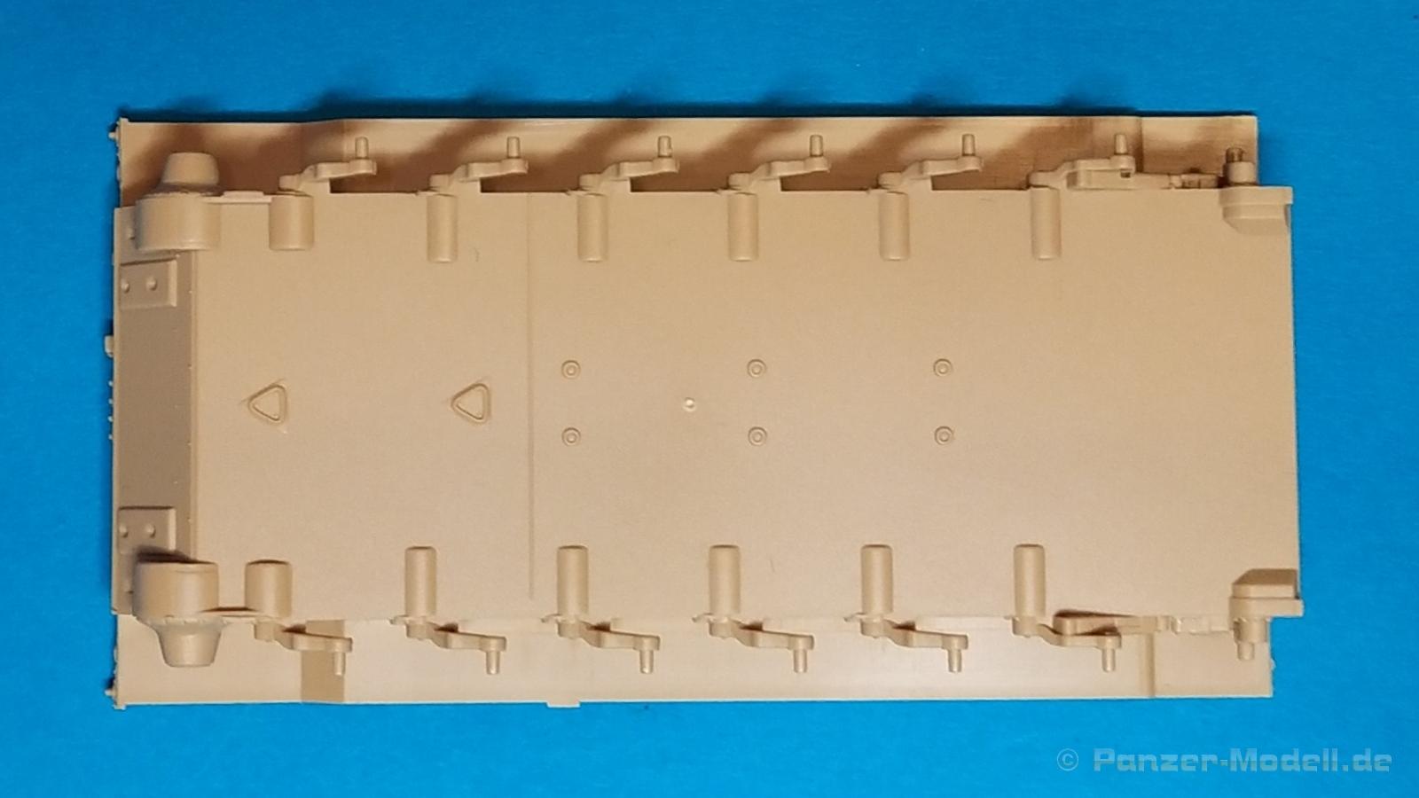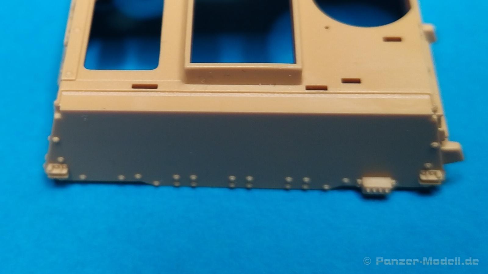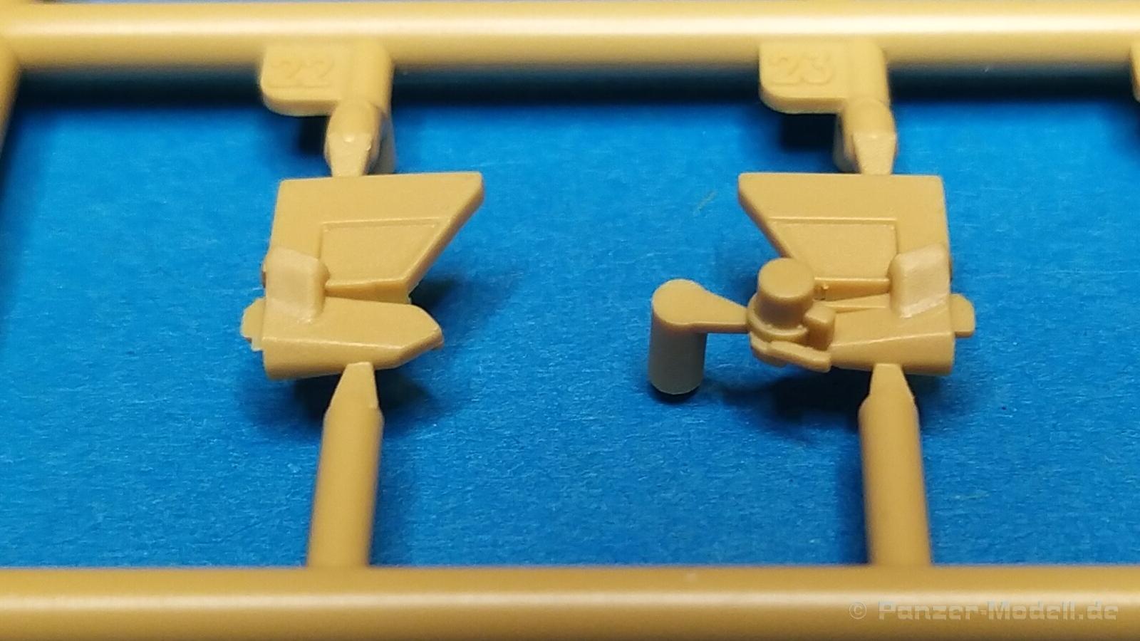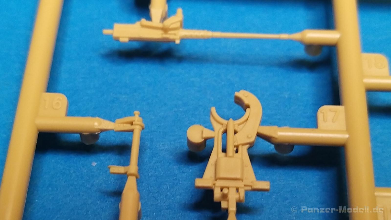 Auf den ersten Blick überzeugen die Detailierung und Gravierung der einzelnen Bauteile. Die Aufteilung der Spritzlinge und die Angüsse sind sinnvoll gewählt, so dass man die Teile gut finden und auch leicht abtrennen kann. Auswerfermarken gibt es nur an später nicht sichtbaren Stellen, wie z.B. im Bereich der Innenseite der Kettensegmente. Diese müssten aber von den Laufrollen verdeckt werden. Kleine Grate / Fischhäute sind hier und da an den Endverbindern der Ketten zu finden. Mit einem scharfen Skalpell dürfte aber auch hier schnell Abhilfe geschaffen werden. Der Einsatz von Fotoätzteilen ist bei diesem Bausatz nur auf das nötigste bzw. sinnvollste beschränkt. Sie sind allerdings nicht optional zu Plastikteilen zu verwenden, sondern werden immer zum Bau benötigt. Unter anderem gilt es hier die Schmutzfänger und seitlichen Schürzen an der Wanne, sowie das Gittermaterial für die seitlichen Staukörbe am Turm aus diesem Material zu verarbeiten. Das dürfte aber nicht schwierig werden, da dazu nichts gebogen, sondern alle Teile plan angebracht werden müssen. Zu den an sich schon guten Spritzgussteilen des Rohres und der Mündungsbremse gibt es als Alternativteile ein gedrehtes Alurohr und ein 3D Druckteil. Auch zwei Wasserkanister sind noch als Ergänzung im 3D-Druck vorhanden. Vorab sei zu der Bauanleitung angemerkt, dass sich ein Fehler in der Übersicht der Spritzlinge eingeschlichen hat. In den jeweiligen Baustufen ist dies aber wieder korrekt, so dass man die Teile finden kann. In der kleinen, aber übersichtlichen Bauanleitung finden sich Hinweise in englischer und chinesischer Sprache. Auf der ersten Seite findet man eine Übersicht der Bausatzbestandteile, gefolgt von allgemeinen Arbeits- und Sicherheitshinweisen. Nun folgt die eigentliche Bauanleitung, die sich in 20 Baustufen gliedert. Hier wird pro Baustufe anhand von schwarz-weißen 3D-Zeichnungen Schritt für Schritt der Weg zum fertigen Modell dargestellt bzw. erklärt. Den Anfang macht die Montage der Laufrollen, Treibräder und Spannrollen, die dann in Baustufe 2 an der Unterwanne angebracht werden sollen. Dazu sind die Schwingarme bereit mit angegossen, was eine korrekte Ausrichtung erleichtert. In Baustufe 3 werden die Segment- bzw. Einzelkettenglieder angebracht. Hier wurde erfreulicherweise auch an den Kettendurchhang im oberen Bereich gedacht und dieses in einem durchgehenden Segment berücksichtigt. Die Baustufen 4 bis 6 widmen sich der weiteren Montage der Wanne. Hier kann man z.B. wählen ob man die Rohrzurrung aufgerichtet oder abgeklappt anbringen möchte, genauso wie die Position des „Fahrererkers“. Die Fahrerluke kann man erfreulicherweise auch offen oder geschlossen anbringen. In Baustufe 7 muss man sich für eine von zwei möglichen Waffenstationen bzw. Lafettierungen des Kommandanten-MG´s entscheiden. Dazu sind auch verschiedene Vorbereitungen an der Turmoberseite zu treffen. Die eigentliche Montage des Turms beginnt in Baustufe 8 und zieht sich nach diversen Anbauten bis Baustufe 15. Wenn man beim Bau des Rohrlagers vorsichtig mit Klebstoff umgeht bleibt das Rohr später in der Höhe beweglich. Auch die Kommandantenluke kann hier offen oder geschlossen angebracht werden. Dann wird in Baustufe 16 wieder auf die Wanne umgeschwenkt. Dort gilt es die Wannenrückseite mit der offen oder geschlossenen darstellbaren Zugangstür weiter zu detaillieren und Heißösen und Schürzen zu montieren. Baustufe 18 befasst sich mit dem Bau der seitlichen Turmstaukörbe und deren Anbringung in Baustufe 19. Hier kann man sich für eine von zwei Optionen entscheiden. Die letzte Baustufe zeigt das Anbringen des zuvor fertig gestellten Turmes auf der fertigen Wanne. Am Ende der Bauanleitung finden sich dann die Bemalungs- und Markierungsvorschläge, die leider nicht farbig ausgeführt sind. Außerdem sind hier Farbangaben in tabellarischer Form für die Hersteller GSI, Tamiya und Vallejo aufgeführt. Folgende Markierungs- bzw. Bemalungsvarianten werden gezeigt: