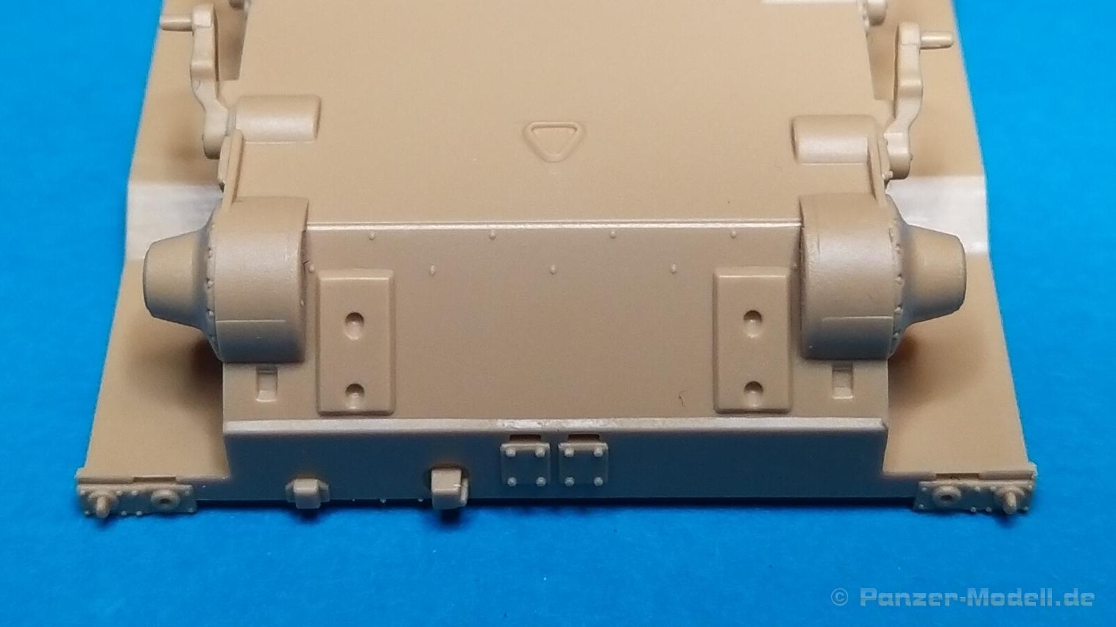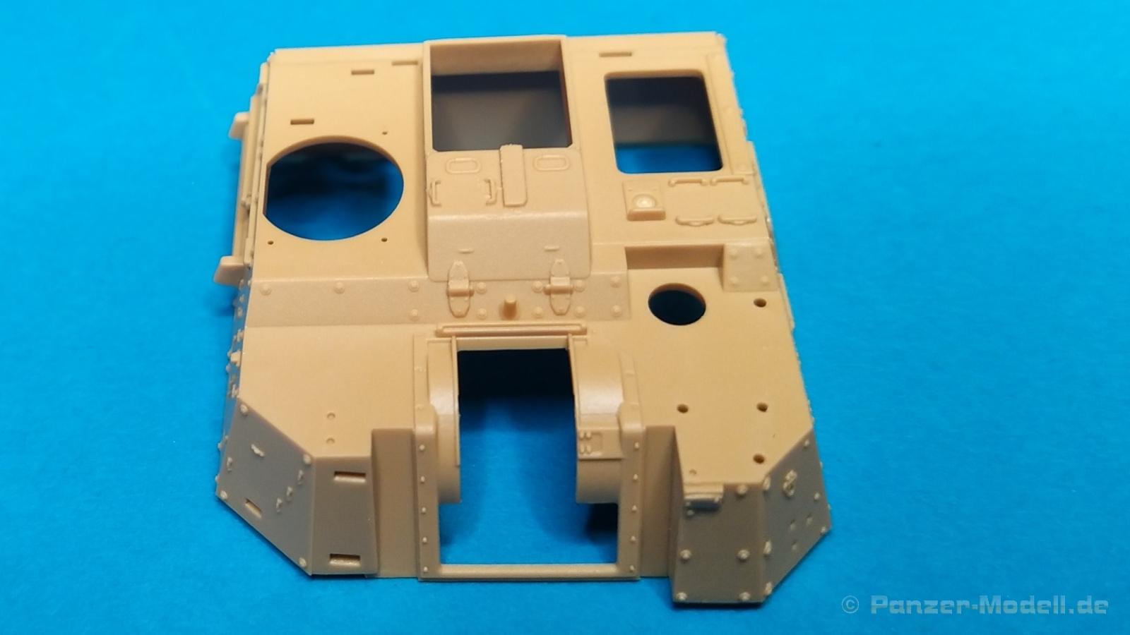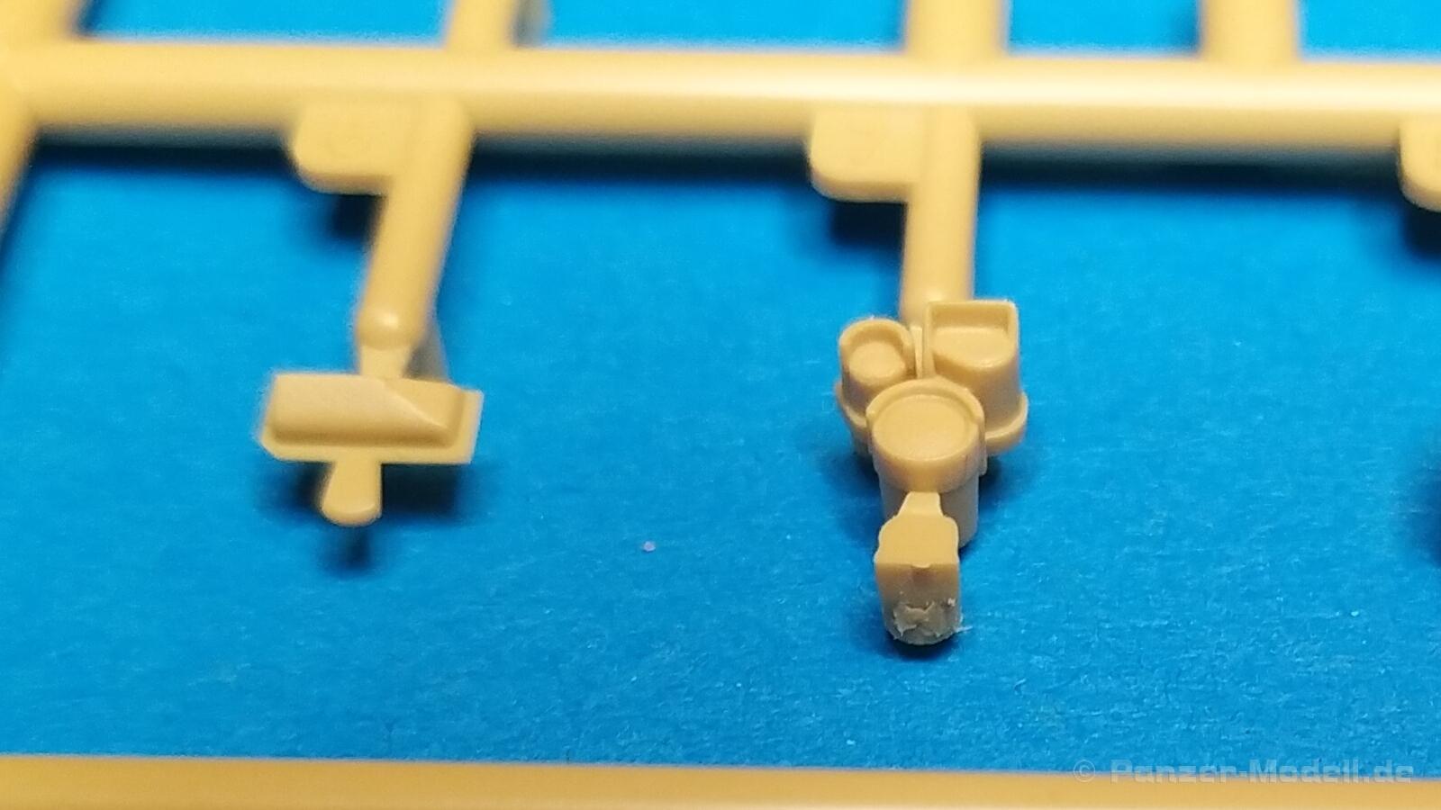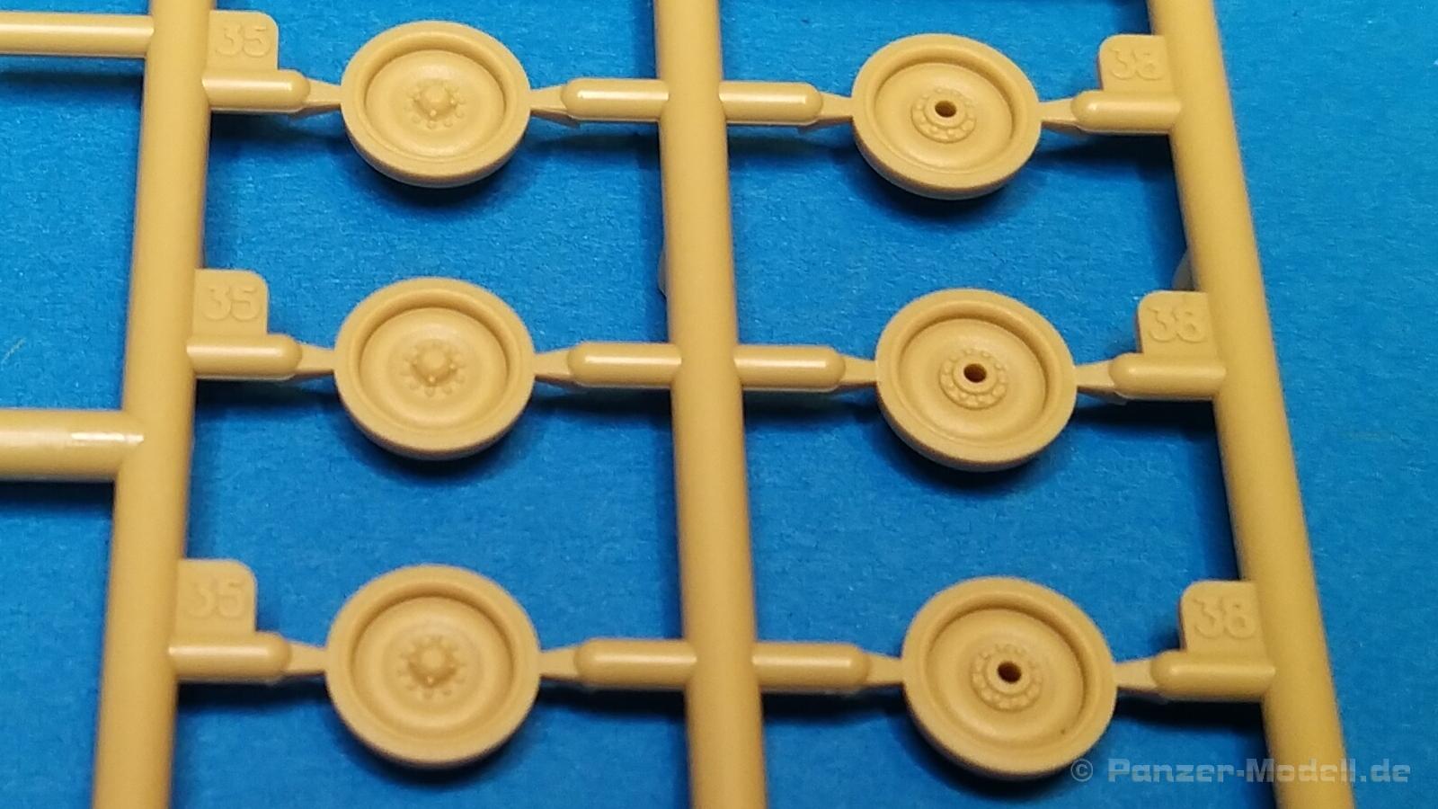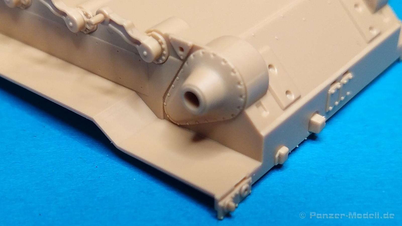 Auf den ersten Blick überzeugen die Detailierung und Gravierung der einzelnen Bauteile. Die Aufteilung der Spritzlinge und die Angüsse sind sinnvoll gewählt, so dass man die Teile gut finden und auch leicht abtrennen kann. Auswerfermarken gibt es nur an später nicht sichtbaren Stellen, wie z.B. im Bereich der Innenseite der Kettensegmente. Diese müssten aber von den Laufrollen verdeckt werden. Kleine Grate / Fischhäute sind hier und da an den Endverbindern der Ketten zu finden. Mit einem scharfen Skalpell dürfte aber auch hier schnell Abhilfe geschaffen werden. Der Einsatz von Fotoätzteilen ist bei diesem Bausatz nur auf das nötigste bzw. sinnvollste beschränkt. Sie sind allerdings nicht optional zu Plastikteilen zu verwenden, sondern werden immer zum Bau benötigt. Unter anderem gilt es hier die Schmutzfänger und seitlichen Schürzen an der Wanne, sowie das Gittermaterial für die seitlichen Staukörbe am Turm aus diesem Material zu verarbeiten. Das dürfte aber nicht schwierig werden, da dazu nichts gebogen, sondern alle Teile plan angebracht werden müssen. Zu den an sich schon guten Spritzgussteilen des Rohres und der Mündungsbremse gibt es als Alternativteile ein gedrehtes Alurohr und ein 3D Druckteil. Auch zwei Wasserkanister sind noch als Ergänzung im 3D-Druck vorhanden. Vorab sei zu der Bauanleitung angemerkt, dass sich ein Fehler in der Übersicht der Spritzlinge eingeschlichen hat. In den jeweiligen Baustufen ist dies aber wieder korrekt, so dass man die Teile finden kann. In der kleinen, aber übersichtlichen Bauanleitung finden sich Hinweise in englischer und chinesischer Sprache. Auf der ersten Seite findet man eine Übersicht der Bausatzbestandteile, gefolgt von allgemeinen Arbeits- und Sicherheitshinweisen. Nun folgt die eigentliche Bauanleitung, die sich in 20 Baustufen gliedert. Hier wird pro Baustufe anhand von schwarz-weißen 3D-Zeichnungen Schritt für Schritt der Weg zum fertigen Modell dargestellt bzw. erklärt. Den Anfang macht die Montage der Laufrollen, Treibräder und Spannrollen, die dann in Baustufe 2 an der Unterwanne angebracht werden sollen. Dazu sind die Schwingarme bereit mit angegossen, was eine korrekte Ausrichtung erleichtert. In Baustufe 3 werden die Segment- bzw. Einzelkettenglieder angebracht. Hier wurde erfreulicherweise auch an den Kettendurchhang im oberen Bereich gedacht und dieses in einem durchgehenden Segment berücksichtigt. Die Baustufen 4 bis 6 widmen sich der weiteren Montage der Wanne. Hier kann man z.B. wählen ob man die Rohrzurrung aufgerichtet oder abgeklappt anbringen möchte, genauso wie die Position des „Fahrererkers“. Die Fahrerluke kann man erfreulicherweise auch offen oder geschlossen anbringen. In Baustufe 7 muss man sich für eine von zwei möglichen Waffenstationen bzw. Lafettierungen des Kommandanten-MG´s entscheiden. Dazu sind auch verschiedene Vorbereitungen an der Turmoberseite zu treffen. Die eigentliche Montage des Turms beginnt in Baustufe 8 und zieht sich nach diversen Anbauten bis Baustufe 15. Wenn man beim Bau des Rohrlagers vorsichtig mit Klebstoff umgeht bleibt das Rohr später in der Höhe beweglich. Auch die Kommandantenluke kann hier offen oder geschlossen angebracht werden. Dann wird in Baustufe 16 wieder auf die Wanne umgeschwenkt. Dort gilt es die Wannenrückseite mit der offen oder geschlossenen darstellbaren Zugangstür weiter zu detaillieren und Heißösen und Schürzen zu montieren. Baustufe 18 befasst sich mit dem Bau der seitlichen Turmstaukörbe und deren Anbringung in Baustufe 19. Hier kann man sich für eine von zwei Optionen entscheiden. Die letzte Baustufe zeigt das Anbringen des zuvor fertig gestellten Turmes auf der fertigen Wanne. Am Ende der Bauanleitung finden sich dann die Bemalungs- und Markierungsvorschläge, die leider nicht farbig ausgeführt sind. Außerdem sind hier Farbangaben in tabellarischer Form für die Hersteller GSI, Tamiya und Vallejo aufgeführt. Folgende Markierungs- bzw. Bemalungsvarianten werden gezeigt: