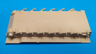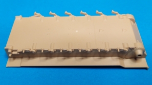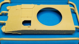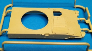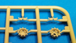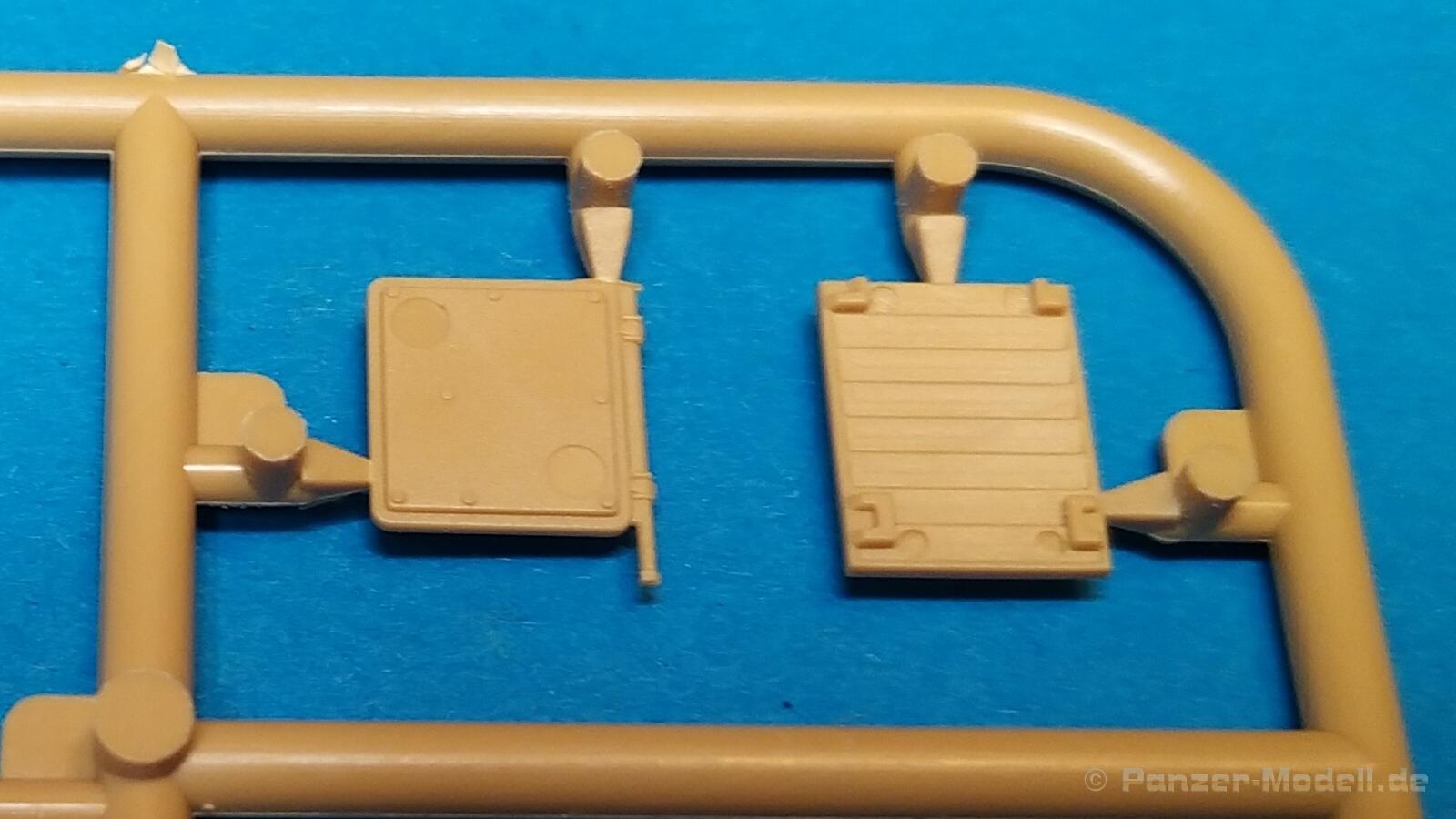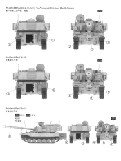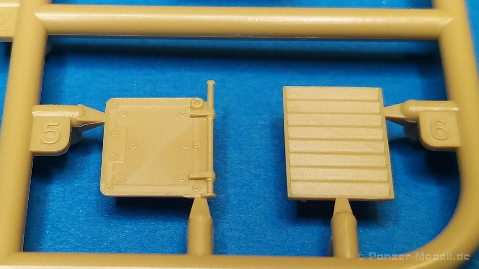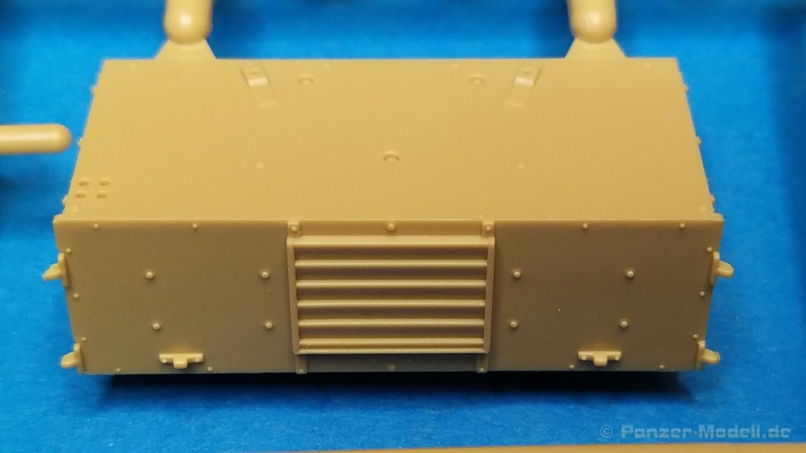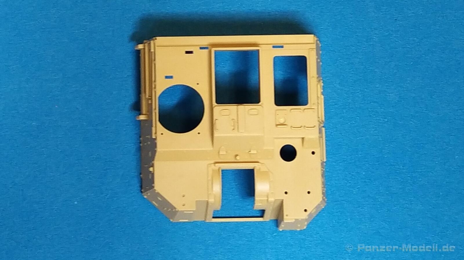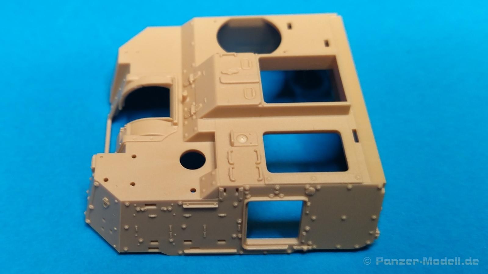 Auf den ersten Blick überzeugen die Detailierung und Gravierung der einzelnen Bauteile. Die Aufteilung der Spritzlinge und die Angüsse sind sinnvoll gewählt, so dass man die Teile gut finden und auch leicht abtrennen kann. Auswerfermarken gibt es nur an später nicht sichtbaren Stellen, wie z.B. im Bereich der Innenseite der Kettensegmente. Diese müssten aber von den Laufrollen verdeckt werden. Kleine Grate / Fischhäute sind hier und da an den Endverbindern der Ketten zu finden. Mit einem scharfen Skalpell dürfte aber auch hier schnell Abhilfe geschaffen werden. Der Einsatz von Fotoätzteilen ist bei diesem Bausatz nur auf das nötigste bzw. sinnvollste beschränkt. Sie sind allerdings nicht optional zu Plastikteilen zu verwenden, sondern werden immer zum Bau benötigt. Unter anderem gilt es hier die Schmutzfänger und seitlichen Schürzen an der Wanne, sowie das Gittermaterial für die seitlichen Staukörbe am Turm aus diesem Material zu verarbeiten. Das dürfte aber nicht schwierig werden, da dazu nichts gebogen, sondern alle Teile plan angebracht werden müssen. Zu den an sich schon guten Spritzgussteilen des Rohres und der Mündungsbremse gibt es als Alternativteile ein gedrehtes Alurohr und ein 3D Druckteil. Auch zwei Wasserkanister sind noch als Ergänzung im 3D-Druck vorhanden. Vorab sei zu der Bauanleitung angemerkt, dass sich ein Fehler in der Übersicht der Spritzlinge eingeschlichen hat. In den jeweiligen Baustufen ist dies aber wieder korrekt, so dass man die Teile finden kann. In der kleinen, aber übersichtlichen Bauanleitung finden sich Hinweise in englischer und chinesischer Sprache. Auf der ersten Seite findet man eine Übersicht der Bausatzbestandteile, gefolgt von allgemeinen Arbeits- und Sicherheitshinweisen. Nun folgt die eigentliche Bauanleitung, die sich in 20 Baustufen gliedert. Hier wird pro Baustufe anhand von schwarz-weißen 3D-Zeichnungen Schritt für Schritt der Weg zum fertigen Modell dargestellt bzw. erklärt. Den Anfang macht die Montage der Laufrollen, Treibräder und Spannrollen, die dann in Baustufe 2 an der Unterwanne angebracht werden sollen. Dazu sind die Schwingarme bereit mit angegossen, was eine korrekte Ausrichtung erleichtert. In Baustufe 3 werden die Segment- bzw. Einzelkettenglieder angebracht. Hier wurde erfreulicherweise auch an den Kettendurchhang im oberen Bereich gedacht und dieses in einem durchgehenden Segment berücksichtigt. Die Baustufen 4 bis 6 widmen sich der weiteren Montage der Wanne. Hier kann man z.B. wählen ob man die Rohrzurrung aufgerichtet oder abgeklappt anbringen möchte, genauso wie die Position des „Fahrererkers“. Die Fahrerluke kann man erfreulicherweise auch offen oder geschlossen anbringen. In Baustufe 7 muss man sich für eine von zwei möglichen Waffenstationen bzw. Lafettierungen des Kommandanten-MG´s entscheiden. Dazu sind auch verschiedene Vorbereitungen an der Turmoberseite zu treffen. Die eigentliche Montage des Turms beginnt in Baustufe 8 und zieht sich nach diversen Anbauten bis Baustufe 15. Wenn man beim Bau des Rohrlagers vorsichtig mit Klebstoff umgeht bleibt das Rohr später in der Höhe beweglich. Auch die Kommandantenluke kann hier offen oder geschlossen angebracht werden. Dann wird in Baustufe 16 wieder auf die Wanne umgeschwenkt. Dort gilt es die Wannenrückseite mit der offen oder geschlossenen darstellbaren Zugangstür weiter zu detaillieren und Heißösen und Schürzen zu montieren. Baustufe 18 befasst sich mit dem Bau der seitlichen Turmstaukörbe und deren Anbringung in Baustufe 19. Hier kann man sich für eine von zwei Optionen entscheiden. Die letzte Baustufe zeigt das Anbringen des zuvor fertig gestellten Turmes auf der fertigen Wanne. Am Ende der Bauanleitung finden sich dann die Bemalungs- und Markierungsvorschläge, die leider nicht farbig ausgeführt sind. Außerdem sind hier Farbangaben in tabellarischer Form für die Hersteller GSI, Tamiya und Vallejo aufgeführt. Folgende Markierungs- bzw. Bemalungsvarianten werden gezeigt: