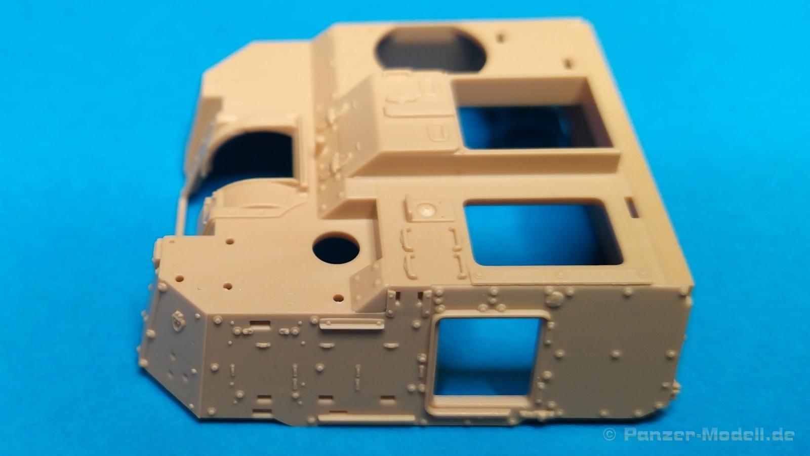 M109 A7 Paladin Self-Propelled Howitzer Der Hersteller Foreart (vormals Fore Hobby) bringt mit der Bausatz-Nr. 2002 die „M109 A7 Paladin Self-Propelled Howitzer“ im Maßstab 1:72 auf den Markt. Dieses ist der zweite Fahrzeugbausatz des Herstellers der mit Schiffsmodellen in Erscheinung trat und als ersten Fahrzeugbausatz den Scimitar MK 2 (CVR(T) (Bausatz-Nr. 2001) im gleichen Maßstab herausbrachte. Hier haben wir nun einen Bausatz des zurzeit modernsten Artilleriegeschützes der US-Streitkräfte. Wurden schon beim Vorgängermodell der M109 A6 viele Änderungen zum Ursprungsentwurf vorgenommen, so sind diese bei der M109 A7 noch drastischer ausgefallen und das Fahrzeug hat augenscheinlich nicht mehr viele Gemeinsamkeiten mit der Ursprungsversion. Die Entwicklung der M109 A7 begann 2007 unter dem Namen „M109A6 Paladin Integrated Management (PIM)“. Ziel dieses Programms war es die bestehende Flotte an M109 A6 technisch und logistisch bis ins Jahr 2050 einsatzfähig zu halten. Dazu sollten Komponenten ausgetauscht, standardisiert, und neu entwickelt werden. Das Ergebnis des Projektes ist der Rüststand A7 bestehend aus dem modifizierten Turm der M109A6 Paladin, der auf eine komplett neu konstruierte Wanne samt Fahrgestell montiert wurde. Die neue, aus Aluminium geschweißte, Wanne beherbergt den aus dem M2/M3 Bradley bekannten 600 PS Motor gekoppelt mit einem Automatikgetriebe. Auch die Laufrollen, Federung und die Ketten stammen aus dem Bradley Programm. Für die elektrische Versorgung während des Standes sorgt nun ein so genanntes „Common Modular Power System (CMPS), das schon aus der Stryker Armored Vehicle und HMMWV-Serie bekannt ist. Im modifizierten M109A6 Turm sorgt eine elektrisch betriebene Ansetzvorrichtung für die Erhöhung der Feuergeschwindigkeit. Ebenso sind der Turmantrieb und die Waffenrichtanlage nun vollelektrisch. Weitere Änderungen für die vierköpfige Besatzung sind die eingerüstete Klimaanlage, eine Rückfahrkamera, ein hochentwickeltes Feuerleitsystem, eine fernlenkbare Waffenstation für das MG vor der Kommandantenkuppel und der Austausch der alten Beuteltreibladungen gegen Treibladungsmodule. So ausgestattet ist die M109 A7 nun auch dazu in der Lage satelliten- oder lasergesteuerte Munition wie die M982 Excalibur-Geschosse zu verwenden. Nun aber zum eigentlichen vorliegenden Modell. Ein Blick in den Stülpkarton (28 x 19 x 5cm) offenbart den folgenden Inhalt: