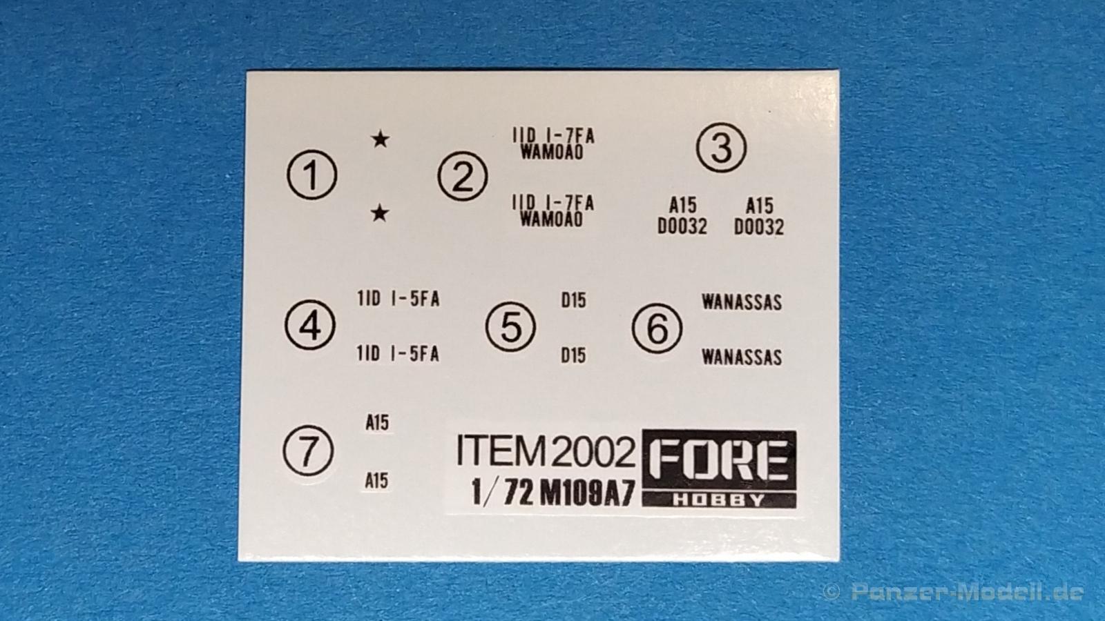 Die Bezeichnungen in den dargestellten Markierungs- und Bemalungsvarianten sind auf den ersten Blick leider nichtssagend (Unidentified Unit?) und auf den zweiten Blick sogar falsch bzw. passt die Angabe nicht zu den Bumpercodes auf dem abgebildeten Fahrzeug. Ich habe die drei Markierungsvarianten deshalb anhand der Bumpercodes ermittelt. Die dem Bausatz beiliegenden Nassschiebebilder (Decals) kommen auf einem hellblauen Trägerpapier daher, worauf man gut die einzelnen Elemente finden kann. Augenscheinlich fällt kein Versatz beim Druck auf. Mein Fazit: Foreart präsentiert uns hier ein hochaktuelles Artilleriegeschütz, was es nach meinem Kenntnisstand bislang noch nicht im Spritzguss gab. Die Qualität der Spritzgussteile, Fotoätzteilen, die Alternativteile als 3D-Druck und das gedrehte Alurohr sprechen für sich. Leichte Abstriche gibt es für die Markierungsvariantenbeschreibung und den Fehler in der Spritzlingsübersicht. Vielleicht war das aber nur bei diesem Vorabexemplar der Fall und wird bei der Serienproduktion abgestellt. Alles in allem ist der Bausatz für den Preis von 24,95 Euro eine Kaufempfehlung!