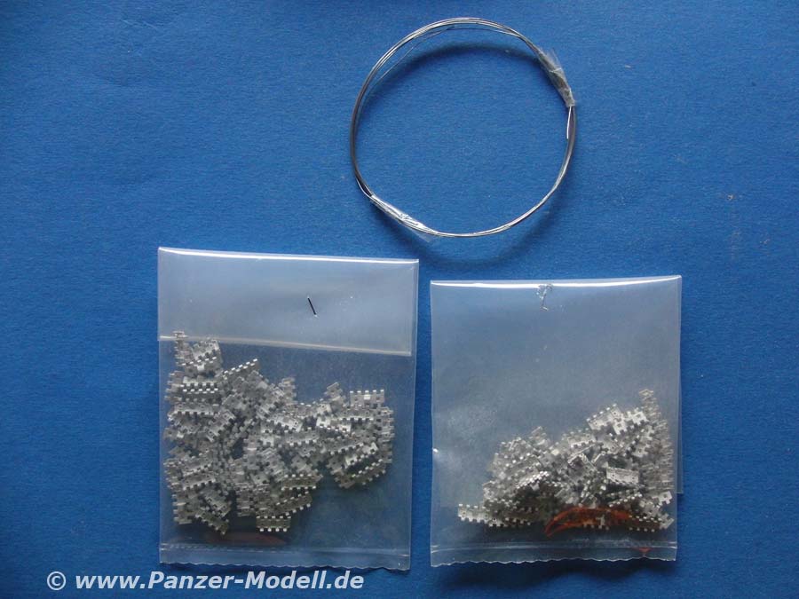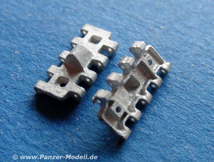 Die Ketten sind sehr sauber in Metall gegossen mit feiner Detaillierung und durchweg offenen Löchern für den Steckbolzen. Der Führungszahn ist wie am Original breit und gedrungen dargestellt.