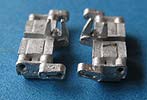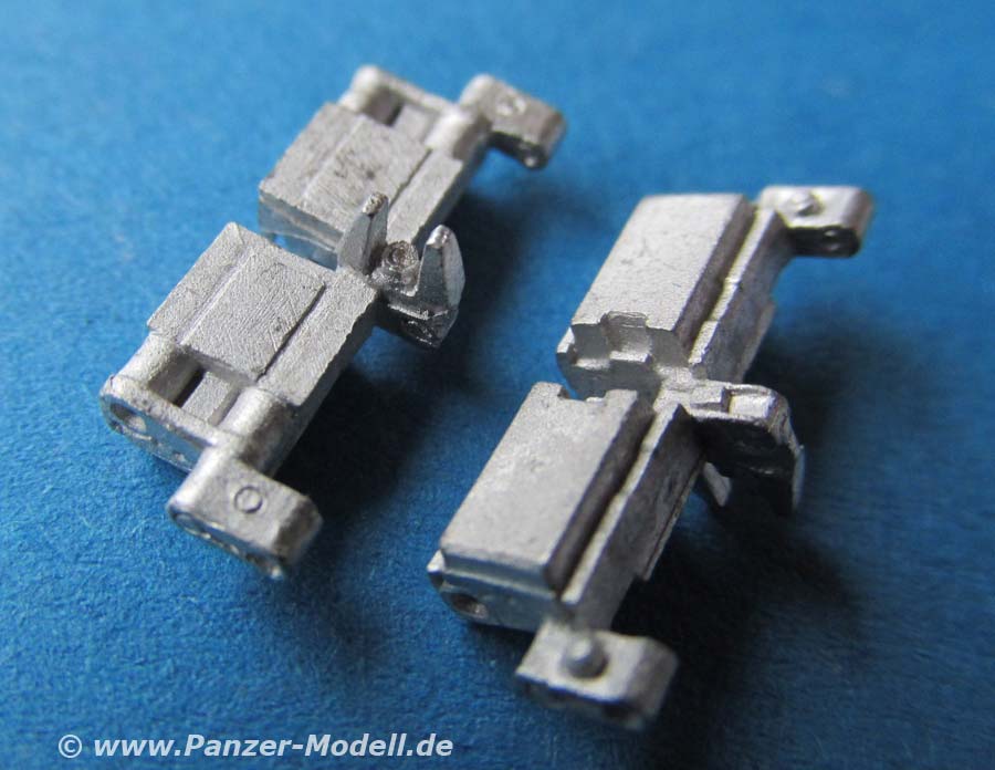 Die Ketten sind sehr sauber in Metall gegossen mit feiner Detaillierung und durchweg feinen Löchern für den Steckbolzen. Die Gummi Inlays der inneren Laufflächen sind schön bündig eingelassen dargestellt. Die Kettenführungszähne sind sehr schön dargestellt ind er typischen Form der Leo 1 Ketten.