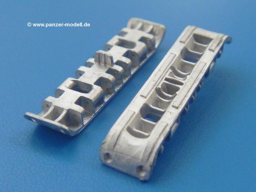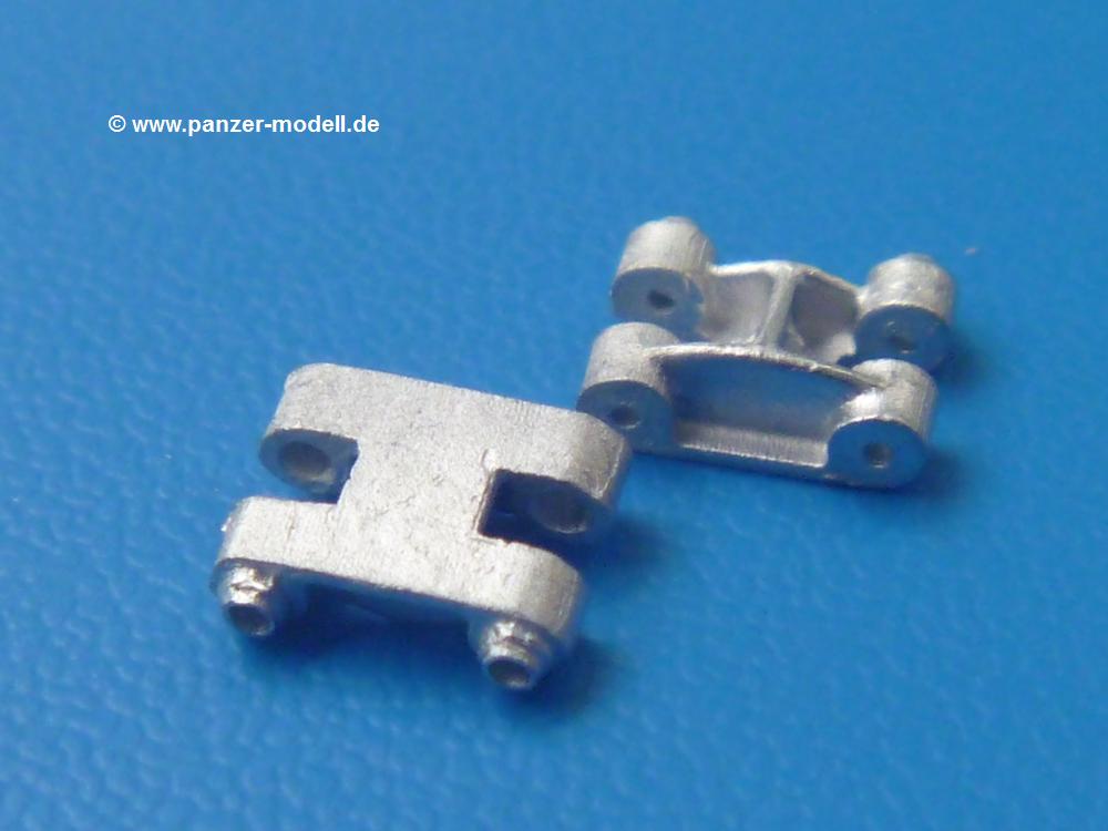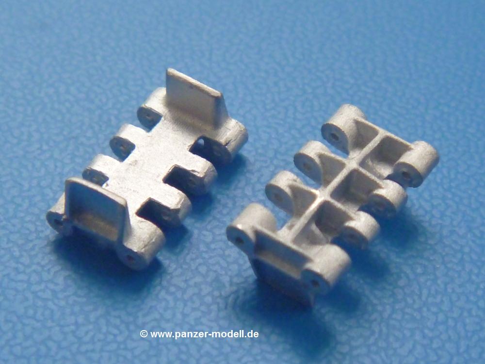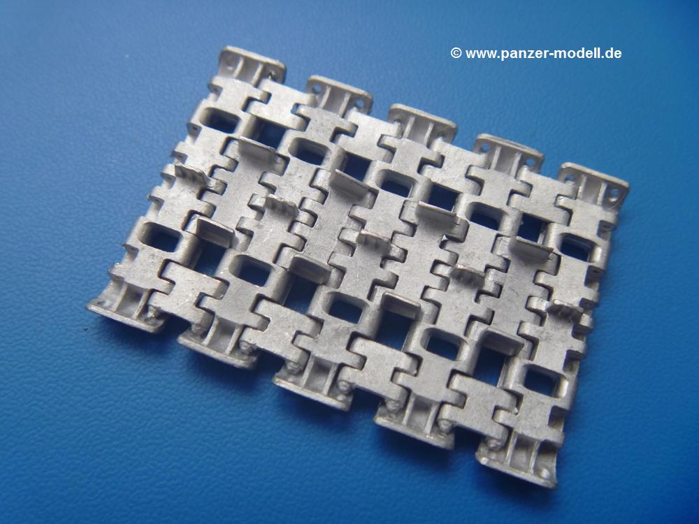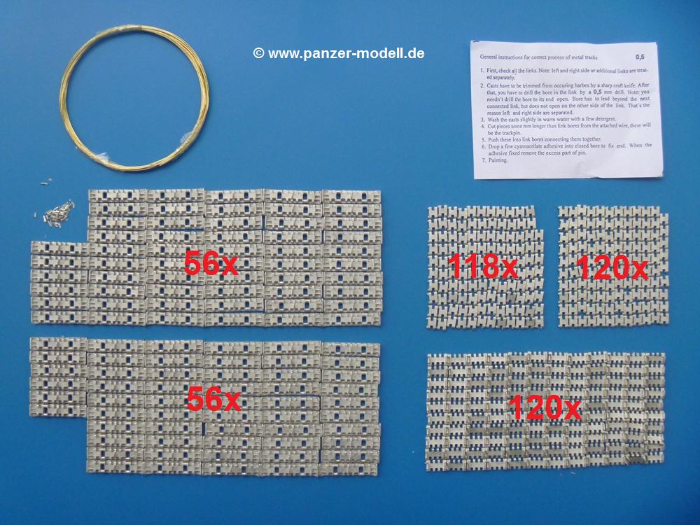 Laut Hersteller sind 440 Glieder in 5 separaten Tüten im stabilen Karton enthalten. Ich habe insgesamt 460 (112 Hauptglieder, 120 Mittelglieder, 118 Außenglieder, 120 Innenglieder (auf dem Übersichtsfoto sind nur 119, weil sich eins in der Tüte verfangen hatte) gefunden. Dazu kommt eine ordentliche Menge an Draht für die Darstellung der Kettenbolzen. Wie bei Friulmodel üblich schneidet man den Draht auf die passende Länge zurecht, führt ihn in die Bolzenlöcher ein, bis er am Ende des Außengliedes anstößt. Dann fixiert man das offene Ende z.B. mit Sekundenkleber. Laut Aussage vom Hersteller hat man die Maße für die Kette an der noch existierenden Maus im Panzermuseum Kubinka (Rußland) abgenommen. Ich setze voraus, dass dies korrekt umgesetzt wurde. Die Details sind jedenfalls superscharf. An einigen Gliedern waren Gussreste zu finden, die sich aber bereits mit den Fingern lösen liessen. Gemäß Anleitung soll man die Löcher für die Kettenbolzen mit einem 0,5 mm Bohrer aufbohren, aber die Probeglieder konnte man auch so problemlos zusammenfügen.Im Vergleich zu anderen Maus Ketten ist der Preis heiß. Bei Ausstellungen direkt ab Friulmodel EUR 28,00 (!), laut Friulmodel-Katalog EUR 35,00. Eine tolle Kette zu einem mehr als fairen Preis!