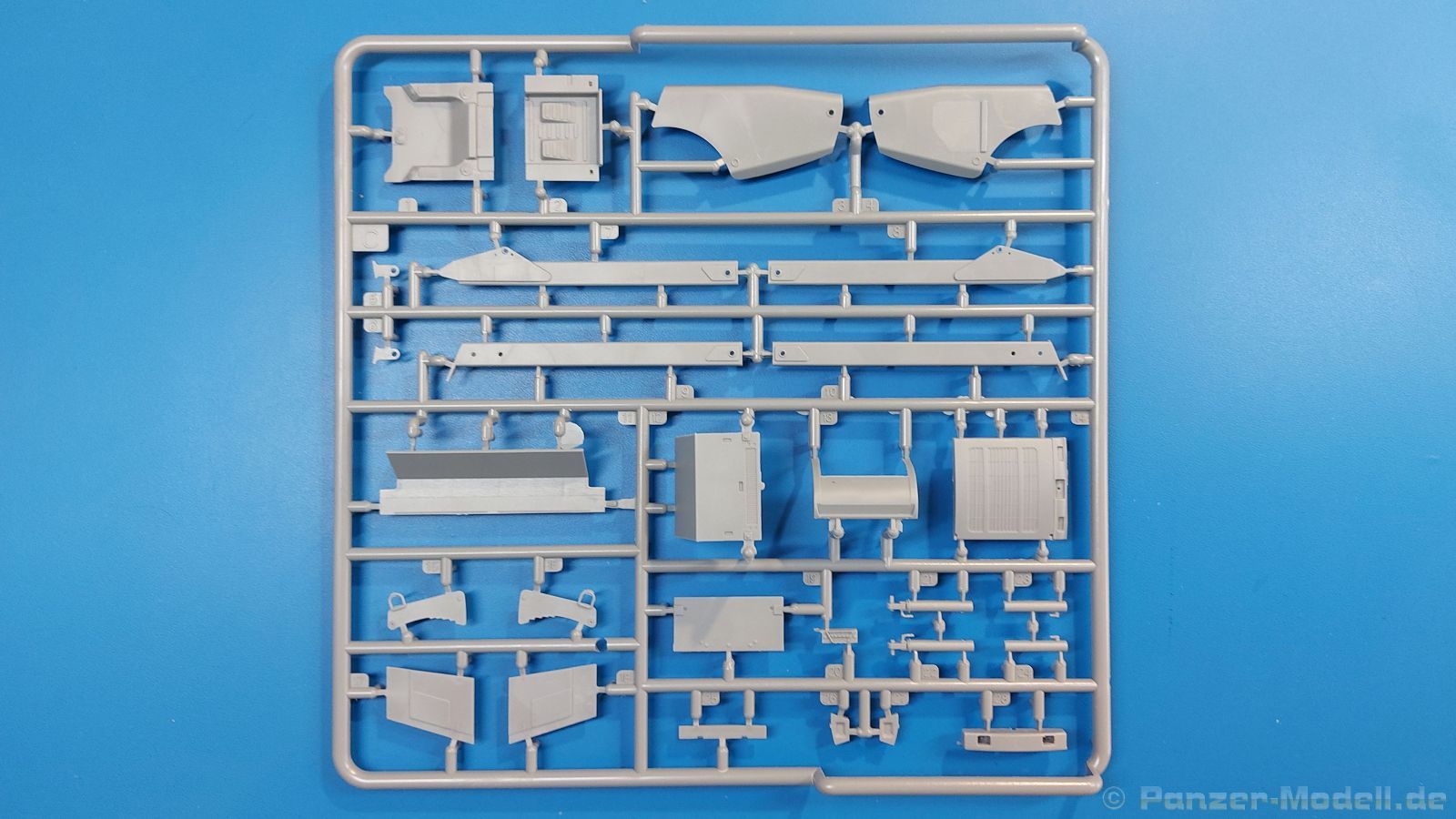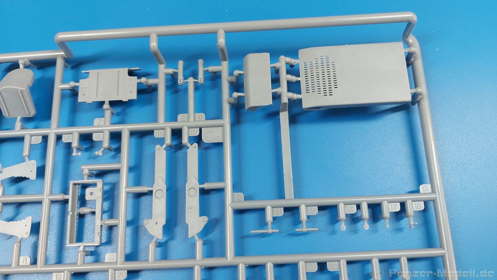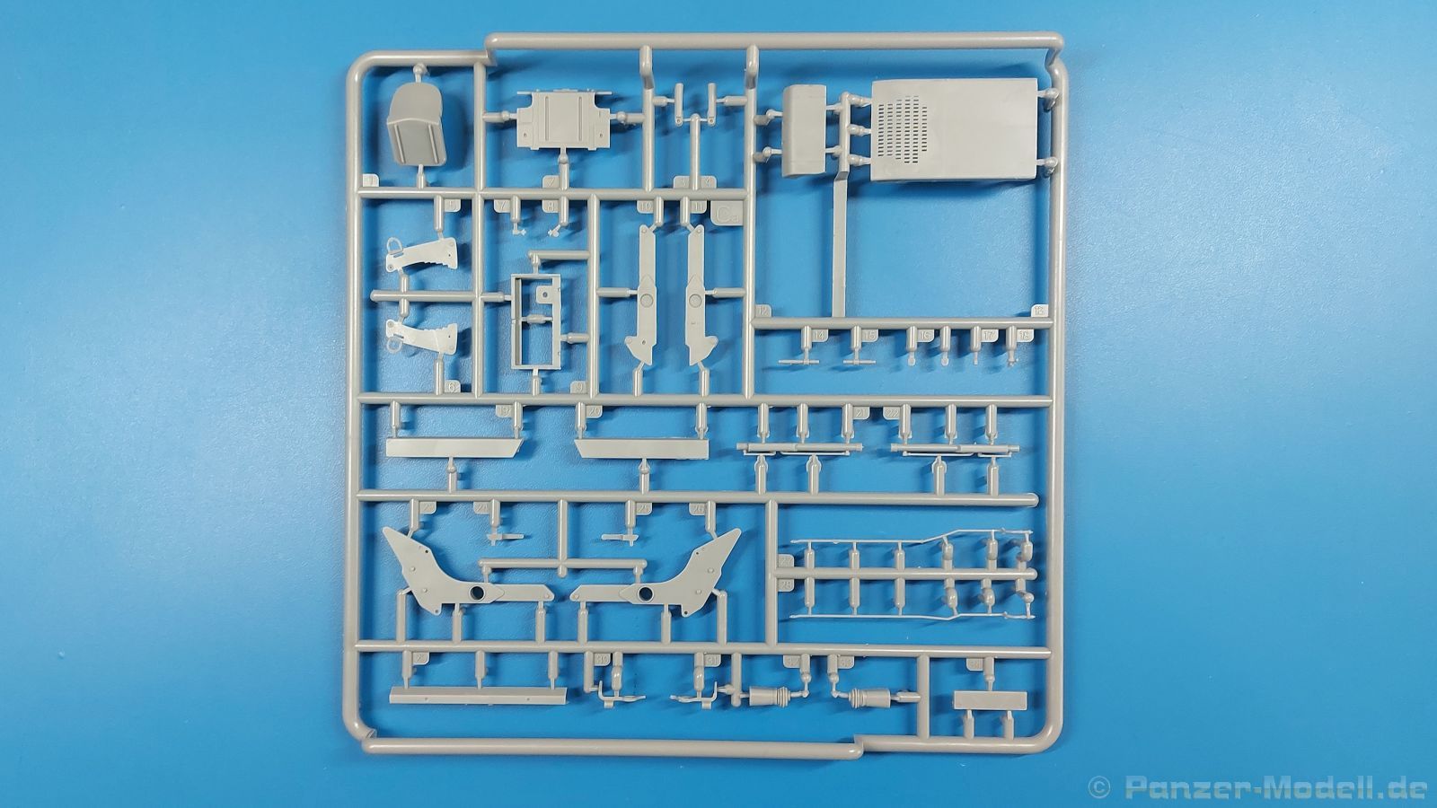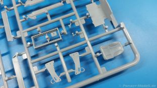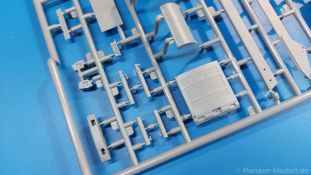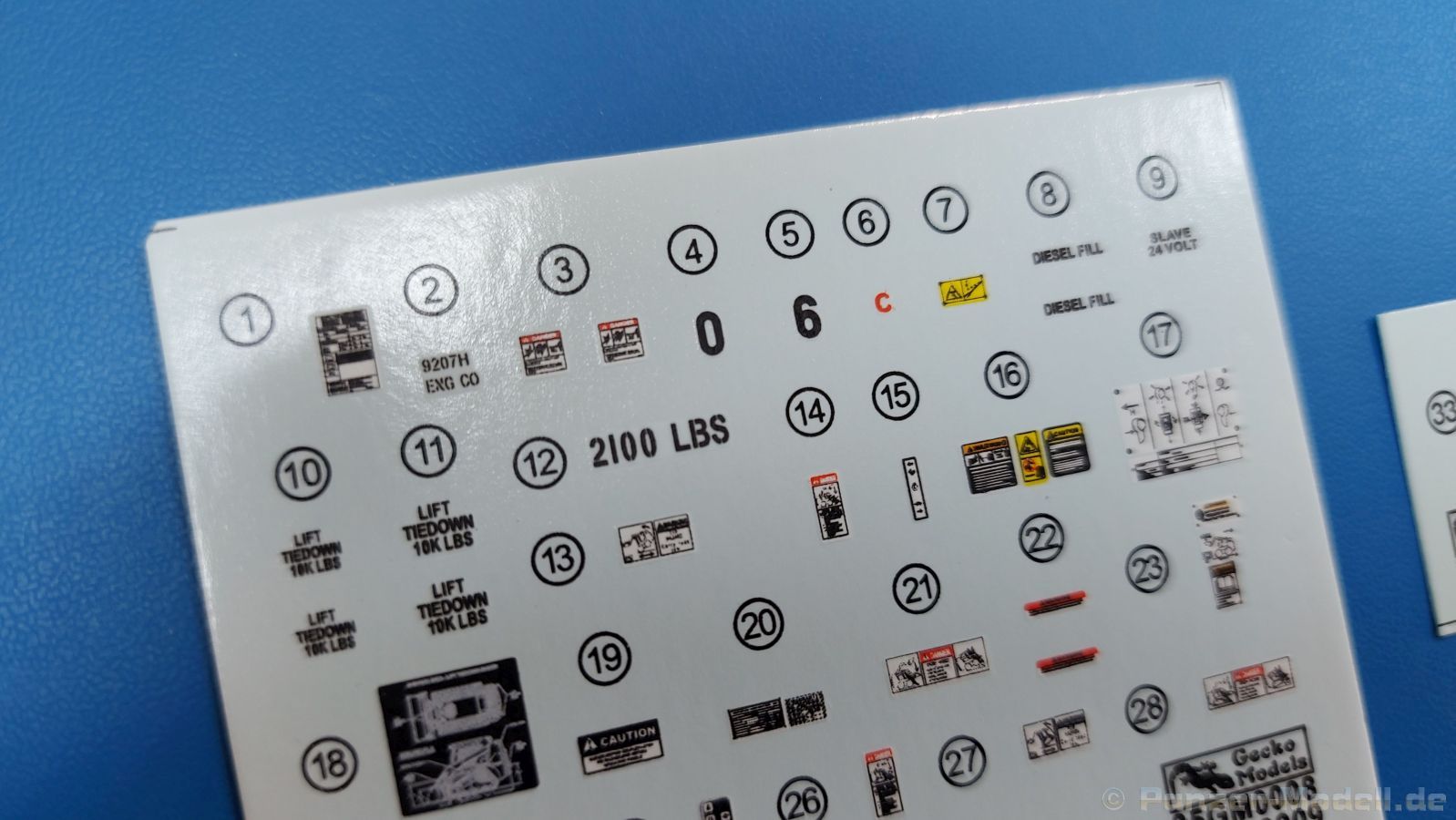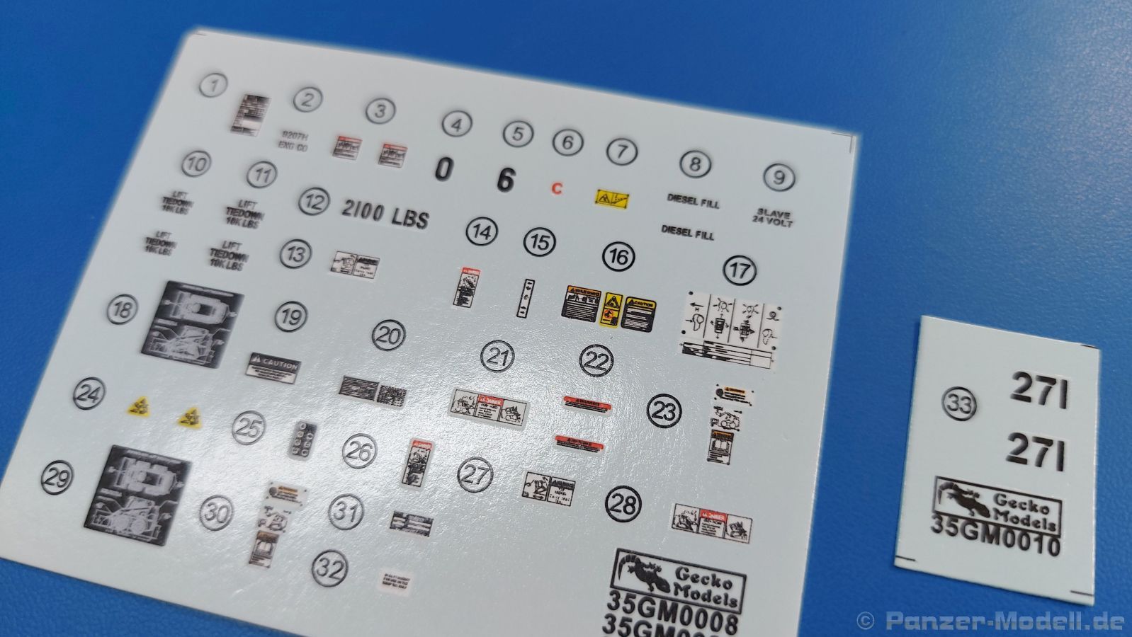 Der Bausatz: Wenn Gecko Models einen Bausatz rausbringt, der auch im Original Versionen vorweist, kann man damit rechnen, dass nach dem ersten Modell nicht Schluss ist. So kann man möglichst großen Nutzen aus den vorhandenen Formen ziehen, Kosten sparen und den Modellbauern trotzdem was anderes zu einem annehmbaren Preis bieten. Sven hat sich bereits den Kompakt-Radlader US Army Light Type III Skid Steer Loader (M400W) angeschaut. Heute zeige ich Euch die Raupenversion davon. Im 330 x 190 x 90 mm großen, stabilen Klappdeckelkarton mit farbigem Überkarton befinden sich 8 hellgraue, 1 Klarsichtspritzling, 1 PE-Platine, kunststoffüberzogener Draht, 1 großes Decalblatt und ein zusätzliches, kleineres und natürlich die Bauanleitung. Die Spritzlinge sind einwandfrei, die Teile ohne Versatz oder Sinkstellen. Nach dem Zusammenbau eventuell sichtbare Auswerferspuren konnte ich jetzt nicht entdecken. Bei sehr feinen Teilen entdeckt man leichten Grat der Formtrennnaht, aber der ist leicht zu entfernen und mir persönlich ist es lieber, etwas zu entfernen als aufwendig auffüllen zu müssen. Die Klarsichtteile sind kristallklar, sowie kratzer- und schlierenfrei, was man bei den großen Scheiben nur begrüßen kann. Ein paar Fotoätzteile, grad für die Schutzgitter, heben das Niveau. Für die flexiblen Hydraulikleitungen gibt es einen kunststoffüberzogenen, feinen Draht, den man auch ohne weitere Bemalung verwenden kann. Die kleine Fahrerkabine wird ein echter Hingucker. Die Bedienhebel, teils aus Plastik, teils aus Fotoätzteilen (PE) sind sehr fein wiedergegeben. Das Verschlussstück eines Beckengurtes ist aus PE wird in die Halterung eingebaut und wird dann so aussehen, als könnte man den Gurt herausziehen. Ein nach oben wegklappbarer Schutzbügel mit angegossener Polsterung im Bauchbereich (wie in manchen Achterbahnen) kann sicherlich bei sparsamem Umgang mit Klebstoff beweglich angebaut werden. Sitznähte und Struktur der Faltenbälge der Joysticks sind sehr glaubhaft. Bedienknöpfe und Schalter der Armaturen sind deutlich wiedergegeben. Die Fenster und die große Einstiegstür sind glasklar. Die Einstiegstür kann meines Erachtens auch geöffnet angebaut werden. An der Tür werden noch Griffe und ein feiner Doppelarmscheibenwischer aus PE angebracht hat. Die Schutzgitter der Seitenfenster sind aus großen PEs, die dazu auch noch sehr schöne Sechskantschraubenköpfe vorzuweisen haben. Es gibt jede Menge Typschilder, Armaturenanzeigen und Warnhinweise, die mittels Nassschiebebildern angebracht werden. Das Schutzgitter im Dach ist bereits durchbrochen. Die Durchbrüche könnten ein klein wenig schärfer sein. Hier ggfs. ein klein wenig sehr vorsichtig nacharbeiten. Fahrscheinwerfergehäuse werden vorn ins Dach eingebaut. Die Scheinwerfergläser dazu zeigen die Riffelung im Glas wie beim Original. An das Hinterteil des Daches wird das Klimagerät angebaut. Das einzubauende Dachfutter hat bereits die Belüftungsklappen und Gitter eingegossen. Zwei Rückspiegel finden auch ihren Weg an die Dachunterseite. Das Motorgehäuse sollte den geringsten Aufwand beim Bau darstellen. Nur für das Gehäusegitter benötigt man PE-Origami-Fähigkeiten, da es in einem mehrfachen V-Muster gefaltet werden muss, damit es in die Aussparungen am Rahmen passt. Das Endstück des Auspuffs ist bereits schön tief geöffnet. Bei der Hydraulikanlage der Schaufelarme und der Schaufel selbst hat sich Gecko Models alle Mühe gegeben, nicht nur bei den Details, sondern auch der möglichen Beweglichkeit aller Teile. Dazu sind die Hydraulikzylinder in zwei Hälften geteilt, damit die Hydraulikstempel, die meist eine Verdickung am Ende haben, nicht mehr ganz herausrutschen können. Für die festen Hydraulikleitungen gibt es dünne, feine Teile aus Plastik, für die flexiblen liegt schwarzer Schlauch (mit einem Draht innen) bei. Für bessere Flexibilität ggfs. den Draht vorsichtig aus dem Schlauch herausziehen. Mit Draht drin lässt er sich aber besser formen. Die Schlauchanschlüsse kommen den Originalen sehr nahe, was sich allerdings auch auf die Größe bezieht und damit in dem Maßstab recht klein sind. Die Schaufel wird inkl. Schläuchen aus 23 Teilen zusammengesetzt. Von den Laufrollen sieht man zum Schluss nicht mehr viel, dennoch besteht jede der drei Laufrollendrillinge aus Innen-, Mittel- und Außenrad. Das Mittelrad läuft dann zwischen den zwei Zahnreihen der Ketten. Die Ketten für jede Seite sind in zwei Hälften geteilt und werden dann über Lauf-, Umlenk- und Antriebrädern zusammengeführt. Das Anbringen des Laufwerks am Gehäuse stellt dann auch den letzten Bauschritt dar. Die Bauanleitung bietet eine Markierungsoption an, ein Zusatzblatt eine zweite: