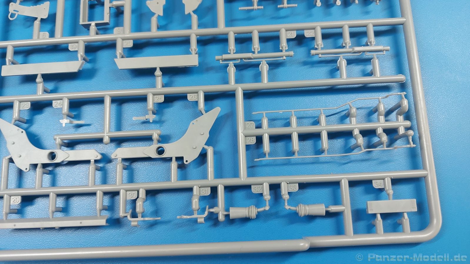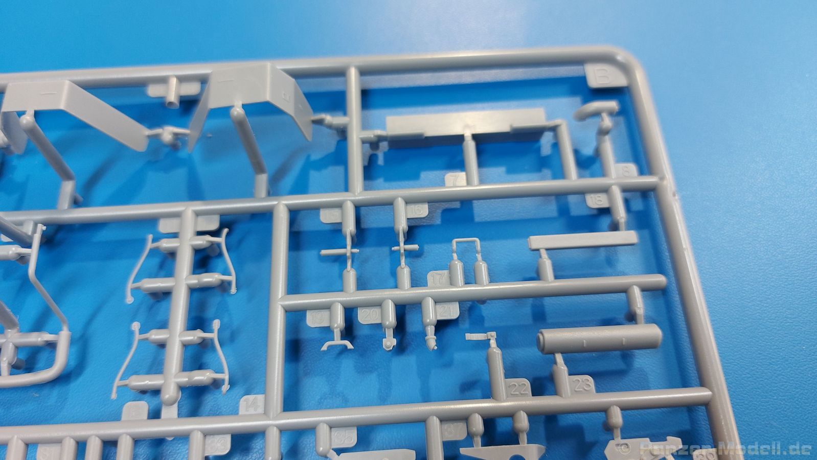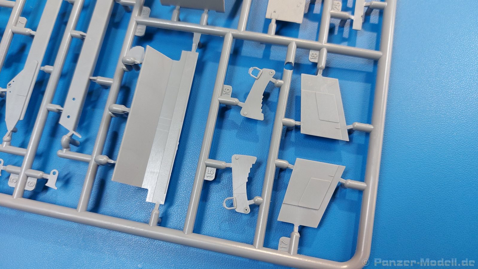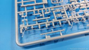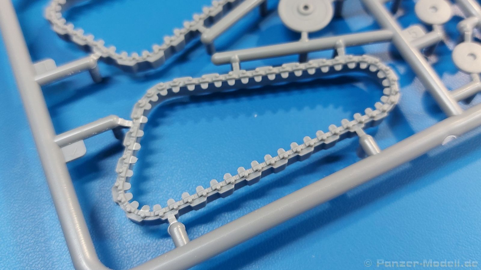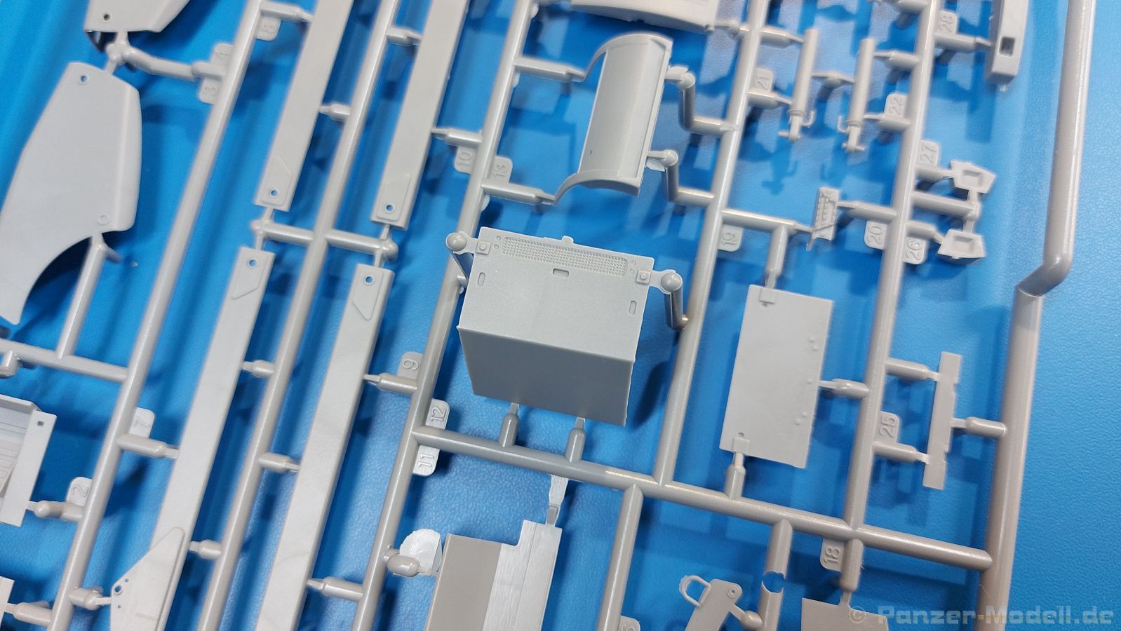 Der Bausatz: Wenn Gecko Models einen Bausatz rausbringt, der auch im Original Versionen vorweist, kann man damit rechnen, dass nach dem ersten Modell nicht Schluss ist. So kann man möglichst großen Nutzen aus den vorhandenen Formen ziehen, Kosten sparen und den Modellbauern trotzdem was anderes zu einem annehmbaren Preis bieten. Sven hat sich bereits den Kompakt-Radlader US Army Light Type III Skid Steer Loader (M400W) angeschaut. Heute zeige ich Euch die Raupenversion davon. Im 330 x 190 x 90 mm großen, stabilen Klappdeckelkarton mit farbigem Überkarton befinden sich 8 hellgraue, 1 Klarsichtspritzling, 1 PE-Platine, kunststoffüberzogener Draht, 1 großes Decalblatt und ein zusätzliches, kleineres und natürlich die Bauanleitung. Die Spritzlinge sind einwandfrei, die Teile ohne Versatz oder Sinkstellen. Nach dem Zusammenbau eventuell sichtbare Auswerferspuren konnte ich jetzt nicht entdecken. Bei sehr feinen Teilen entdeckt man leichten Grat der Formtrennnaht, aber der ist leicht zu entfernen und mir persönlich ist es lieber, etwas zu entfernen als aufwendig auffüllen zu müssen. Die Klarsichtteile sind kristallklar, sowie kratzer- und schlierenfrei, was man bei den großen Scheiben nur begrüßen kann. Ein paar Fotoätzteile, grad für die Schutzgitter, heben das Niveau. Für die flexiblen Hydraulikleitungen gibt es einen kunststoffüberzogenen, feinen Draht, den man auch ohne weitere Bemalung verwenden kann. Die kleine Fahrerkabine wird ein echter Hingucker. Die Bedienhebel, teils aus Plastik, teils aus Fotoätzteilen (PE) sind sehr fein wiedergegeben. Das Verschlussstück eines Beckengurtes ist aus PE wird in die Halterung eingebaut und wird dann so aussehen, als könnte man den Gurt herausziehen. Ein nach oben wegklappbarer Schutzbügel mit angegossener Polsterung im Bauchbereich (wie in manchen Achterbahnen) kann sicherlich bei sparsamem Umgang mit Klebstoff beweglich angebaut werden. Sitznähte und Struktur der Faltenbälge der Joysticks sind sehr glaubhaft. Bedienknöpfe und Schalter der Armaturen sind deutlich wiedergegeben. Die Fenster und die große Einstiegstür sind glasklar. Die Einstiegstür kann meines Erachtens auch geöffnet angebaut werden. An der Tür werden noch Griffe und ein feiner Doppelarmscheibenwischer aus PE angebracht hat. Die Schutzgitter der Seitenfenster sind aus großen PEs, die dazu auch noch sehr schöne Sechskantschraubenköpfe vorzuweisen haben. Es gibt jede Menge Typschilder, Armaturenanzeigen und Warnhinweise, die mittels Nassschiebebildern angebracht werden. Das Schutzgitter im Dach ist bereits durchbrochen. Die Durchbrüche könnten ein klein wenig schärfer sein. Hier ggfs. ein klein wenig sehr vorsichtig nacharbeiten. Fahrscheinwerfergehäuse werden vorn ins Dach eingebaut. Die Scheinwerfergläser dazu zeigen die Riffelung im Glas wie beim Original. An das Hinterteil des Daches wird das Klimagerät angebaut. Das einzubauende Dachfutter hat bereits die Belüftungsklappen und Gitter eingegossen. Zwei Rückspiegel finden auch ihren Weg an die Dachunterseite. Das Motorgehäuse sollte den geringsten Aufwand beim Bau darstellen. Nur für das Gehäusegitter benötigt man PE-Origami-Fähigkeiten, da es in einem mehrfachen V-Muster gefaltet werden muss, damit es in die Aussparungen am Rahmen passt. Das Endstück des Auspuffs ist bereits schön tief geöffnet. Bei der Hydraulikanlage der Schaufelarme und der Schaufel selbst hat sich Gecko Models alle Mühe gegeben, nicht nur bei den Details, sondern auch der möglichen Beweglichkeit aller Teile. Dazu sind die Hydraulikzylinder in zwei Hälften geteilt, damit die Hydraulikstempel, die meist eine Verdickung am Ende haben, nicht mehr ganz herausrutschen können. Für die festen Hydraulikleitungen gibt es dünne, feine Teile aus Plastik, für die flexiblen liegt schwarzer Schlauch (mit einem Draht innen) bei. Für bessere Flexibilität ggfs. den Draht vorsichtig aus dem Schlauch herausziehen. Mit Draht drin lässt er sich aber besser formen. Die Schlauchanschlüsse kommen den Originalen sehr nahe, was sich allerdings auch auf die Größe bezieht und damit in dem Maßstab recht klein sind. Die Schaufel wird inkl. Schläuchen aus 23 Teilen zusammengesetzt. Von den Laufrollen sieht man zum Schluss nicht mehr viel, dennoch besteht jede der drei Laufrollendrillinge aus Innen-, Mittel- und Außenrad. Das Mittelrad läuft dann zwischen den zwei Zahnreihen der Ketten. Die Ketten für jede Seite sind in zwei Hälften geteilt und werden dann über Lauf-, Umlenk- und Antriebrädern zusammengeführt. Das Anbringen des Laufwerks am Gehäuse stellt dann auch den letzten Bauschritt dar. Die Bauanleitung bietet eine Markierungsoption an, ein Zusatzblatt eine zweite: