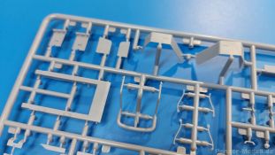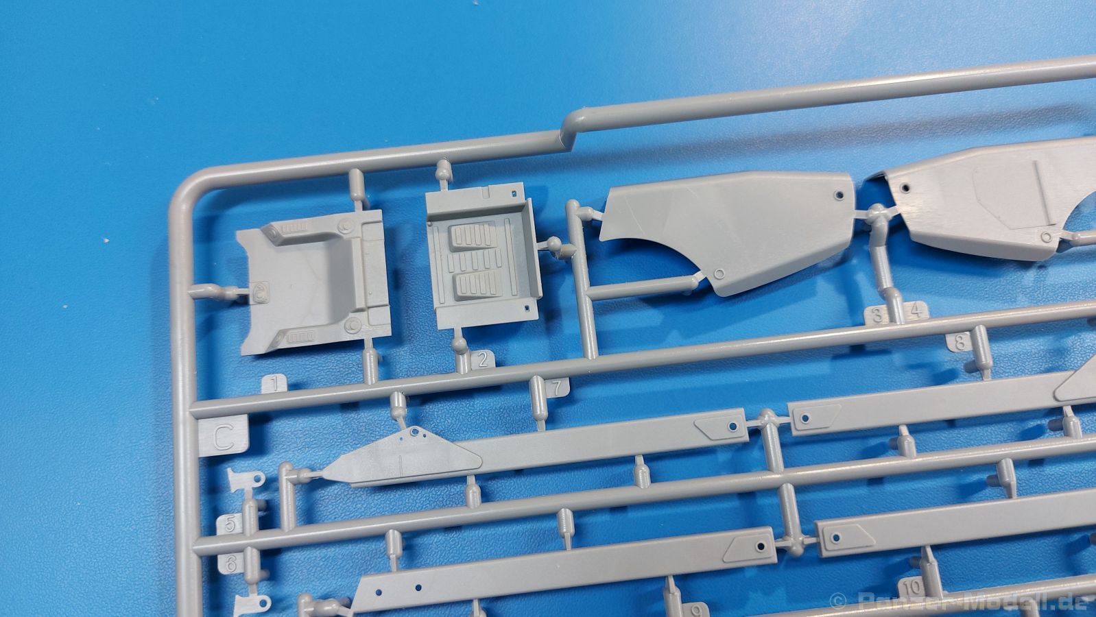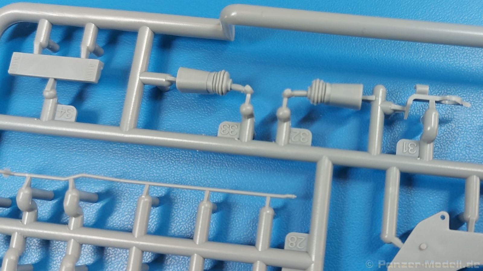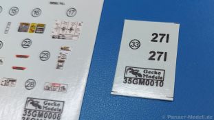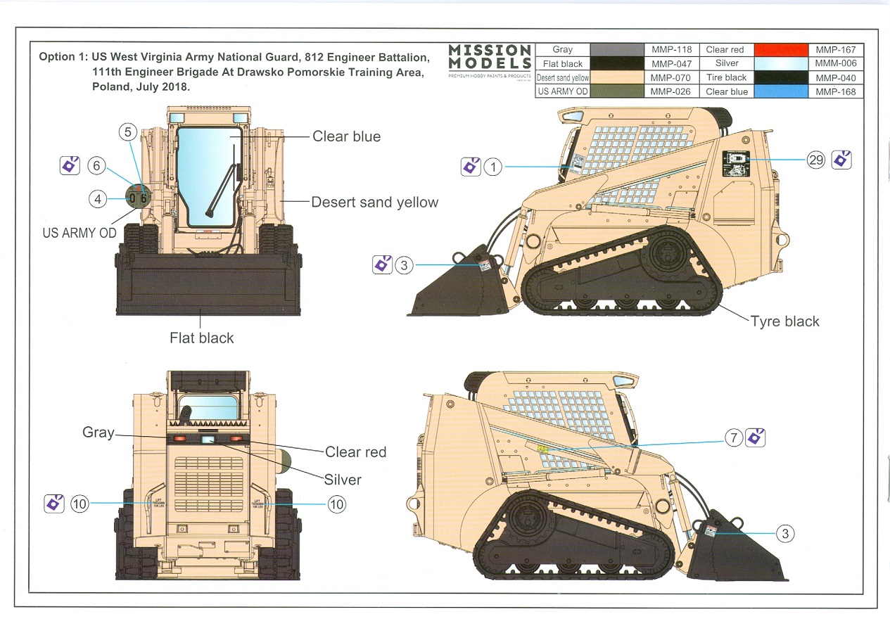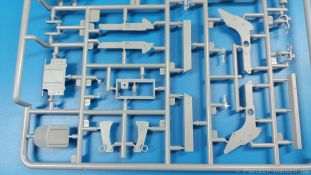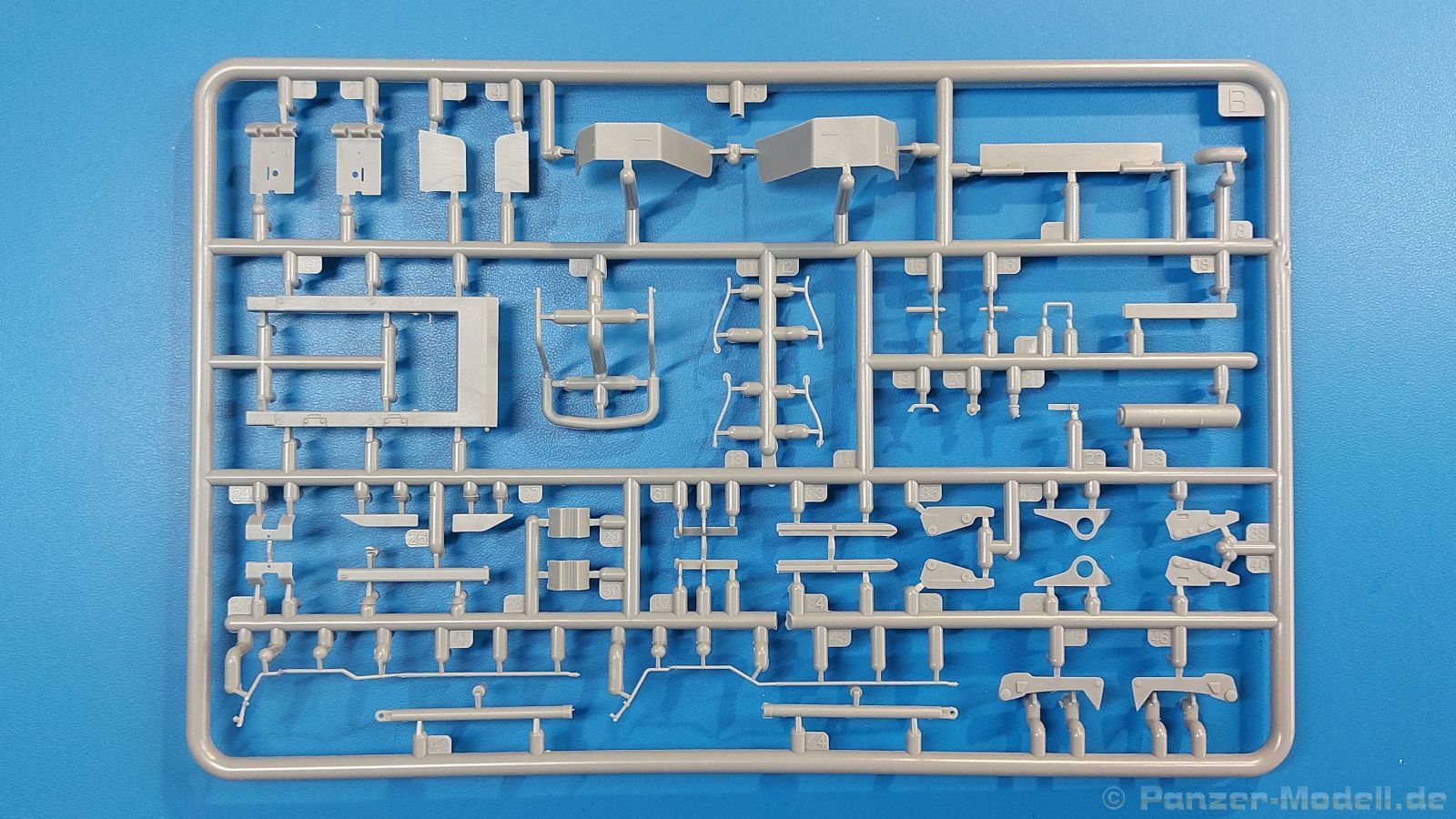Der Bausatz: Wenn Gecko Models einen Bausatz rausbringt, der auch im Original Versionen vorweist, kann man damit rechnen, dass nach dem ersten Modell nicht Schluss ist. So kann man möglichst großen Nutzen aus den vorhandenen Formen ziehen, Kosten sparen und den Modellbauern trotzdem was anderes zu einem annehmbaren Preis bieten. Sven hat sich bereits den Kompakt-Radlader US Army Light Type III Skid Steer Loader (M400W) angeschaut. Heute zeige ich Euch die Raupenversion davon. Im 330 x 190 x 90 mm großen, stabilen Klappdeckelkarton mit farbigem Überkarton befinden sich 8 hellgraue, 1 Klarsichtspritzling, 1 PE-Platine, kunststoffüberzogener Draht, 1 großes Decalblatt und ein zusätzliches, kleineres und natürlich die Bauanleitung. Die Spritzlinge sind einwandfrei, die Teile ohne Versatz oder Sinkstellen. Nach dem Zusammenbau eventuell sichtbare Auswerferspuren konnte ich jetzt nicht entdecken. Bei sehr feinen Teilen entdeckt man leichten Grat der Formtrennnaht, aber der ist leicht zu entfernen und mir persönlich ist es lieber, etwas zu entfernen als aufwendig auffüllen zu müssen. Die Klarsichtteile sind kristallklar, sowie kratzer- und schlierenfrei, was man bei den großen Scheiben nur begrüßen kann. Ein paar Fotoätzteile, grad für die Schutzgitter, heben das Niveau. Für die flexiblen Hydraulikleitungen gibt es einen kunststoffüberzogenen, feinen Draht, den man auch ohne weitere Bemalung verwenden kann. Die kleine Fahrerkabine wird ein echter Hingucker. Die Bedienhebel, teils aus Plastik, teils aus Fotoätzteilen (PE) sind sehr fein wiedergegeben. Das Verschlussstück eines Beckengurtes ist aus PE wird in die Halterung eingebaut und wird dann so aussehen, als könnte man den Gurt herausziehen. Ein nach oben wegklappbarer Schutzbügel mit angegossener Polsterung im Bauchbereich (wie in manchen Achterbahnen) kann sicherlich bei sparsamem Umgang mit Klebstoff beweglich angebaut werden. Sitznähte und Struktur der Faltenbälge der Joysticks sind sehr glaubhaft. Bedienknöpfe und Schalter der Armaturen sind deutlich wiedergegeben. Die Fenster und die große Einstiegstür sind glasklar. Die Einstiegstür kann meines Erachtens auch geöffnet angebaut werden. An der Tür werden noch Griffe und ein feiner Doppelarmscheibenwischer aus PE angebracht hat. Die Schutzgitter der Seitenfenster sind aus großen PEs, die dazu auch noch sehr schöne Sechskantschraubenköpfe vorzuweisen haben. Es gibt jede Menge Typschilder, Armaturenanzeigen und Warnhinweise, die mittels Nassschiebebildern angebracht werden. Das Schutzgitter im Dach ist bereits durchbrochen. Die Durchbrüche könnten ein klein wenig schärfer sein. Hier ggfs. ein klein wenig sehr vorsichtig nacharbeiten. Fahrscheinwerfergehäuse werden vorn ins Dach eingebaut. Die Scheinwerfergläser dazu zeigen die Riffelung im Glas wie beim Original. An das Hinterteil des Daches wird das Klimagerät angebaut. Das einzubauende Dachfutter hat bereits die Belüftungsklappen und Gitter eingegossen. Zwei Rückspiegel finden auch ihren Weg an die Dachunterseite. Das Motorgehäuse sollte den geringsten Aufwand beim Bau darstellen. Nur für das Gehäusegitter benötigt man PE-Origami-Fähigkeiten, da es in einem mehrfachen V-Muster gefaltet werden muss, damit es in die Aussparungen am Rahmen passt. Das Endstück des Auspuffs ist bereits schön tief geöffnet. Bei der Hydraulikanlage der Schaufelarme und der Schaufel selbst hat sich Gecko Models alle Mühe gegeben, nicht nur bei den Details, sondern auch der möglichen Beweglichkeit aller Teile. Dazu sind die Hydraulikzylinder in zwei Hälften geteilt, damit die Hydraulikstempel, die meist eine Verdickung am Ende haben, nicht mehr ganz herausrutschen können. Für die festen Hydraulikleitungen gibt es dünne, feine Teile aus Plastik, für die flexiblen liegt schwarzer Schlauch (mit einem Draht innen) bei. Für bessere Flexibilität ggfs. den Draht vorsichtig aus dem Schlauch herausziehen. Mit Draht drin lässt er sich aber besser formen. Die Schlauchanschlüsse kommen den Originalen sehr nahe, was sich allerdings auch auf die Größe bezieht und damit in dem Maßstab recht klein sind. Die Schaufel wird inkl. Schläuchen aus 23 Teilen zusammengesetzt. Von den Laufrollen sieht man zum Schluss nicht mehr viel, dennoch besteht jede der drei Laufrollendrillinge aus Innen-, Mittel- und Außenrad. Das Mittelrad läuft dann zwischen den zwei Zahnreihen der Ketten. Die Ketten für jede Seite sind in zwei Hälften geteilt und werden dann über Lauf-, Umlenk- und Antriebrädern zusammengeführt. Das Anbringen des Laufwerks am Gehäuse stellt dann auch den letzten Bauschritt dar. Die Bauanleitung bietet eine Markierungsoption an, ein Zusatzblatt eine zweite: