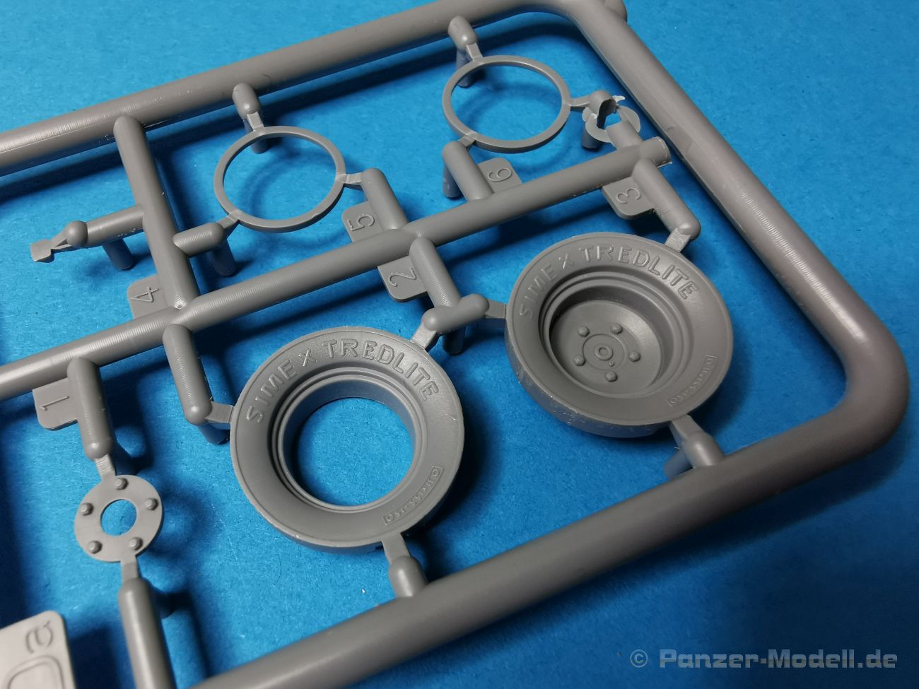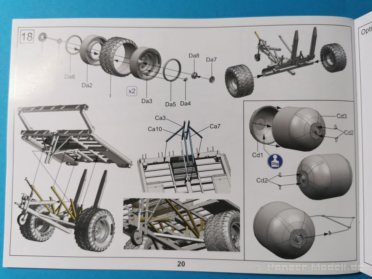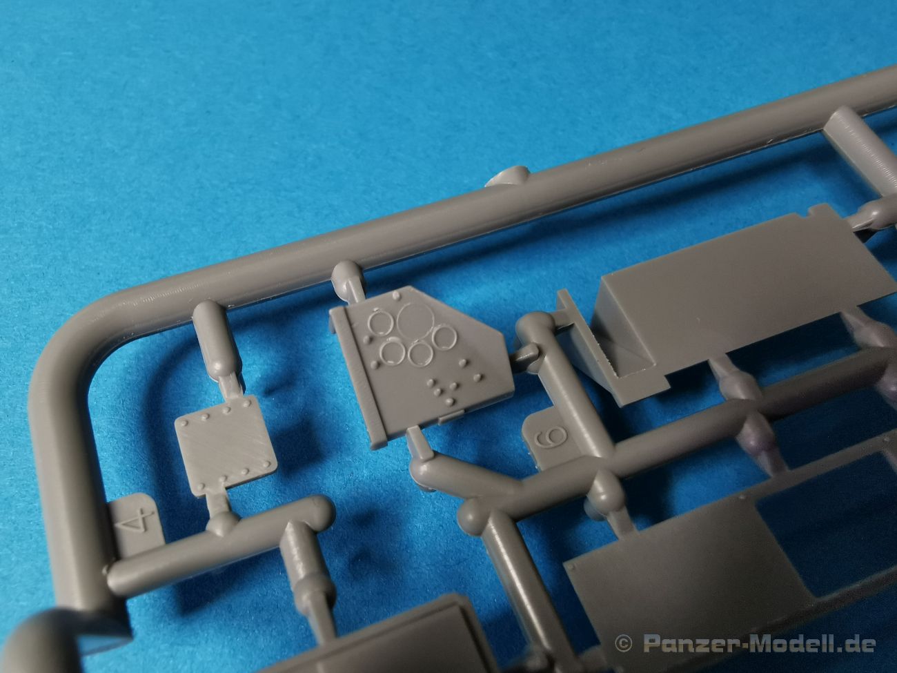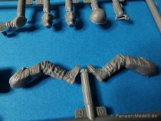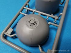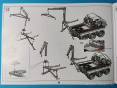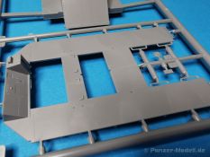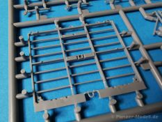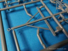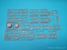 Ich war zunächst erstaunt über die hohe Anzahl der Spritzrahmen aus hellgrauem Plastik. So viele Bauteile für so ein kleines Fahrzeug mit einem kleinen Anhänger... Nämlich insgesamt 34 Spritzrahmen, dazu kommen Klarsichtteile für Spiegel und Scheinwerfer, 3 Platinen mit PE Teilen, 9 Reifen aus Spritzguss, 2 Gummibänder und ein Decal-Sheet. Der Karton ist also reichlich gefüllt. Der Bausatz bietet eine sehr gute Fertigungsqualität, scharfkantiger Guss, sehr schöne und sehr fein detaillierte Bauteile, einiges an Zubehör und sogar eine Fahrerfigur sind enthalten. Der Bausatz bietet eine sehr gute Fertigungsqualität, scharfkantiger Guss, sehr schöne und sehr fein detaillierte Bauteile, einiges an Zubehör und sogar eine Fahrerfigur sind enthalten. Jedoch weisen einige Bauteile auch Gusshäute auf. Die dürften sich relativ leicht entfernen lassen. Für die Figur liegen zwei alternative Köpfe bei. Einmal der Kopf mit Schutzbrille, einmal ohne Brille. Bei der Figur sticht besonders positiv der Faltenwurf der Kleidung hervor. Für den Fahrer- und Beifahrersitz sind photogeätzte Hosenträgergurte enthalten. Weiterhin befinden sich drei L85 Sturmgewehre im Bausatz. Für die Gewehre gibt es sogar photogeätzte Trageriemen. Darüber hinaus sind auch Pistolen im Bausatz vorhanden. Jeweils die Glock 17 und die SIG Sauer 226, beide optional mit und ohne Holster. Besonders gut gefallen mir die Räder in diesem Bausatz. Sie bestehen nämlich aus Spritzguss und nicht, wie bei vielen anderen Herstellern, aus Gummi. Das hat den Vorteil, dass sie sich zum einen besser bemalen lassen und zum anderen kann sich hier kein Weichmacher verflüchtigen. Das führt nämlich dazu, dass die Gummireifen im Laufe der Zeit spröde werden und sich Risse im Material bilden können. In diesem Bausatz besteht ein Reifen aus 6 Bauteilen die einen ganz hervorragenden Eindruck machen. Eine Beschriftung der Reifenflanken ist selbstverständlich ebenfalls vorhanden. Die Bauanleitung: Sie führt im Format DIN A4 quer in insgesamt 18 Baustufen zum fertigen Modell. Die Zeichnungen sind groß und sehr übersichtlich gehalten. Da dürften keine Schwierigkeiten auftreten. Das Decalsheet bietet die Beschriftungen und Markierungen für das Zugfahrzeug, den Kran und den Anhänger sowie Abzeichen für den Kampfanzug des Fahrers. Die amtlichen Kennzeichen sind ohne Ziffern gedruckt, nur die Buchstaben sind bereits vorgedruckt. Hier kann man sich entweder sein „Wunschkennzeichen“ anfertigen oder ein Kennzeichen nach Vorbildfotos gestalten. Die entsprechenden Ziffern sind bei den Decals separat vorhanden. Für die Bemalung bietet die Anleitung je ein Fahrzeug in Natogrün oder hellem Sandton. Beide sind jeweils in einer Fünf-Seiten-Ansicht dargestellt. Besonders das sandfarbene Fahrzeug fällt durch den knallroten Kran ins Auge. Der dürfte wohl extern beschafft worden sein und setzt, mit der zivilen Farbgebung, ein echtes Highlight. Der rote Kran ist übrigens durch Referenzfotos belegbar. Fazit: Für rund 33 EUR erhält man hier ein sehr schönes Modell mit tollen Details. Auf einem kleinen Diorama dürfte der ATMP mit dem Anhänger ein echter Hingucker werden.
