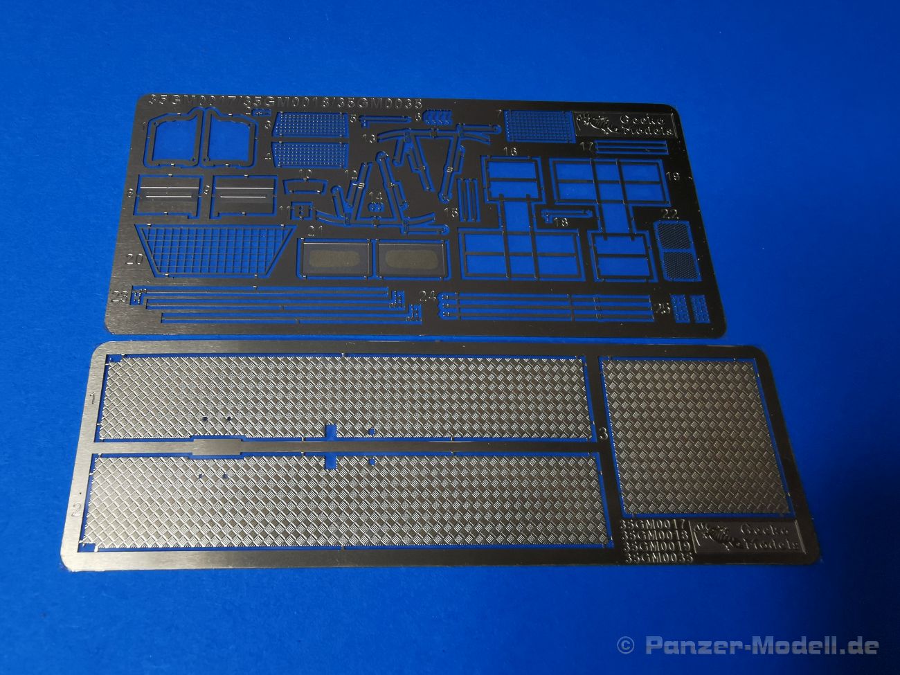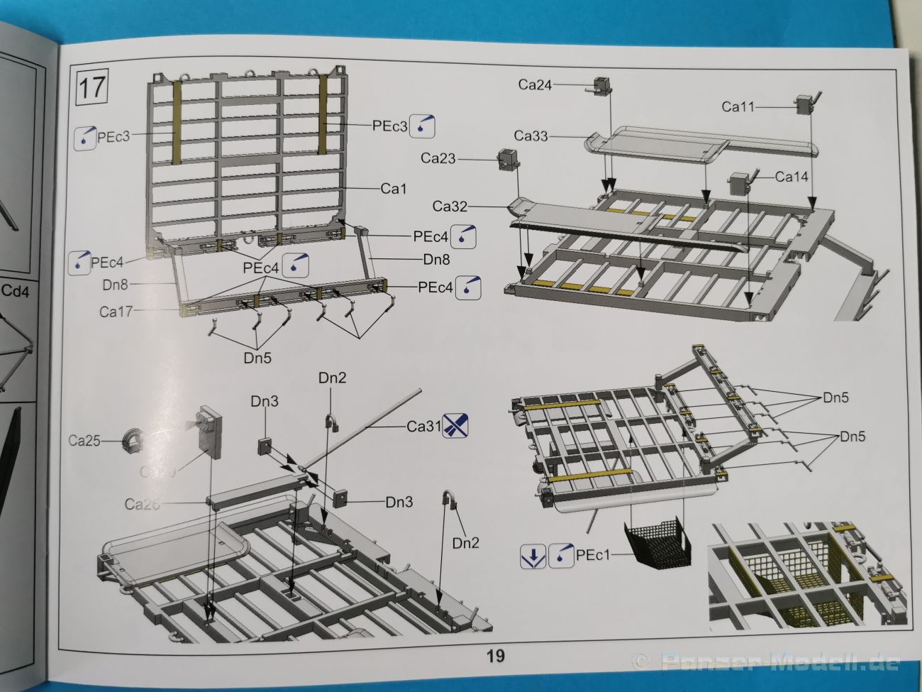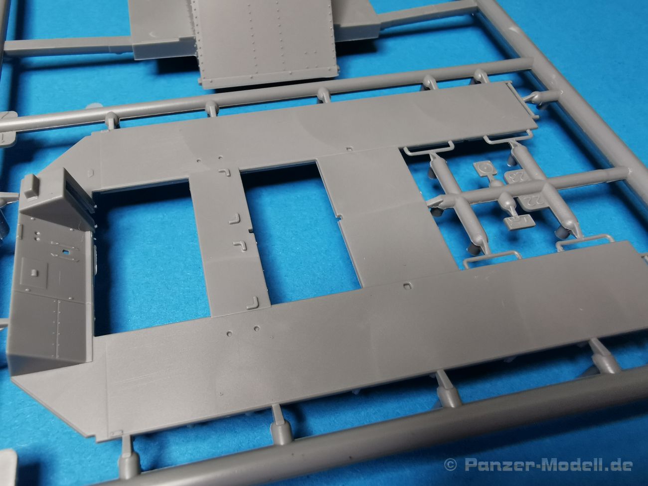 Ich war zunächst erstaunt über die hohe Anzahl der Spritzrahmen aus hellgrauem Plastik. So viele Bauteile für so ein kleines Fahrzeug mit einem kleinen Anhänger... Nämlich insgesamt 34 Spritzrahmen, dazu kommen Klarsichtteile für Spiegel und Scheinwerfer, 3 Platinen mit PE Teilen, 9 Reifen aus Spritzguss, 2 Gummibänder und ein Decal-Sheet. Der Karton ist also reichlich gefüllt. Der Bausatz bietet eine sehr gute Fertigungsqualität, scharfkantiger Guss, sehr schöne und sehr fein detaillierte Bauteile, einiges an Zubehör und sogar eine Fahrerfigur sind enthalten. Der Bausatz bietet eine sehr gute Fertigungsqualität, scharfkantiger Guss, sehr schöne und sehr fein detaillierte Bauteile, einiges an Zubehör und sogar eine Fahrerfigur sind enthalten. Jedoch weisen einige Bauteile auch Gusshäute auf. Die dürften sich relativ leicht entfernen lassen. Für die Figur liegen zwei alternative Köpfe bei. Einmal der Kopf mit Schutzbrille, einmal ohne Brille. Bei der Figur sticht besonders positiv der Faltenwurf der Kleidung hervor. Für den Fahrer- und Beifahrersitz sind photogeätzte Hosenträgergurte enthalten. Weiterhin befinden sich drei L85 Sturmgewehre im Bausatz. Für die Gewehre gibt es sogar photogeätzte Trageriemen. Darüber hinaus sind auch Pistolen im Bausatz vorhanden. Jeweils die Glock 17 und die SIG Sauer 226, beide optional mit und ohne Holster. Besonders gut gefallen mir die Räder in diesem Bausatz. Sie bestehen nämlich aus Spritzguss und nicht, wie bei vielen anderen Herstellern, aus Gummi. Das hat den Vorteil, dass sie sich zum einen besser bemalen lassen und zum anderen kann sich hier kein Weichmacher verflüchtigen. Das führt nämlich dazu, dass die Gummireifen im Laufe der Zeit spröde werden und sich Risse im Material bilden können. In diesem Bausatz besteht ein Reifen aus 6 Bauteilen die einen ganz hervorragenden Eindruck machen. Eine Beschriftung der Reifenflanken ist selbstverständlich ebenfalls vorhanden. Die Bauanleitung: Sie führt im Format DIN A4 quer in insgesamt 18 Baustufen zum fertigen Modell. Die Zeichnungen sind groß und sehr übersichtlich gehalten. Da dürften keine Schwierigkeiten auftreten. Das Decalsheet bietet die Beschriftungen und Markierungen für das Zugfahrzeug, den Kran und den Anhänger sowie Abzeichen für den Kampfanzug des Fahrers. Die amtlichen Kennzeichen sind ohne Ziffern gedruckt, nur die Buchstaben sind bereits vorgedruckt. Hier kann man sich entweder sein „Wunschkennzeichen“ anfertigen oder ein Kennzeichen nach Vorbildfotos gestalten. Die entsprechenden Ziffern sind bei den Decals separat vorhanden. Für die Bemalung bietet die Anleitung je ein Fahrzeug in Natogrün oder hellem Sandton. Beide sind jeweils in einer Fünf-Seiten-Ansicht dargestellt. Besonders das sandfarbene Fahrzeug fällt durch den knallroten Kran ins Auge. Der dürfte wohl extern beschafft worden sein und setzt, mit der zivilen Farbgebung, ein echtes Highlight. Der rote Kran ist übrigens durch Referenzfotos belegbar. Fazit: Für rund 33 EUR erhält man hier ein sehr schönes Modell mit tollen Details. Auf einem kleinen Diorama dürfte der ATMP mit dem Anhänger ein echter Hingucker werden.