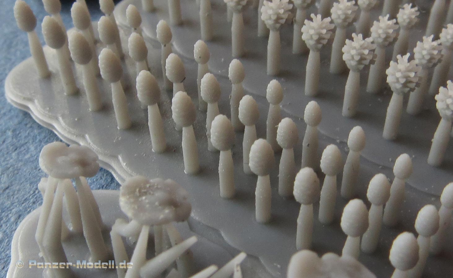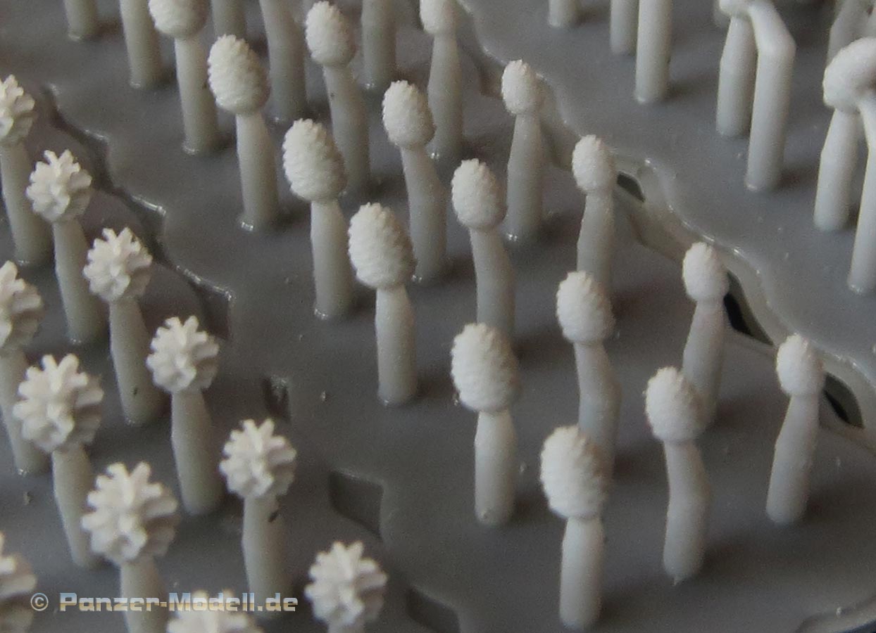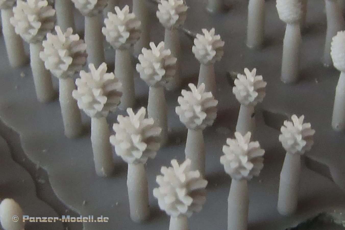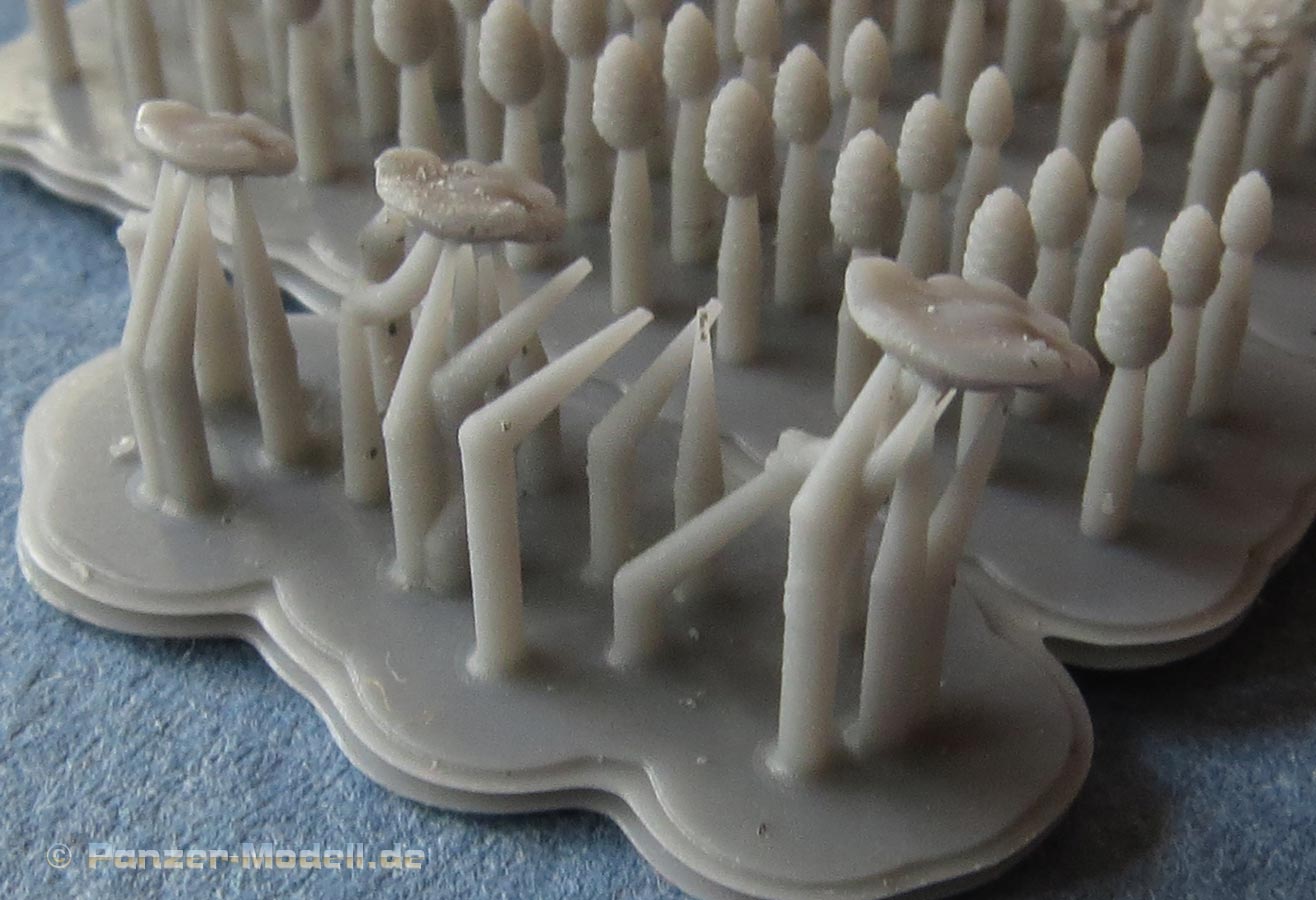Insgesamt finden wir hier eine große 3D Druckplatte, die 2x 4 Pilze mit großem Schirm und 4x 30 "Tannen"zapfen. Letztere liegen in vier verschiedenen Versionen bei - dies dürften Pinien, Fichten und Kiefernzapfen sein. Innerhalb der vier verschiedenen Zapfenarten liegen diese in drei verschiednen Größen bei. Damit hat HD Models wahrlich einen Rundumschlag geleistet bei der jeder Dioramenbauer das passende Material für die Feindetaillierung finden sollte.