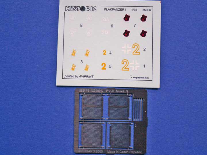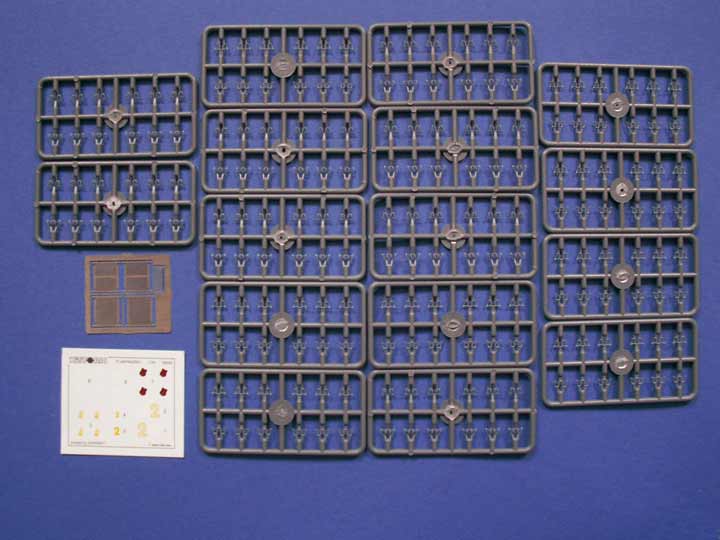 Im Karton finden sich recht veiel Bauteile - der Panzer I ausf.A wurde ja schon von dieser Firma herausgebracht und so ist die Wanne mit dem Laufwerk schon bekannt. Ob hier nun Verbesserungen eingeflossen sind, lässt sich so nicht sagen. Die Kette ist eine Einzelgliedkette und sieht verdammt gut, aber auch recht fragil aus. Die Bauteile an den diversen Spritzlingen machen einen guten Eindruck. Inwiefern diese dann auch passend sind muss sich noch zeigen. Der Bausatz enthält auch einen sehr guten Decalbogen mit den wichtigsten Abzeichen, wie man sie auf Fotos vom Flakpanzer I kennt, darstellt, was ich für einen gewaltigen Pluspunkt halte. Auch der kleine PE Satz weiss zu gefallen, hat er doch zwei verschiedene Gitter für die Auspufftöpfe dabei. Bei den Bauteilen speziell für den Flakpanzer I sind alle wichtigen Features, wie etwas die Stufe in der Frontplatte, dabei - und natürlich fehlt auch nicht die 2cm FlaK. Das Rohr hat zwar einen separaten Mündungstrichter, aber ich denke mit einem Alurohr ist man hier besser beraten. Natürlich wurde auch der Sondernanhänger nicht vergessen, der für diesen Flakpanzer typisch isst und an einer modifizierten Kupplung angehängt wird. Ansonsten machen die Teile allesamt einen stimmigen Eindruck. Und auch die Bauanleitung ist klar und übersichtlich. An Bemalungs und Markierungsvarianten sind einmal Wintertarn, je einmal grau als Fahrzeug der 1./Fla.Btl.614 , 2./Fla.Btl.614 und 3./Fla.Btl.614.
