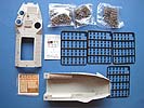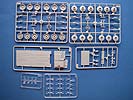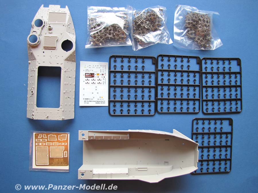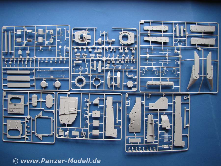 Im Bausatz finden sich 21 Spritzlinge, Ober- und Unterwanne aus hellgrauem Plastik, drei Beutel Einzelkettenglieder und kleiner Bogen Decals für eien KFOR Variante und reichlich Markeirungen für den Innenraum. Darüber hinaus gibt es eine Platine mit Ätzteilen.