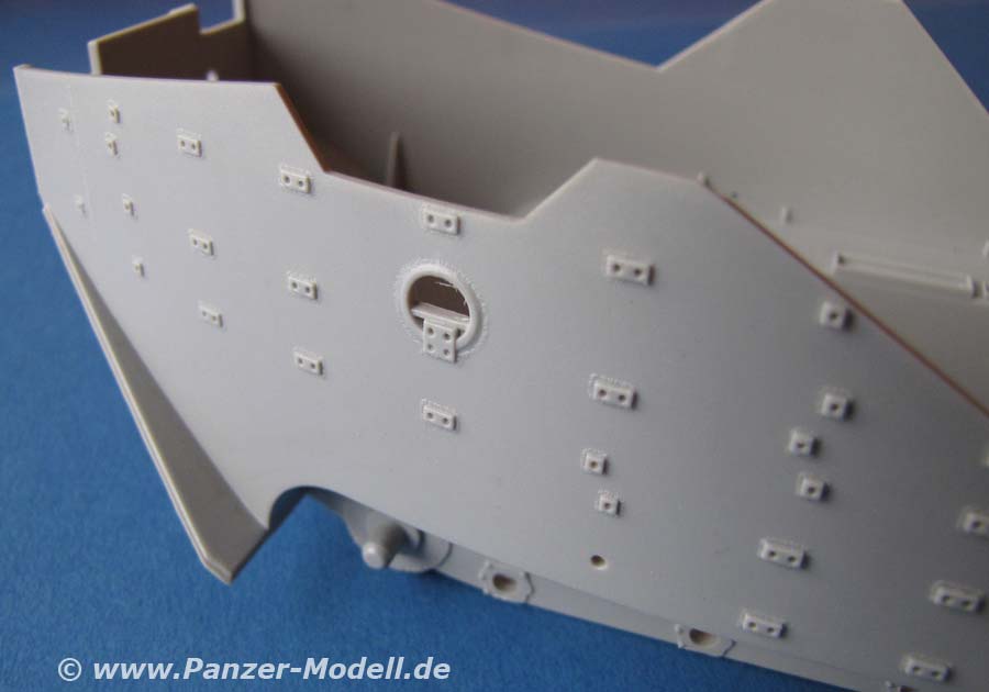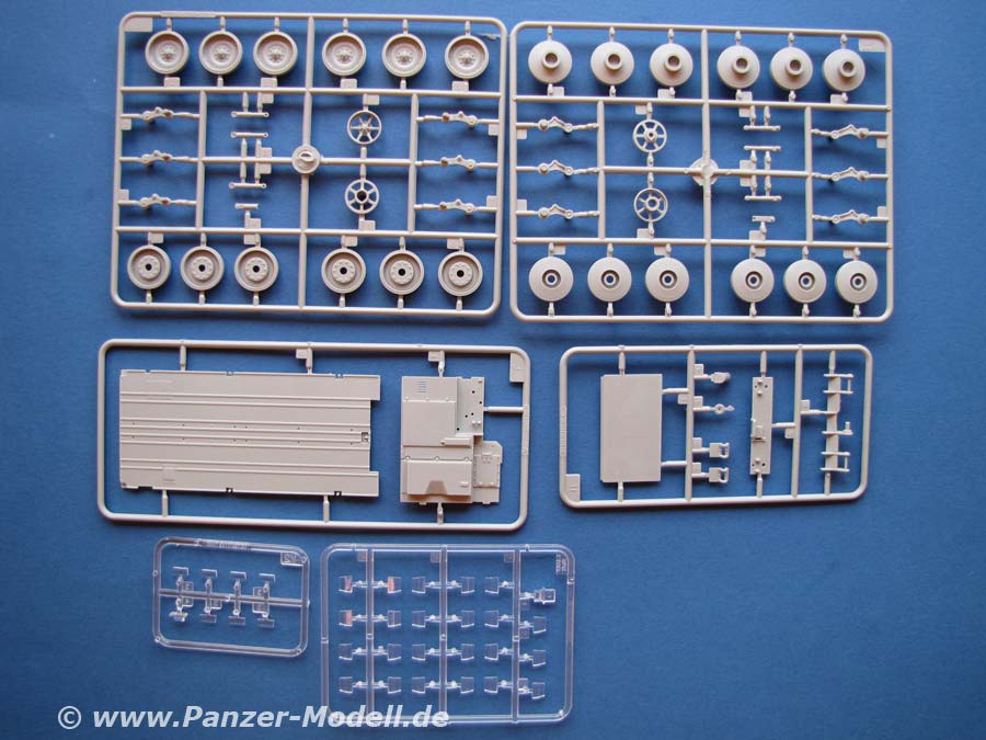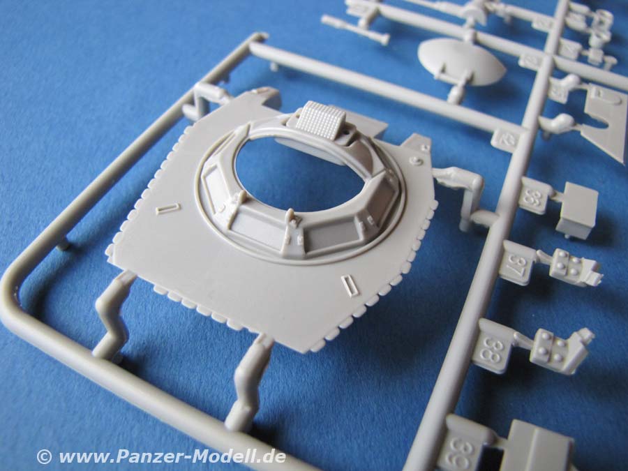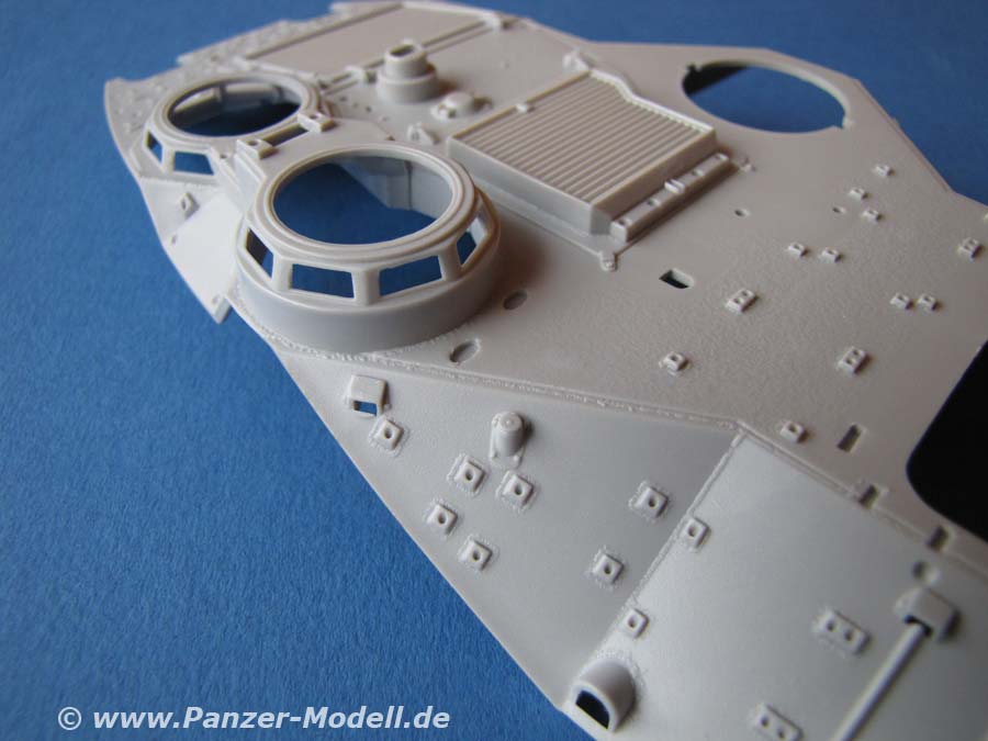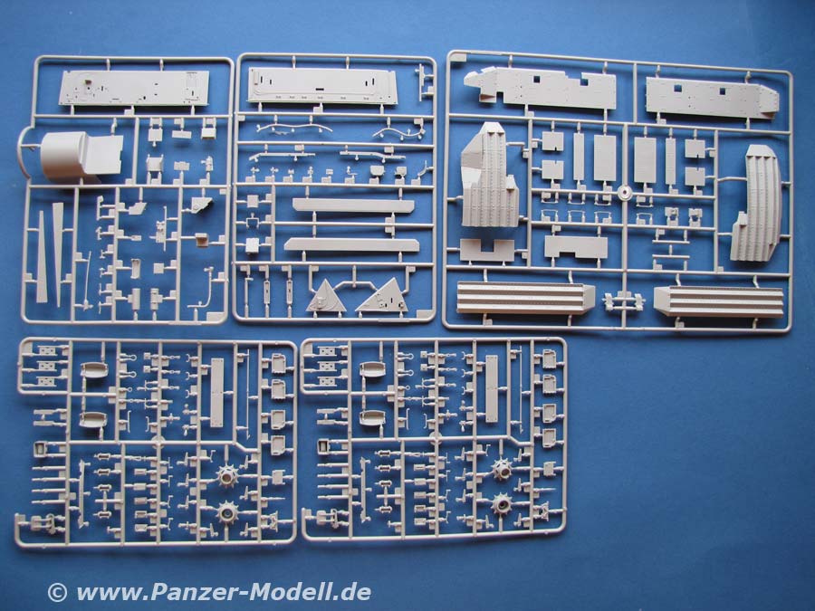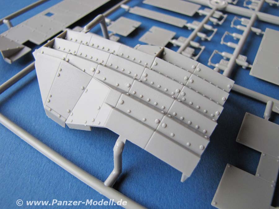 Die Qualität der einzelnen Teile ist gut bis sehr gut, mit vielen Details, auch im Innenbereich. Der Innenraum ist auch hier komplett und sehr schön dargestellt. Die Zusatzpanzerung ist sehr gut ausgeführt und weist gute Details auf. Auch die Antirutschbeschichtung ist sehr gut dargestellt. Die Ketten sind als zweiteilige Einzelglieder vorhanden. Dies erleichtert die Lackierung der einzelnen Glieder, bzw. Gummipolster.