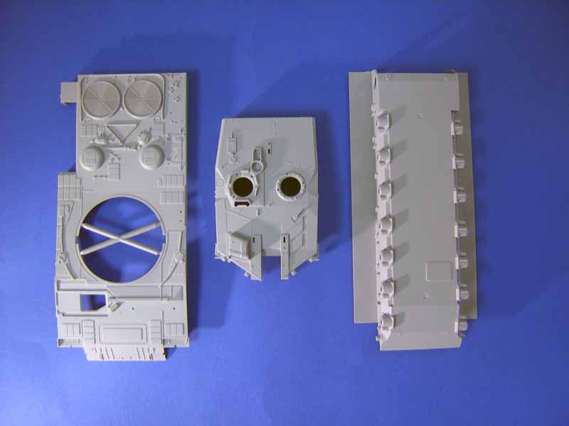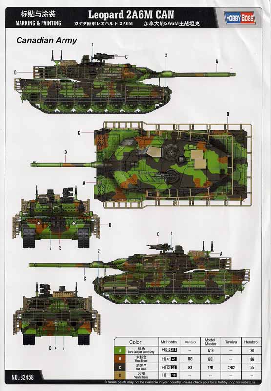 Nun ist er endlich da. Der Leopard 2A6M CAN ist von Hobby Boss unter der Artikelnummer HB82458 erhältlich. Doch nach bereits etlichen Spekulationen und Ankündigungen wurde eines schnell klar. Es handelt sich nicht um einen völlig neuen oder überarbeiteten Bausatz. Leider hat Hobby Boss nur auf bestehende Formen zurückgegriffen und einige neue Spritzrahmen mit den nötigen Bauteilen für die kanadische Version des Leopard 2A6M beigelegt. Insgesamt sind 15 Spritzrahmen aus hellgrauem Plastik, je ein Wannenober- und Unterteil, drei Platinen mit Photoätzteilen, ein Satz Klarsichtteile für die Optiken, Polycaps, ein Bindfaden, ein kleines Decalsheet, zwei Bögen mit aufgedruckten Verpflegungs- und Getränkekartons sowie die ebenfalls gut bekannten, relativ weichen, Vinylketten im Bausatz enthalten. Über die Qualität und Detailtreue der „alten“ Bausatzteile haben wir uns bereits bei den vorhergehenden Besprechungen der Hobby Boss Leopard Serie ausgelassen. Daher will ich hier nur ganz kurz einige der gröbsten Kinken erwähnen. Da ist zum einen das recht einfach ausgeführte Periskop, Peri R17A2, der falsche Lafettenring, mit hervorstehenden Kanten, für die Ladeschützenluke, die schlechte Passform der Turmzusatzpanzerung, die megadicken Antirutschbeläge auf dem Wannenoberteil sowie die fehlenden Details an den Antriebszahnkränzen. Im Gegenzug bemerkt man bei den neuen Bauteilen für die CAN-Version eine deutliche Steigerung der Fertigungsqualität. Die Bauteile sind weitaus besser detailliert und scharfkantiger gefertigt. Die Zusatzpanzerung auf der Bugplatte verfügt über sehr schöne Felder für den Antirutschbelag. Dieser hat sogar eine leicht raue Oberfläche. Auch die restlichen, für einen kanadischen Leopard 2A6M benötigten Bauteile sind allesamt vorhanden. Die zusätzliche Entlüftungshutze auf dem Elektronikraum fehlt ebenso wenig wie der Staukasten für die C6 Gewehre vor der Kommandantenluke und die beiden großen Elektronikboxen auf dem hinteren Turmdach. Allerdings fehlt bei allen drei Behältern der Antirutschbelag auf der Oberseite. Die so sehr charakteristischen kanadischen T-Antennensockel und die passenden Antennen liegen ebenfalls bei. Und last, but not least, eine wirklich super gemachte SLAT-Armor. Hut ab, die ist wirklich gelungen! Natürlich ist sie maßstäblich etwas zu dick, aber das wird sich in Plastikspritzguss wohl nicht besser darstellen lassen. In der Bauanleitung soll in Abschnitt 16 die alte 4 / 4 Mehrfachwurfanlage montiert werden. Nun, das ist nicht wirklich falsch. Einige der 20, von Kanada geleasten, Leopard 2A6M waren nämlich tatsächlich noch mit der alten 4 / 4 Anlage ausgerüstet, die meisten aber jedoch mit der neuen 6 / 2 MWA. Die nötigen Bauteile dafür sind im Bausatz enthalten, sie werden nur in der Anleitung nicht erwähnt. Aber Achtung: Beide Anlagen sind falsch dargestellt. Denn bei den Bausatzteilen stehen die Wurfbecher alle schön in Reih und Glied hintereinander, während sie im Original unterschiedlich zur Turmlängsrichtung abgewinkelt angebracht sind um durch die Fächerwirkung vor dem Panzer eine Nebelwand erzeugen zu können. Das Decalsheet fällt ein wenig mager aus. Es liegen lediglich zwei Ahornblätter, ein Satz Kennzeichen und 2 x das kleine Männchen mit der Leiter bei. Weitere Kennzeichenvarianten oder gar die Schriftzüge für die Wartungshinweise fehlen leider. Für die Bemalung liegt ein farbig gedrucktes DIN A4 Blatt bei auf dem der Leopard in einer Fünf-Seiten-Ansicht zu sehen ist. Richtigerweise sind die Boxen auf dem Turmdach sowie die SLAT mit den Aufnahmen sandfarben lackiert. Aber in den Montagebereichen der Träger für die SLAT wurde die ursprüngliche Lackierung im Original lediglich in Bronzegrün nachlackiert. Die schwarzen und braunen Tarnflecken wurden nicht erneuert da alle kanadischen Leopard 2A6M später während des Einsatzes in Afghanistan ohnehin mit dem sandfarbenen Thermal-Blanket-System ausgestattet worden sind. Hier sollte man unbedingt Vorbildfotos für eine originalgetreue Lackierung zu Rate ziehen. Fazit: Insgesamt ein Bausatz der nun doch so einige Mängel aufweist und den anspruchsvollen Modellbauer wohl die Nase rümpfen lässt. Wer Wert auf höchstmögliche Detaillierung und Originaltreue legt wird hier enttäuscht. Allerdings ist dieser komplette Bausatz mit einem Preis von nur 20,50 EUR ein absoluter Knaller. Günstiger geht einfach nicht mehr! Kauft man sich den Tamiya Leopard 2A6 plus die nötigen Umbausätze legt man für die „High-Tech-Mega-Detailled-Version“ nämlich locker weit über 100,- EUR auf den Tisch. Daher: Unbedingte Kaufempfehlung! Aufgrund der einfache Montage der SLAT-Armor und der nur wenigen Photoätzteile ist dieses Modell auch für Anfänger uneingeschränkt zu empfehlen.