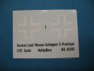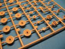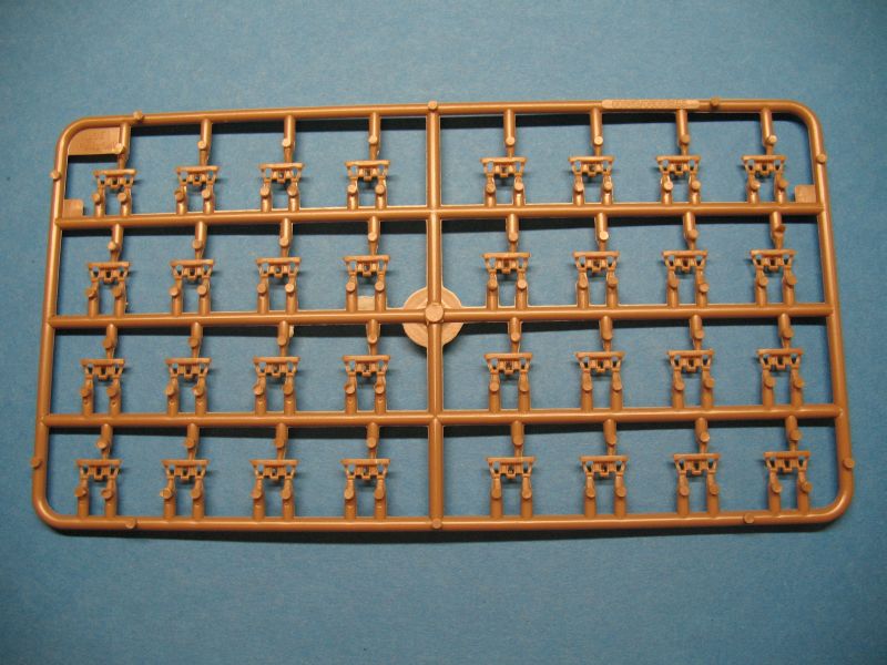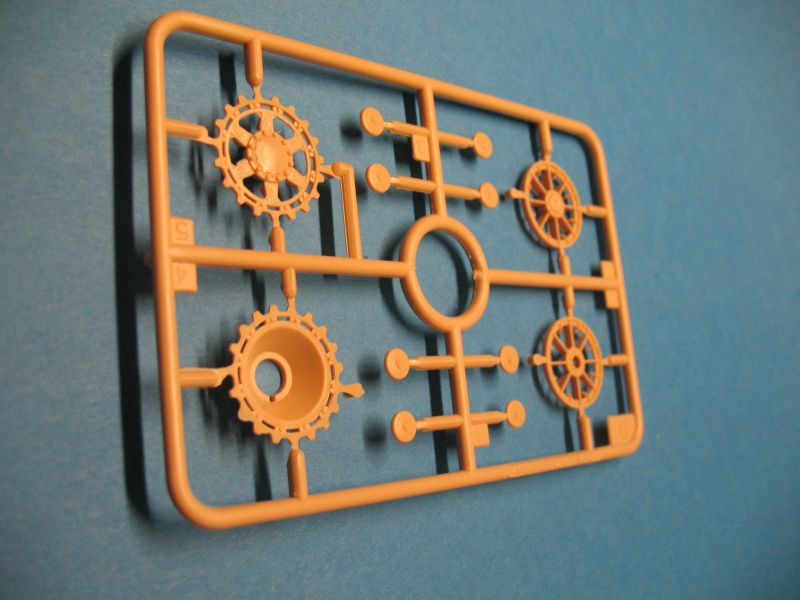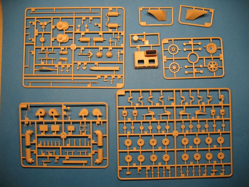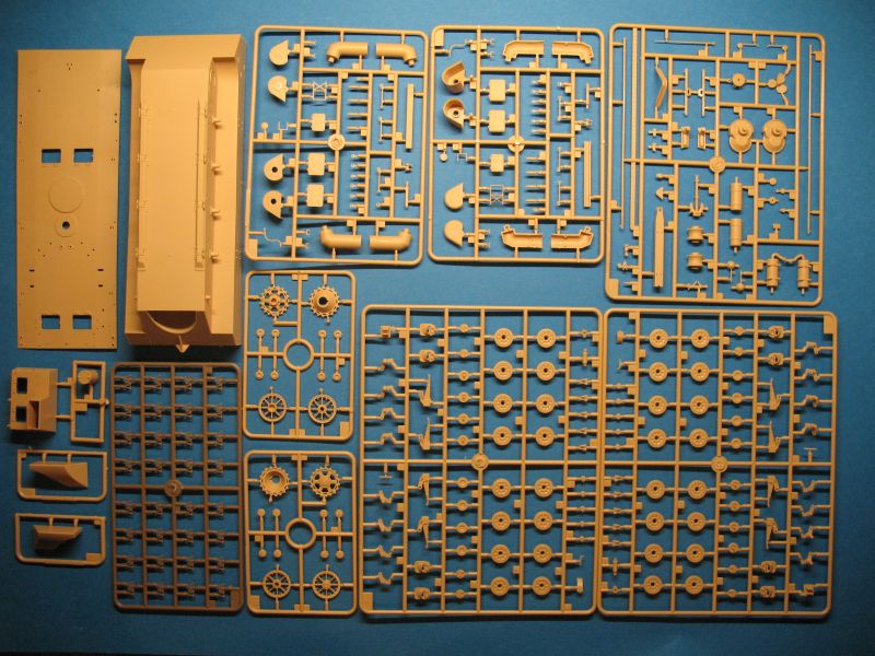 Im Karton befinden sich 10 zum Teil kleine Spritzgussrahmen für das Fahrzeug und 7 weitere für die Einzelgliederkette. Ausserdem die Wanne, das Deck, eine Tüte mit einem farblich stimmigen Seil für die Reling und ein Decalbogen mit 2 großen Balkenkreuzen. Leider sind die "Scheiben" der beiden Scheinwerfer nur im beigen Kunststoff der Teile gespritzt.