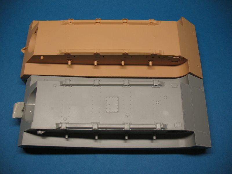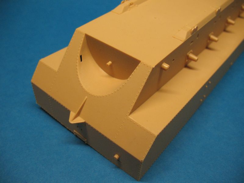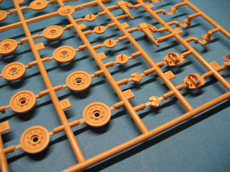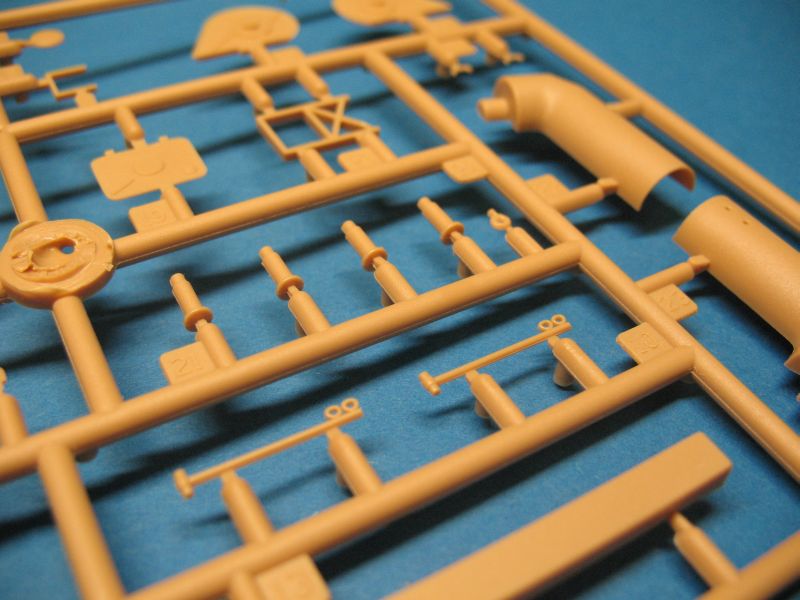 Wie das Original besteht auch das Modell aus nicht allzu vielen Baugruppen die der Bausatz gut detailliert und sauber gespritzt wieder gibt. Die Oberflächen der Wanne, des Decks und des Aufbaus sind leicht rau und stellen gewalzten Stahl gut dar. Am vorliegenden Bausatz sind alle Auswerfermarken so positioniert, dass sie am fertigen Modell nicht sichtbar sind, Sinkstellen sind ebenfalls nicht zu finden.
