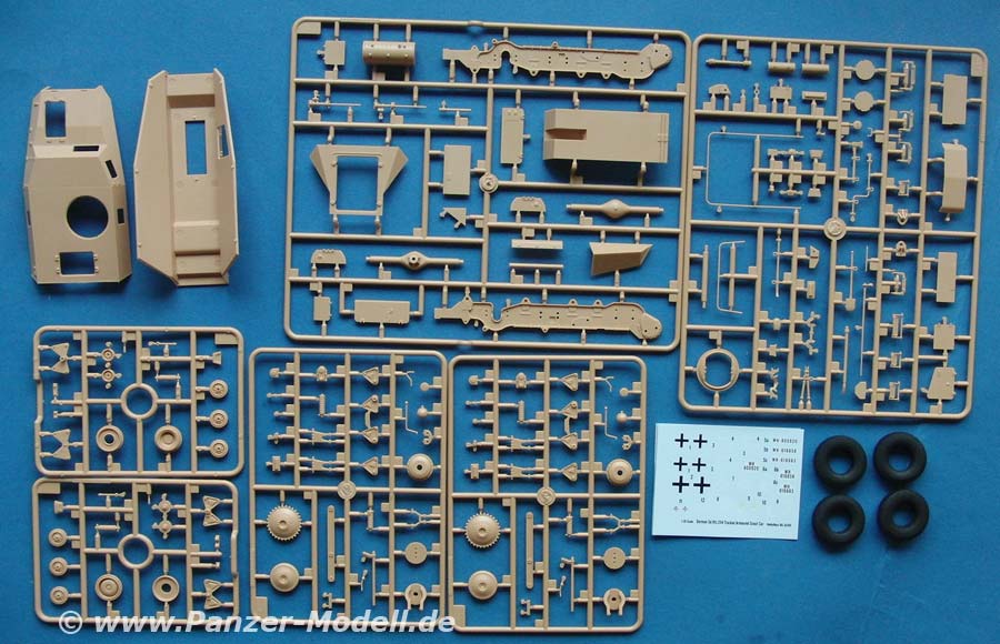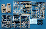Der Kartoninhalt besteht aus 576 Teilen an 22 Spritzlingen, Unterwanne, Oberwanne, Vinylreifen, PE Teile und ein Decalbogen. Der größte Teil davon sind die Glieder der Einzelgliedkette.