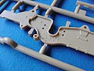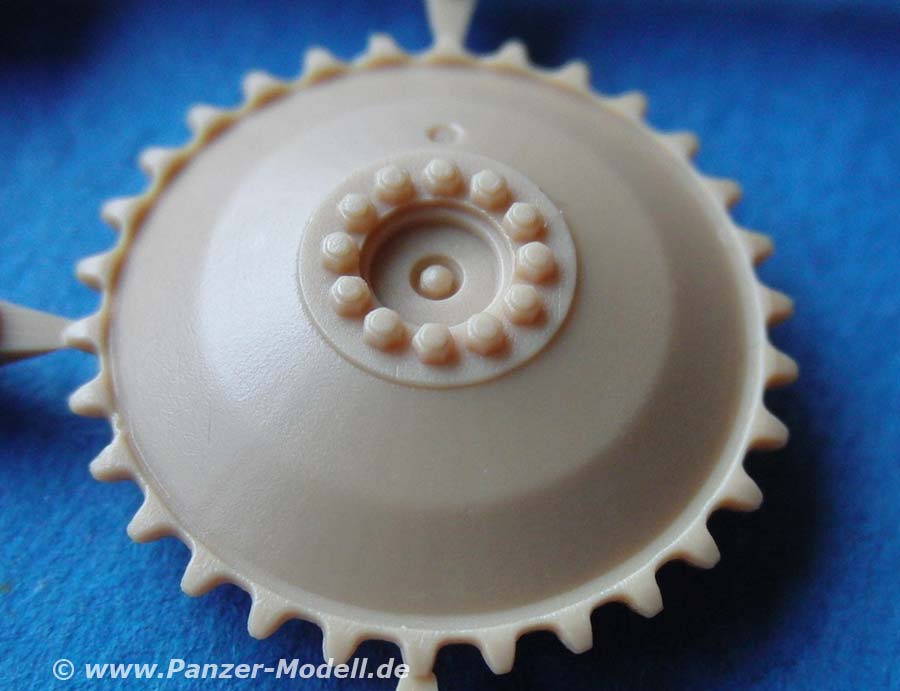 Das Fahrwerk an sich ist recht komplex und insbesondere die Kette dürfte einiges an Zeit und grauen Haaren fordern. Diese ist klein und filigran wie eine Panzer I Kette, unterscheidet sich von dieser aber. Da man laut Bauanleitung 138 Stück pro Seite benötigt und jedes Glied an 3 Angusspunkten im Spritzling sitzt, kann man sich leicht den Aufwand ausrechnen.
