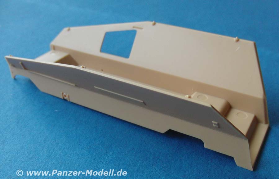 Unter- und Oberwanne sind bereits als große Teile in einem Stück gegossen, was lästiger Arbeit beim Zusammenbau erspart. Auch hier sind bereits recht schöne Details wie Nieten, Scharniere, usw. mit eingegossen. Alle Luken sind so gestaltet, dass man sie offen oder geschlossen darstellen kann, allerdings bietet das Modell im Inneren nichts auf das man durch geöffnete Luken schauen könnte.