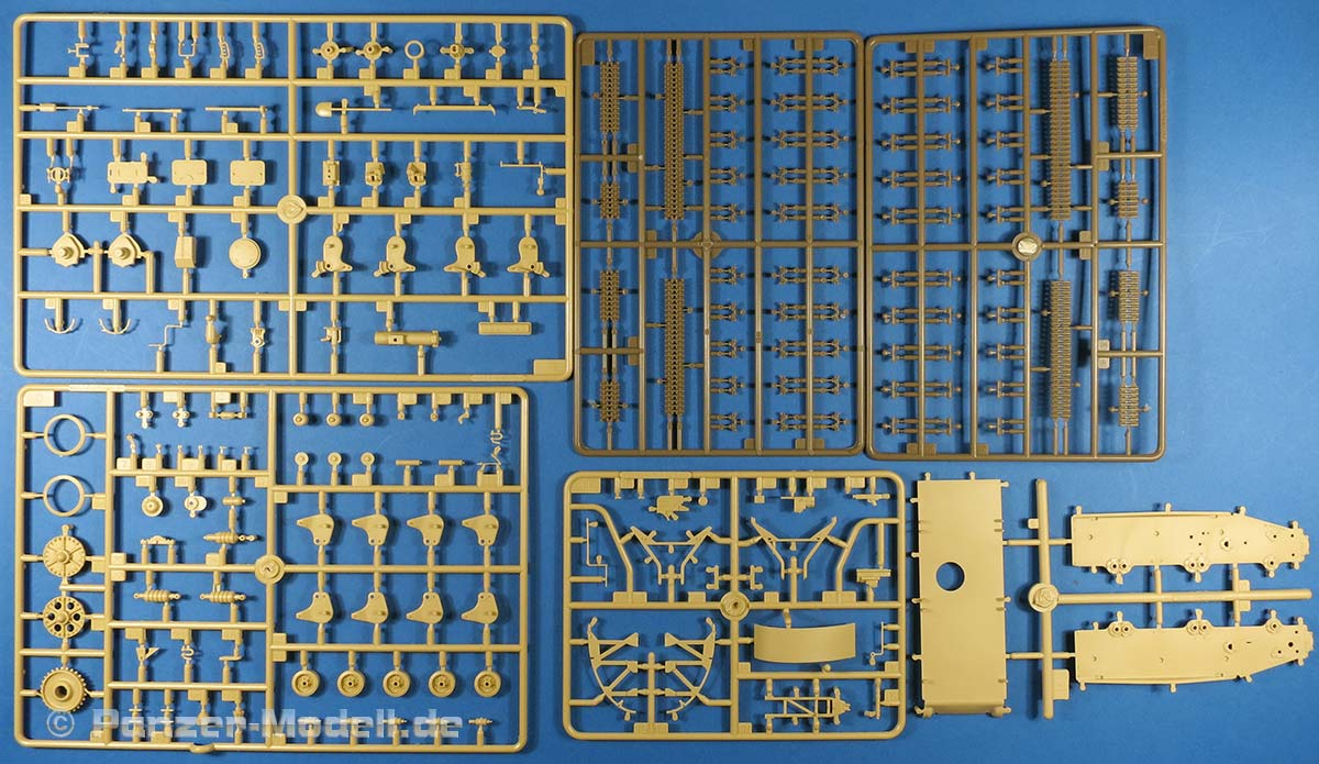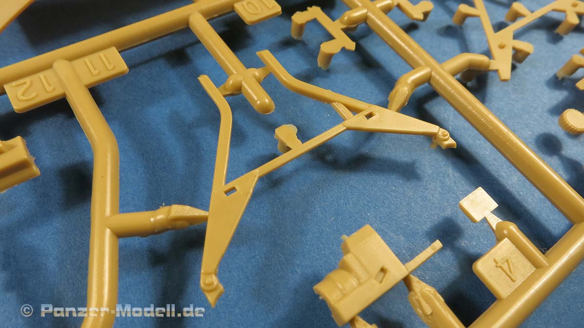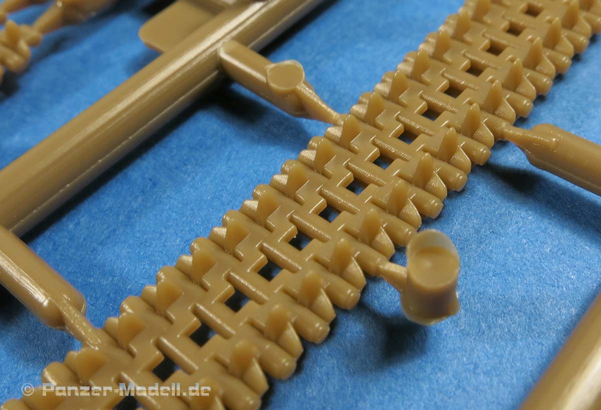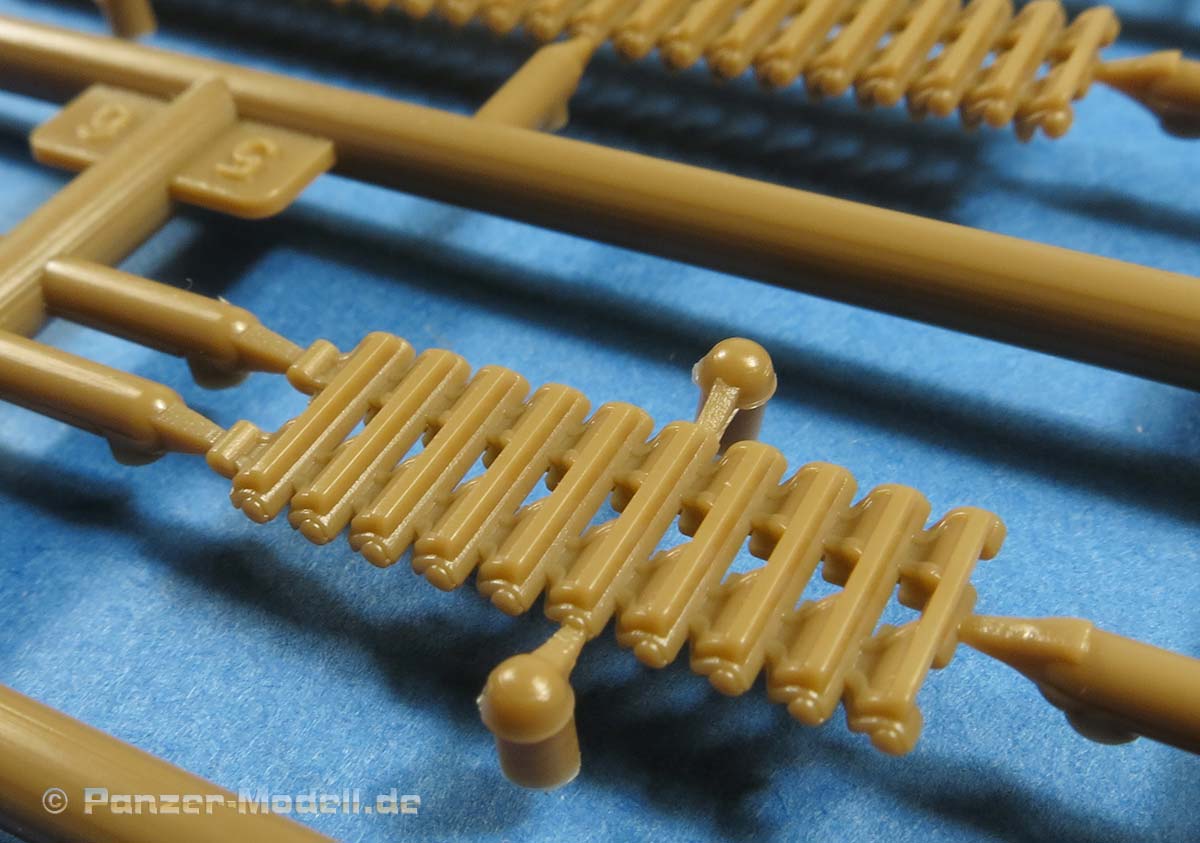 Die Fahrwerksgondeln mit ihren auffälligen und typischen Spiralfedern sind sehr schön gesprtzt dargestellt und werden zudem noch mit mehrern PE Teilen verfeinert - ein Plus für die Detaillierung ein Minus für die sorglose Baubarkeit. Da die Federn einteilig in hartem Plastik gespritzt sind, bleibt hier natürlich nichts federn oder beweglich - das ist allerdings auch nicht nötig, das der Bausatz einer Segmentkette aufweist, die keine bewegliche Federung zulässt.