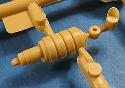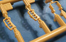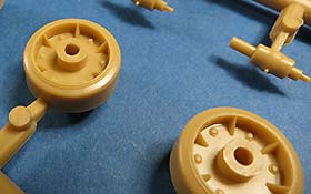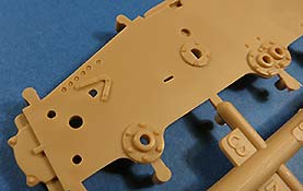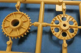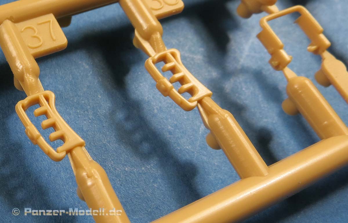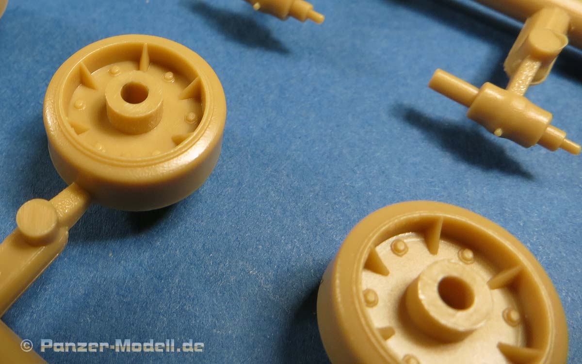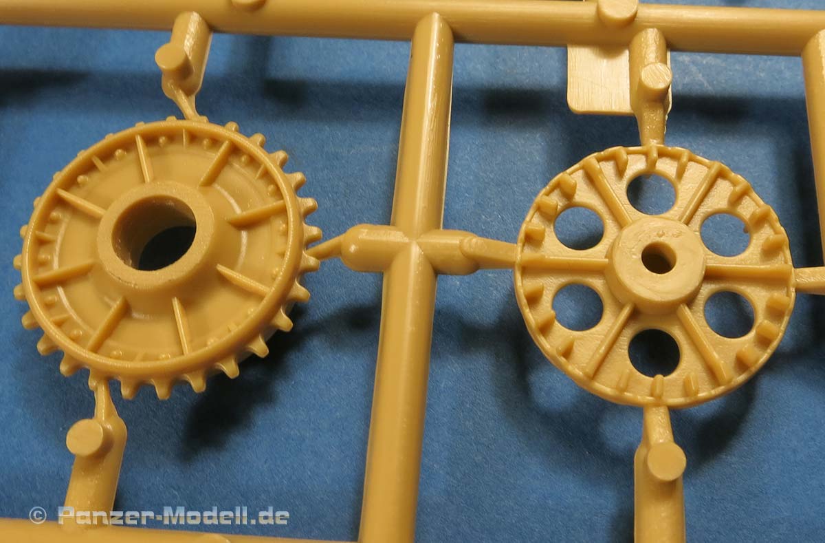 Die Fahrwerksgondeln mit ihren auffälligen und typischen Spiralfedern sind sehr schön gesprtzt dargestellt und werden zudem noch mit mehrern PE Teilen verfeinert - ein Plus für die Detaillierung ein Minus für die sorglose Baubarkeit. Da die Federn einteilig in hartem Plastik gespritzt sind, bleibt hier natürlich nichts federn oder beweglich - das ist allerdings auch nicht nötig, das der Bausatz einer Segmentkette aufweist, die keine bewegliche Federung zulässt.