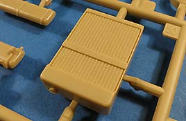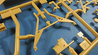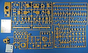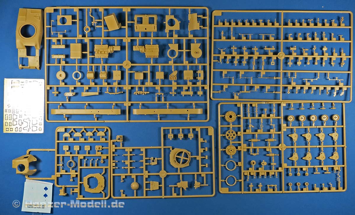 Im Karton finden sich 8 gelbe Spritzlinge, ein rotbrauner Spritzling, die Oberwanne, eine PE Platine und ein Decal Bogen.