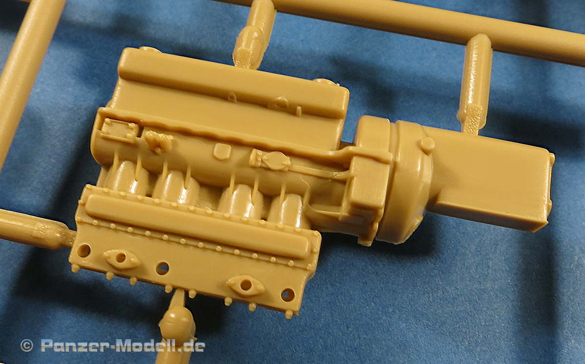 Das Schöne ist, dass Hobby Boss dem Modell eine komplette Inneneinrichtung spendiert inklusive Motor, Getriebe, Lüfter und Kühler - diese Sachen machen einen ganz hervorragenden und vor allem telelastig detaillierten Eindruck. Allein Motor und Getriebe werden aus rund 70 Teilen inklusive PE Teilen zusammengebaut - da kann man sich schon gut vorstellen wie fein detailliert die Ausgestaltung ist.
