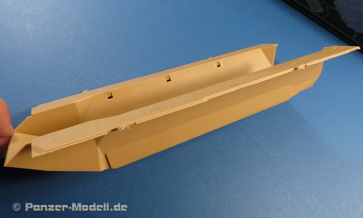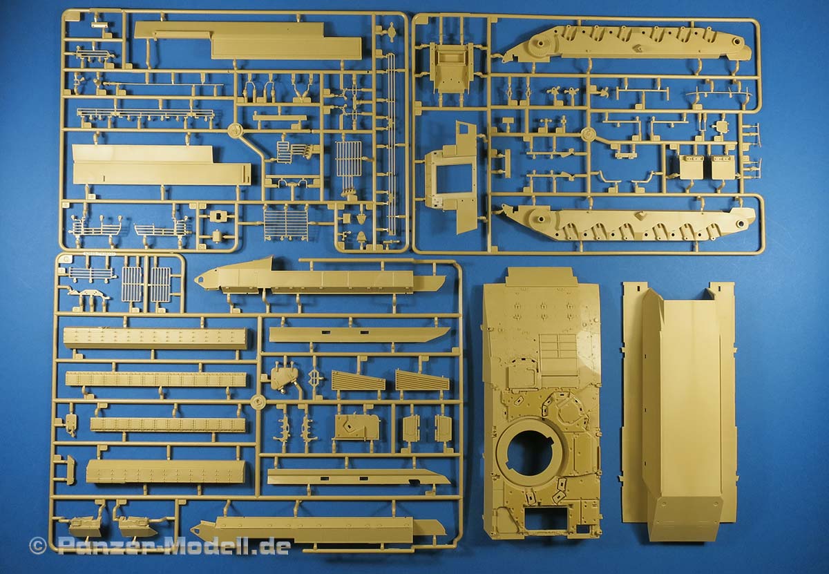 Einschränken möchte ich dieses insofern gleich am Anfang als dass es ein wenig enttäuschend ist, das dem Bausatz jegliche Antirutschbeschichtung fehlt, sowohl auf der Oberwanne als auch auf den Oberseiten der Zusatzpanzerung, die ansonsten optisch recht auffällig sind. Eine Nacharbeitung durch die Modellbauer wäre aufwendig und heutzutage absolut unnötig.