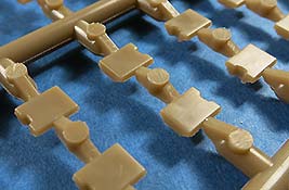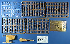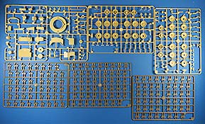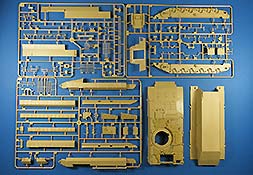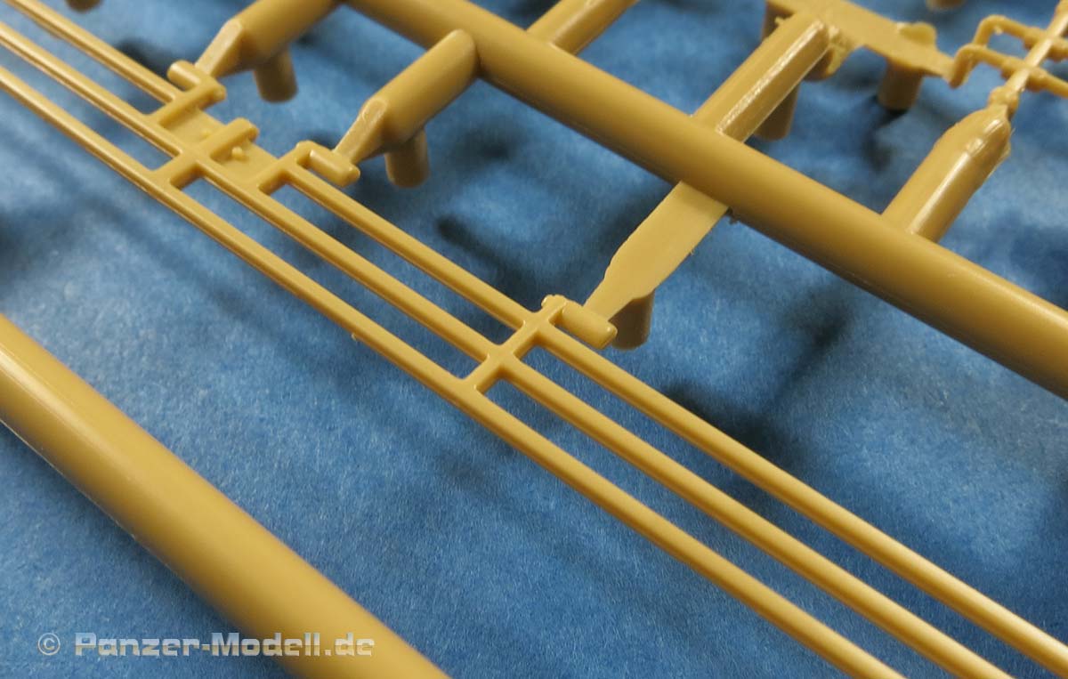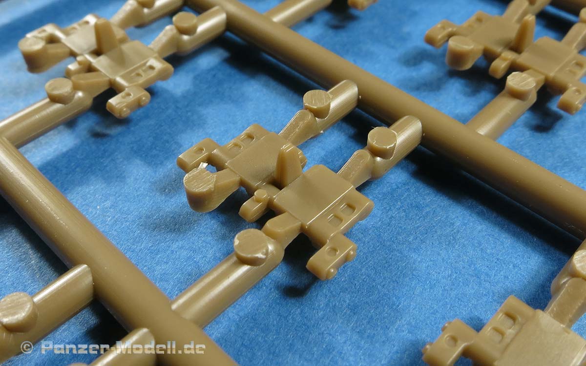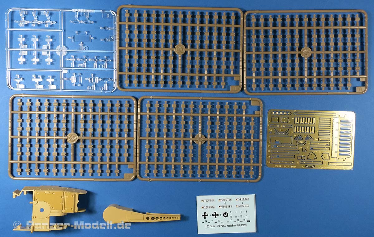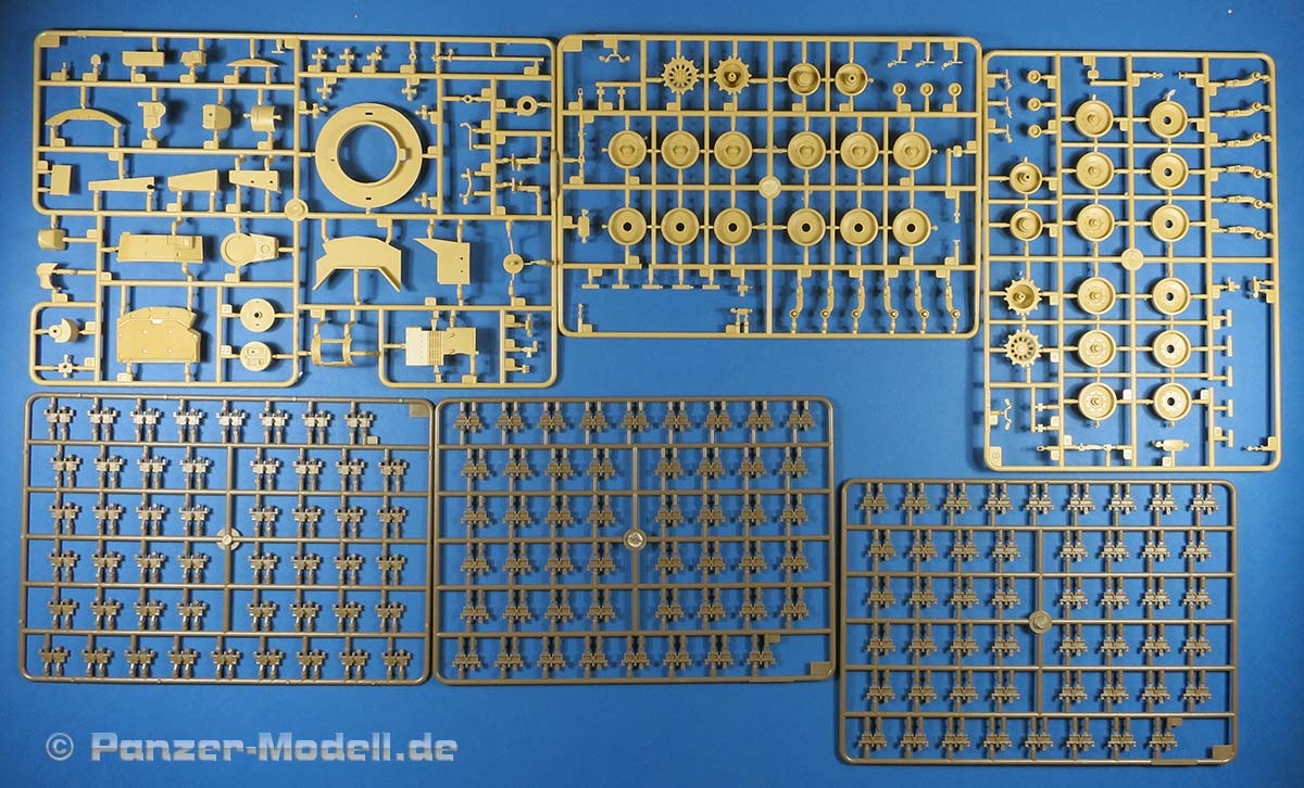 Im recht großen Karton finden sich 6 gelbe Spritzlinge, 7 rotbraune Spritzlinge, ein Klarsicht Spritzling, die Ober- und die Unterwanne, das Turm Oberteil, die Kanonen Halterung, eine PE Platine und ein Decal Bogen.