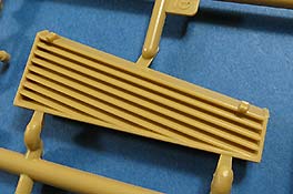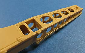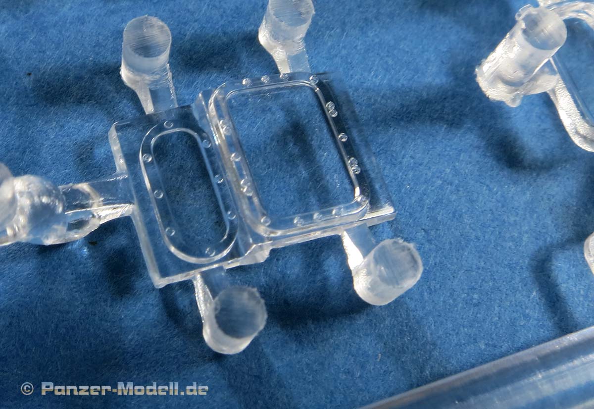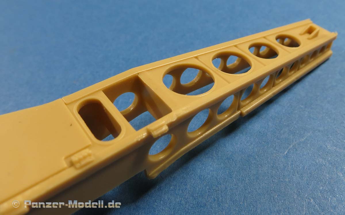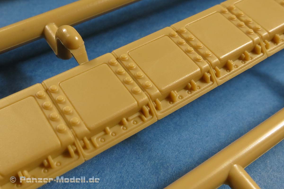Die seitliche Zusatzpanzerung ist in wenigen großen Teilen baubar und prinzipiell mit der Darstellung der einzelnen Elemente und Bolzenköpfe schön detailliert. Wie aber oben schon angesprochen sticht die fehlende Antirutsch Beschichtung am oberen Ende leider deutlich ins Auge.