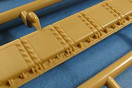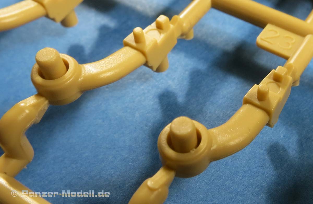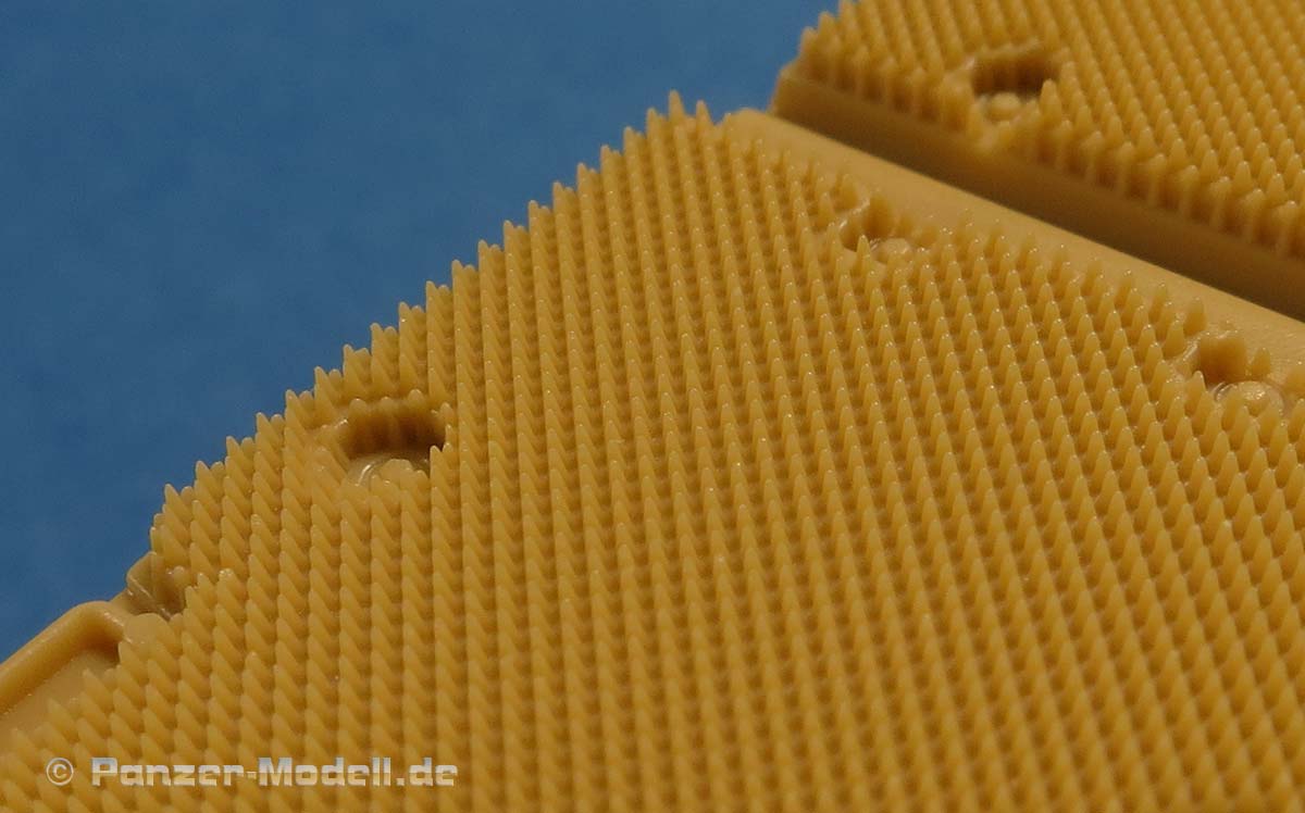 Auch, dass die Gummimatten Panzerung bereits auf die Bauteile mit angespritzt ist, im Gegensatz zu den einzelnen aufklebbaren Elementen bei Ryefield, empfinde ich als Rückschritt. Dies macht die Bemalung unnötig schwieriger. Auch die Darstellung der Gumminoppen sagt mir persönlich nicht so zu, denn sie erscheinen sehr sehr kurz und stark kegelförmig. Vielleicht lag Hobbyboss hier und bezüglich Antirutschbeschichtung nur kein passendes Vorbildmaterial zur Verfügung!?