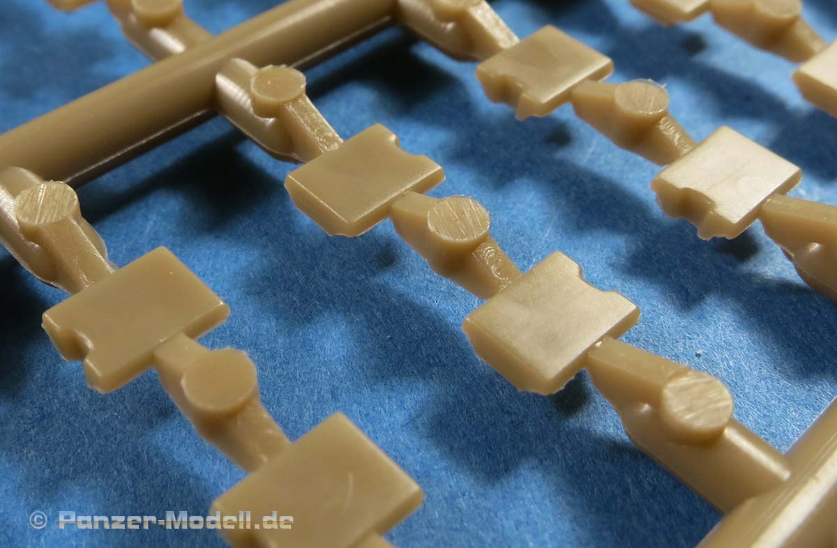 Auch bei der Kette bleibt der Puma von Hobby Boss hinter seinen Möglichkeiten. Die Kettenglieder müssen geklebt werden und bleiben nicht beweglich. Zusätzlich müssen die zwei Gummipolster pro Kettenglied einzeln aufgeklebt werden. Dieses erscheint mir unnötig - zwar erleichtert es die Bemalung, aber im Gegenzug sind ein paar hundert Kleinteile herauszutrennen, zu versäubern und einzukleben.