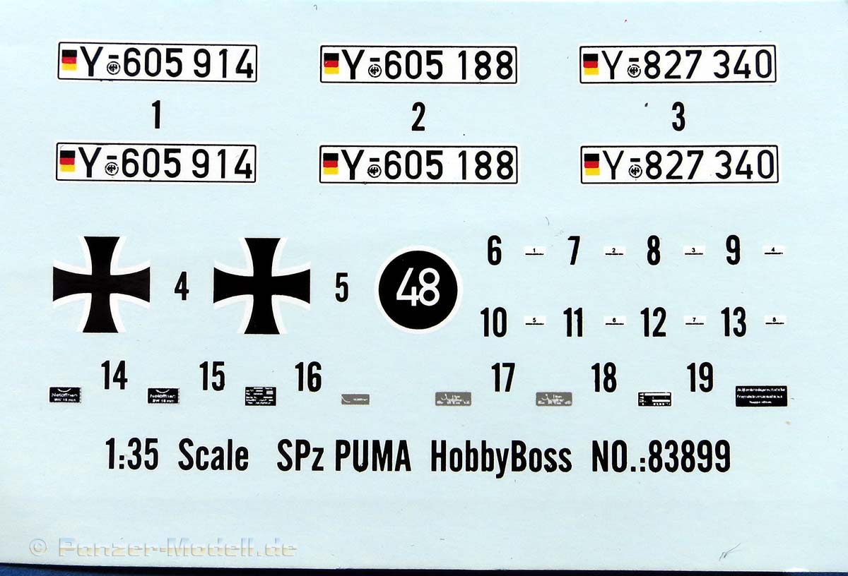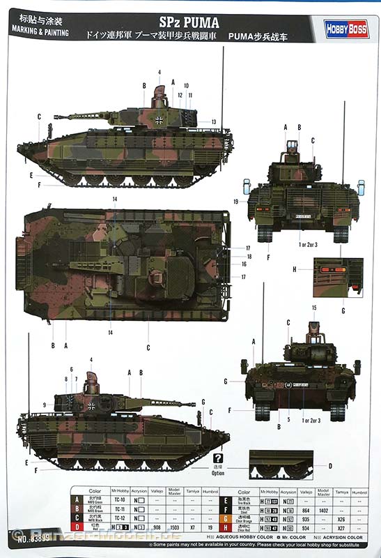 Der separat beiliegende, farbig gedruckte A4 Bogen informiert über Bemalung und Markierung. Es wird eine Version dargestellt, der Decalbogen bietet Nummernschilder für drei verschiedene Fahrzeuge der Bundeswehr im typischen Dreifarb Flecktarn.
