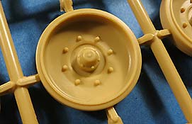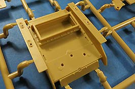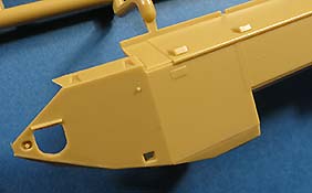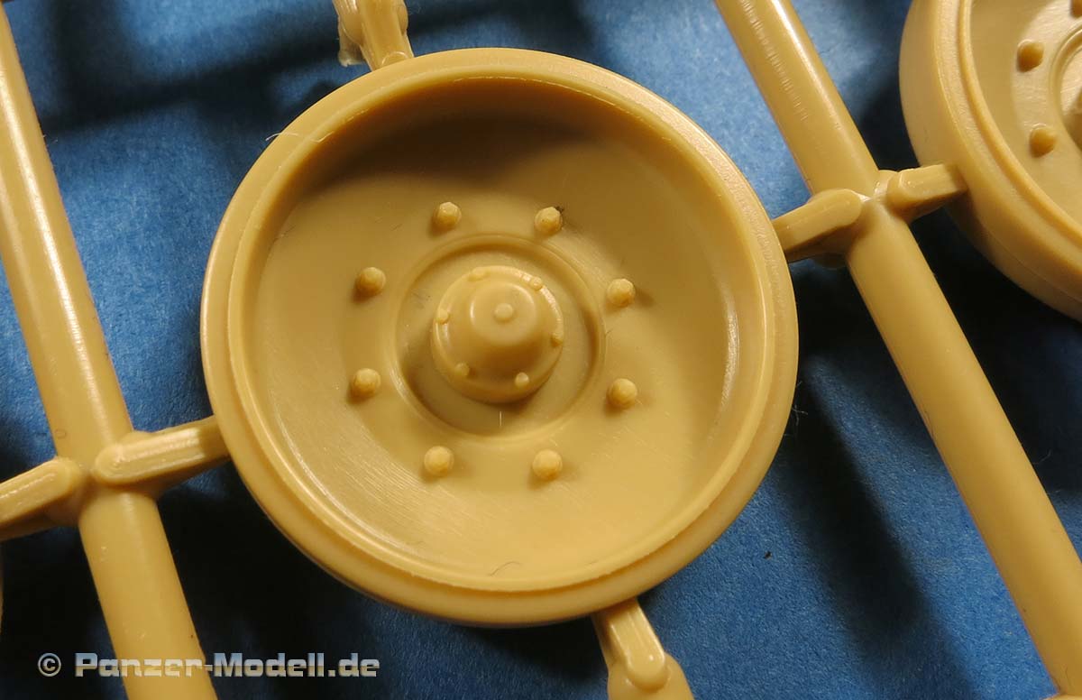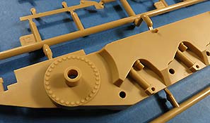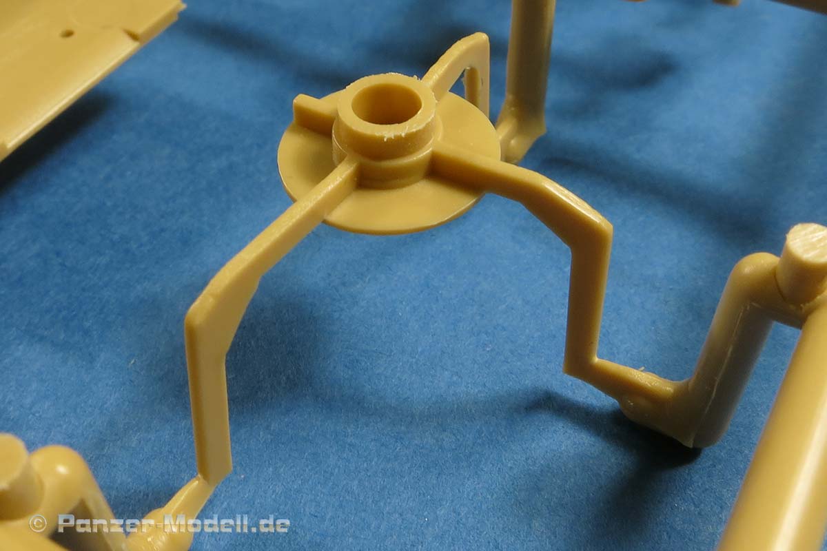 Die Unterwanne ist einteilig mit von außen anzuklebenden Fahrwerksteilen, wie beim Original. Die Schwingarme werden fest eingeklebt und bleiben nicht beweglich. Die Laufrollen machen einen guten Eindruck, sind sauber und detailliert dargestellt auch diese werden aufgeklebt und bleiben nicht beweglich.