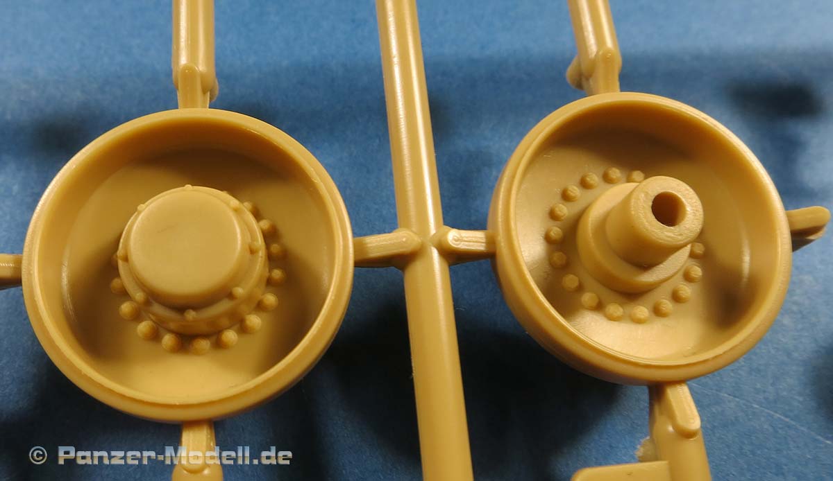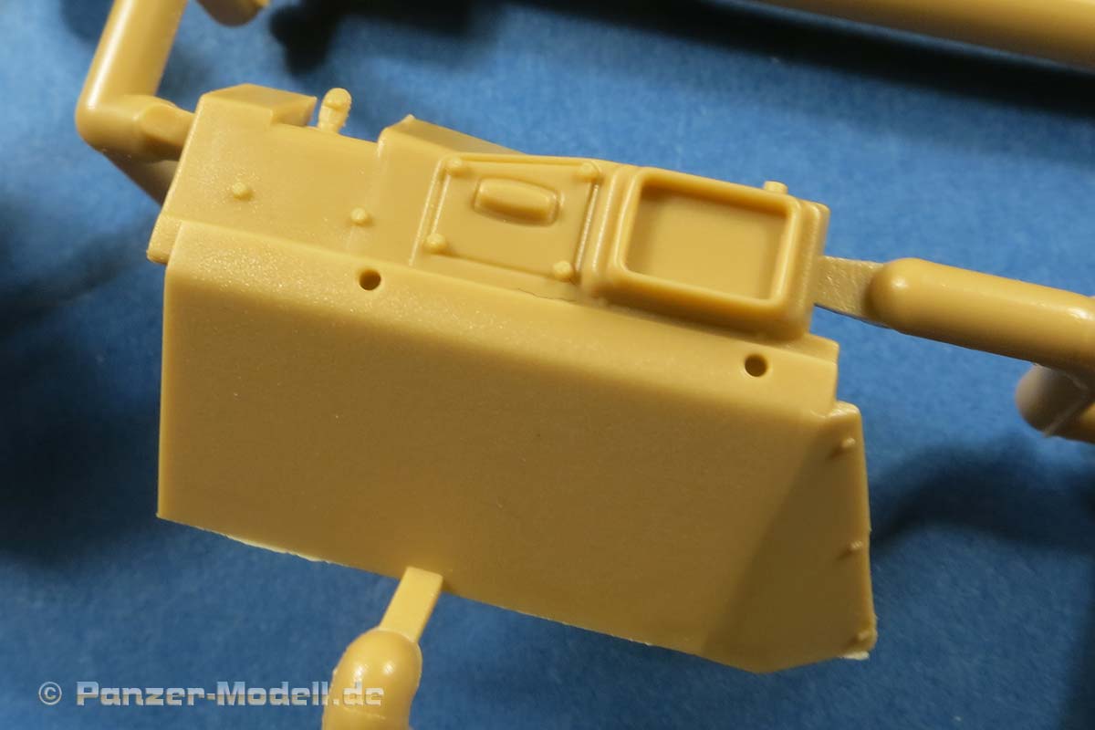 Während die Luken im hinteren Bereich der Oberwanne offen oder geschlossen darstellbar sind, was mangels Inneneinrichtung nur bedingt Sinn macht, sind unverständlicherweise die Kommandanten- und Fahrerluke bereits geschlossen auf der Oberwanne angegossen und es wird nahezu unmöglich sein diese nachträglich noch zu öffnen. Gerade hier wäre das Öffnen zum Einsetzen einer Figur sinnvoll.