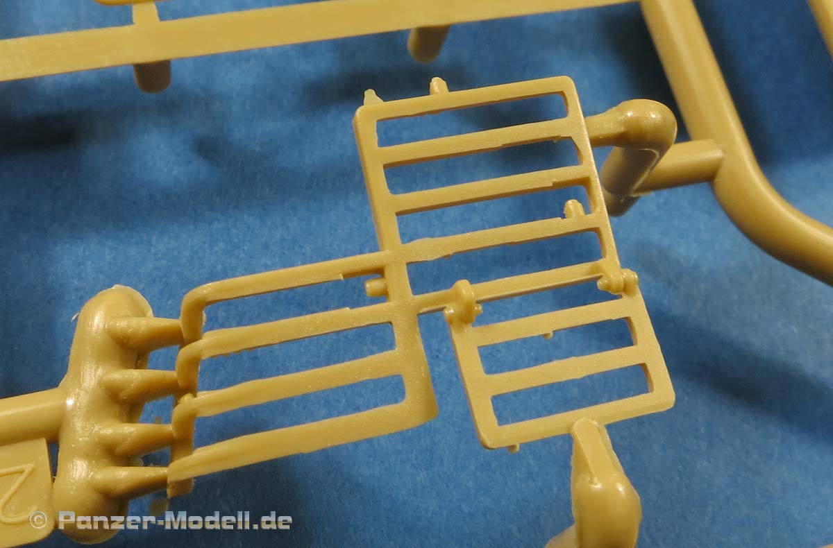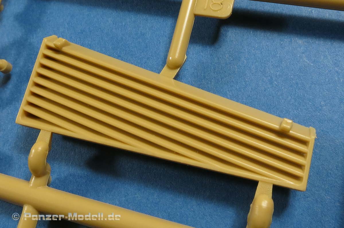 Die vordere Stauhalterung auf der Oberwanne wird hingegen sehr schön und vorbildlich durch PE Teile ergänzt, was ein sehr guten Eindruck macht. Auch die untere schmale Gitter Panzerung an den Seitenschürzen wird durch viele kleine PE Teile ergänzt und aufgewertet, wenn auch diese recht aufwendig für die Modellbauer anzubauen sind. Die Slat Armor Elemente am Fahrzeugheck machen prinzipiell einen guten Eindruck, wennaucj diese durch die Gestaltung als Spritzgussteile dicker als PE Teile sind und im Vergleich auch dicker als diese vom Ryefield Modell.