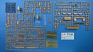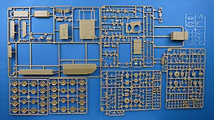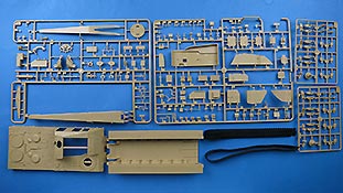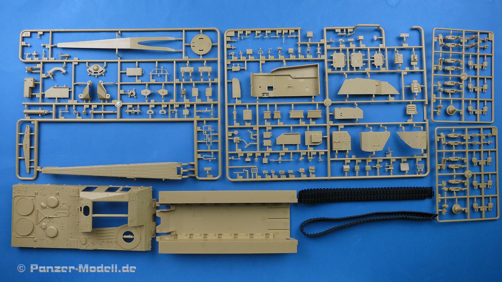 Im großen Bausatzkarton finden wir 14 beige Spritzlinge, einen schwarzer Sprizling, einen klaren Spritzling, zwei Sets Polycaps, 2 Vinylketten, Oberwanne, Unterwanne, 2 PE Platinen, verdrilltes Kupferseil und ein Decalbogen.