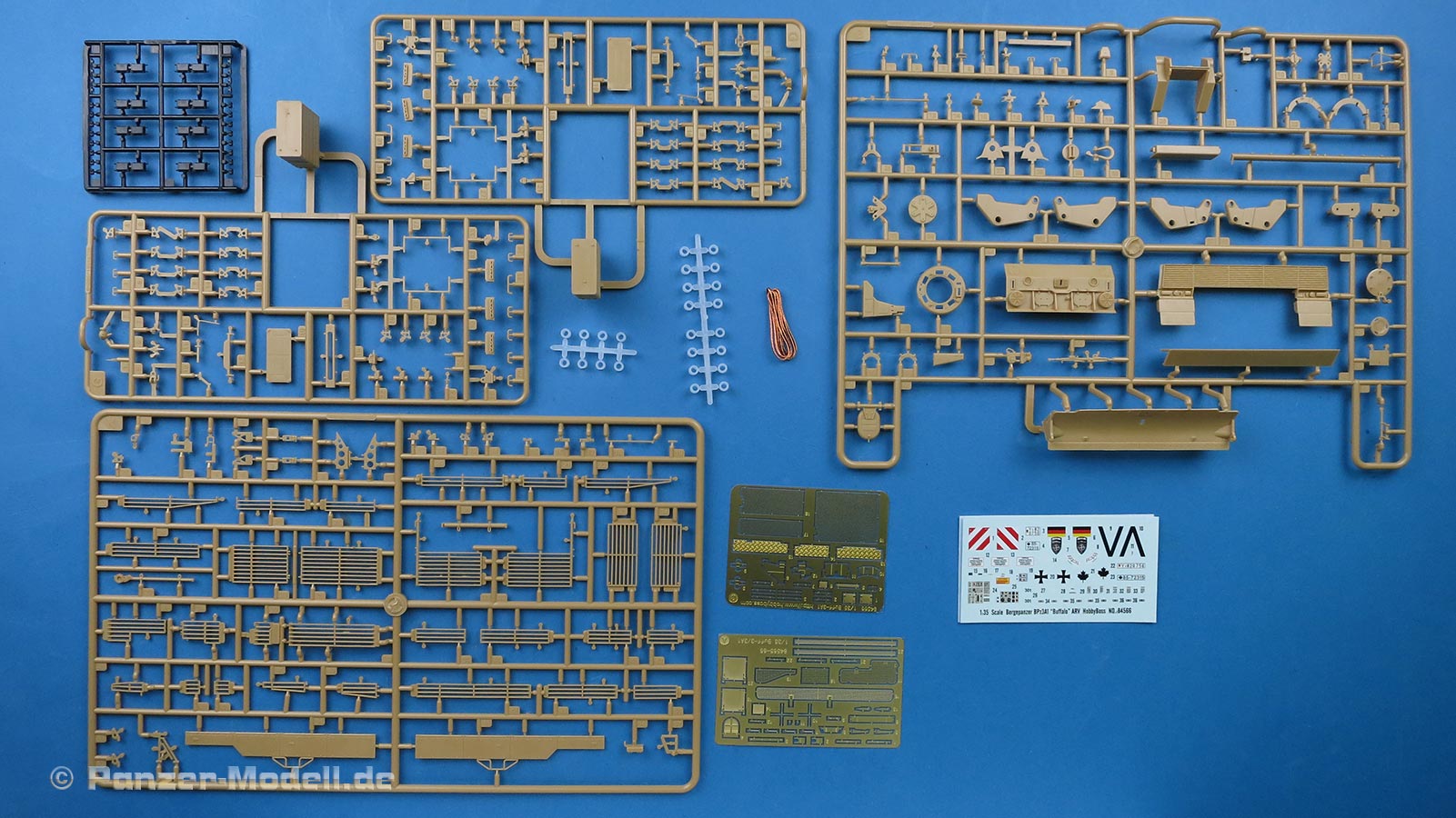 Vorab sei gesagt, dass dieser Bausatz "nur" die A1 Version des Büffel darstellt, wie sie damals übergangsweise im ISAF Einsatz in Afghanistan eingesetzt wurden. Die regulären A1 SSA, die in Serie mittlerweile in der Truppe im Einsatz stehen, unterscheiden sich in diversen Bereichen. Auch die in diesem Bausatz angebotene kanadische Version unterscheidet sich leider vom Bausatz und kann nur mit eigenen Änderungen genutzt werden.