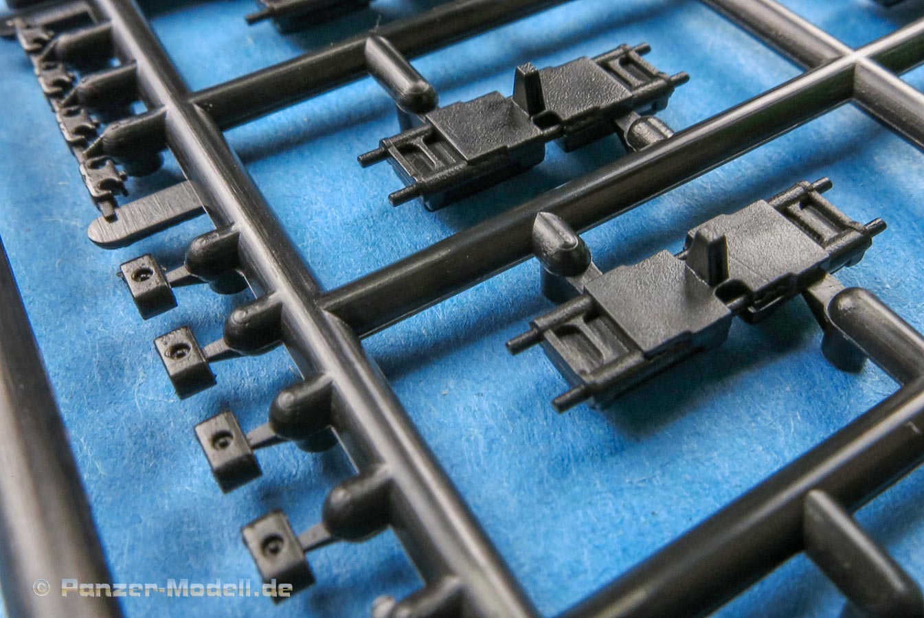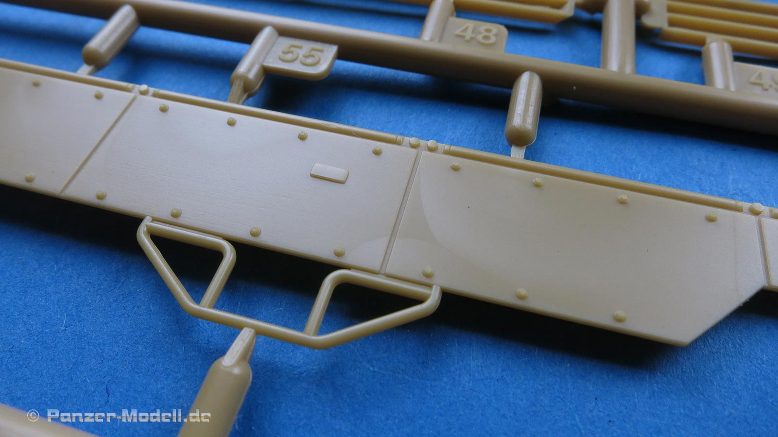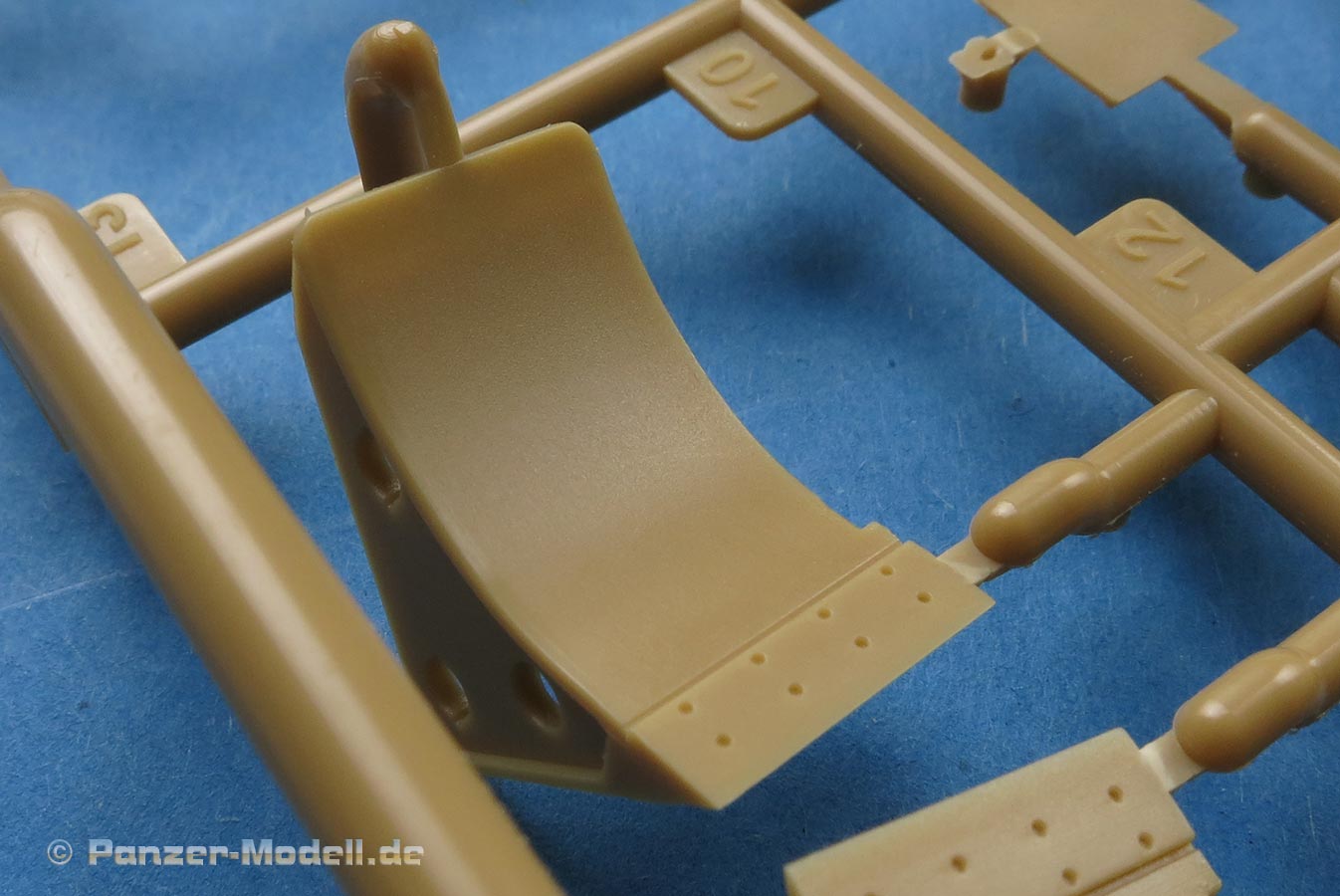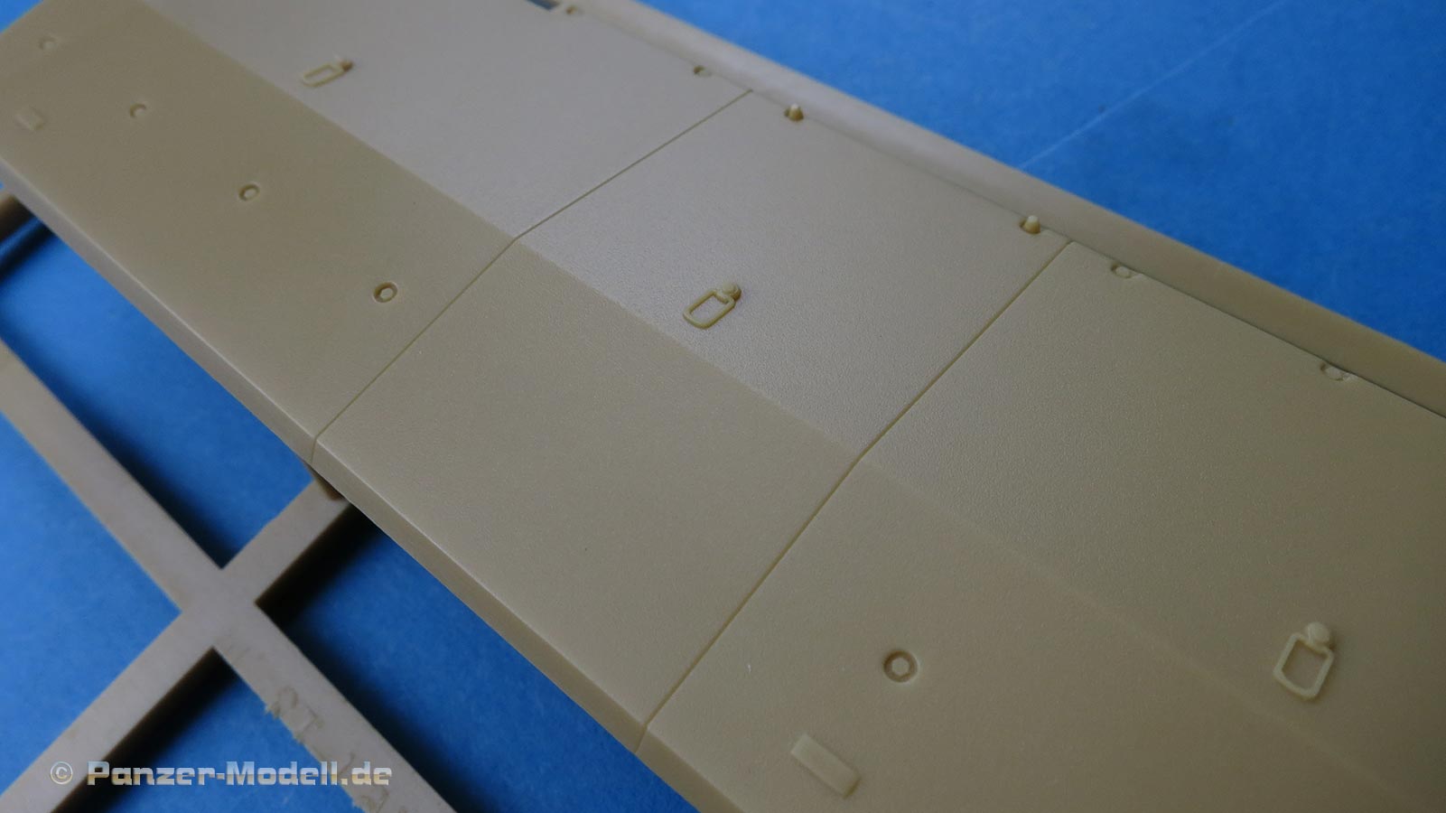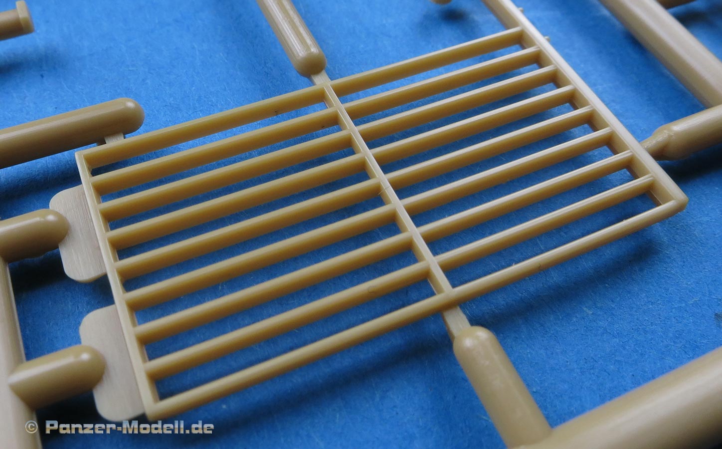 Die seitliche Zusatzpanzerungselemente sind jeweils einteilig und die Frontpanzerungselemente bestehen aus zwei Teilen. Die aufgeprägten Details sind recht schön, fein und sauber. Die hinteren Schürzenelemente sind die Standardschürzen der 3.Generation und auch jeweils einteilig.