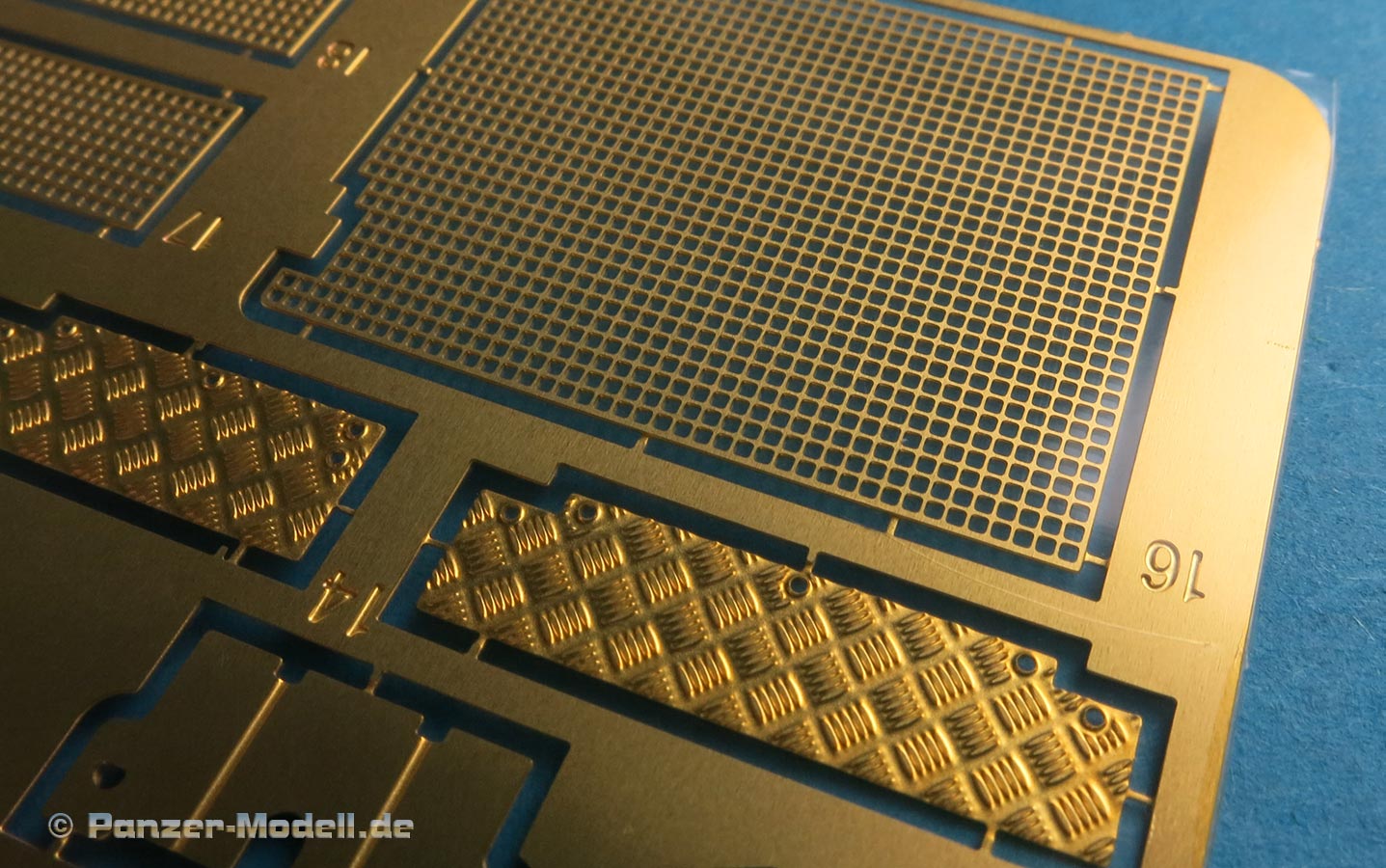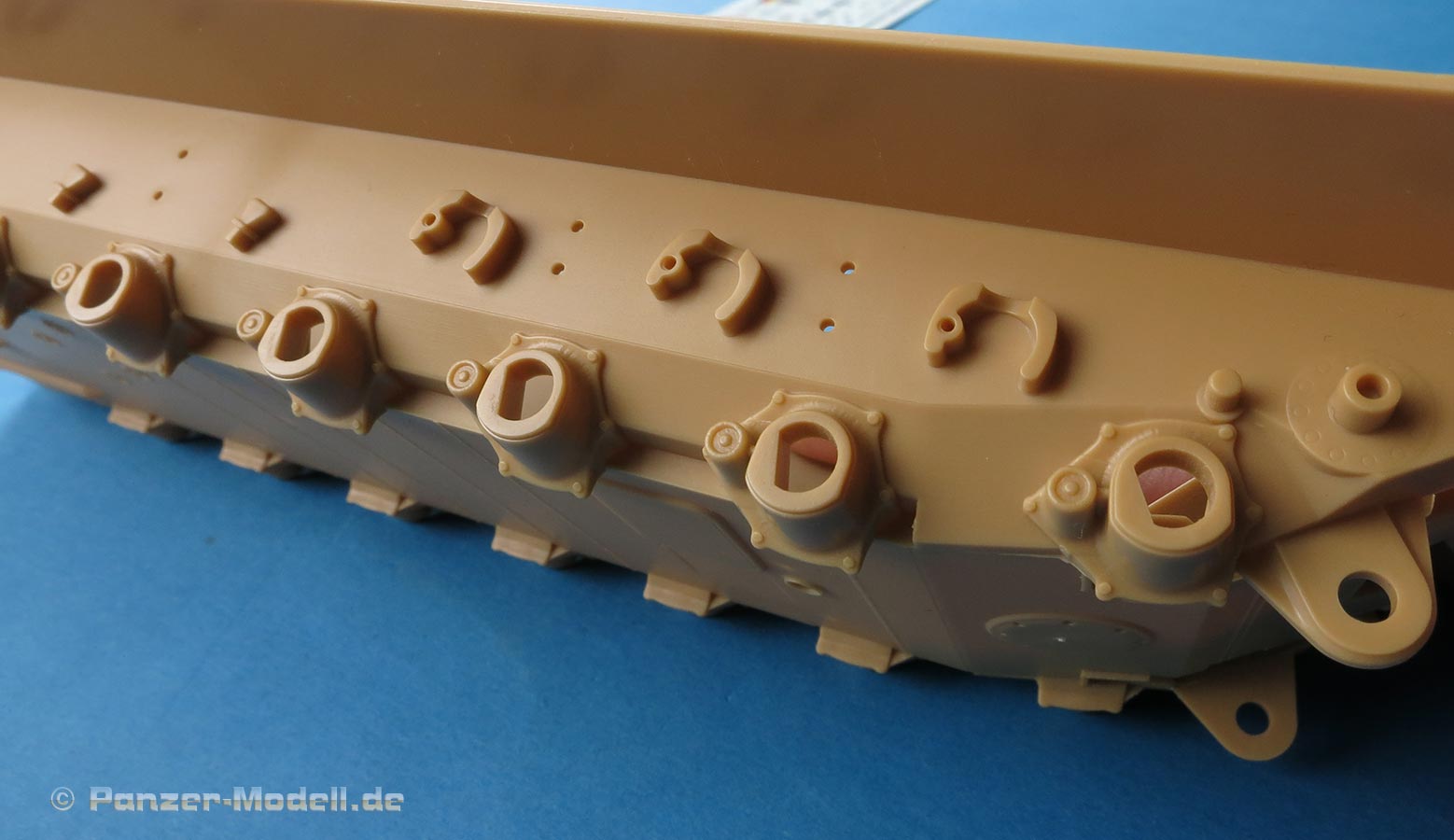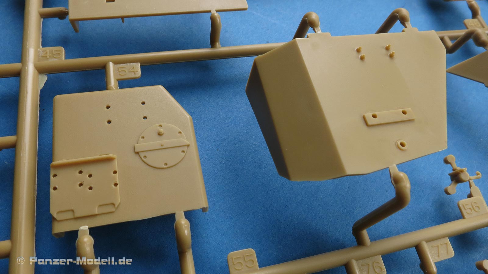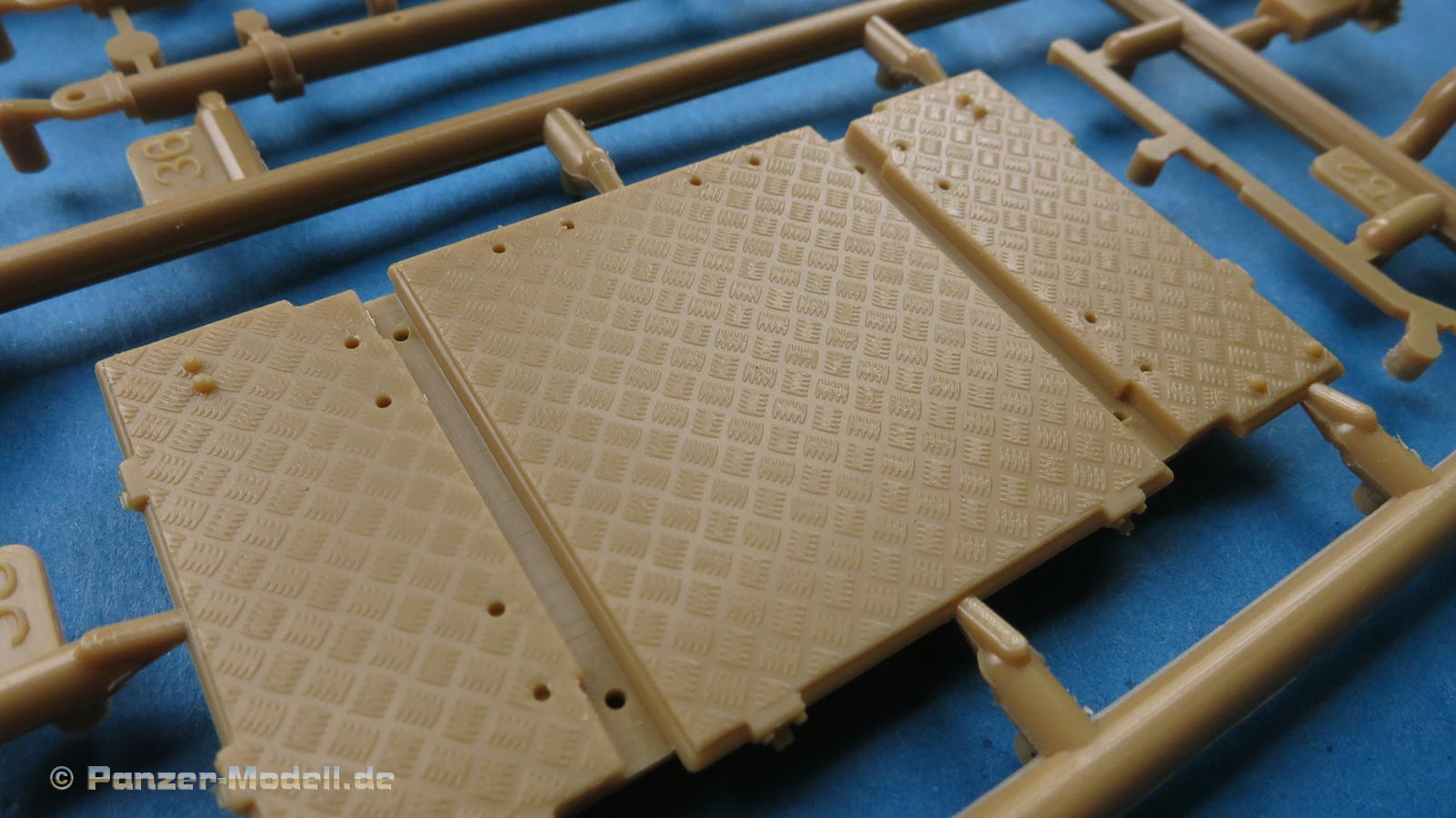Die seitliche Zusatzpanzerungselemente sind jeweils einteilig und die Frontpanzerungselemente bestehen aus zwei Teilen. Die aufgeprägten Details sind recht schön, fein und sauber. Die hinteren Schürzenelemente sind die Standardschürzen der 3.Generation und auch jeweils einteilig.