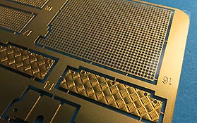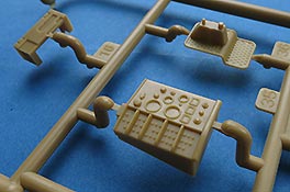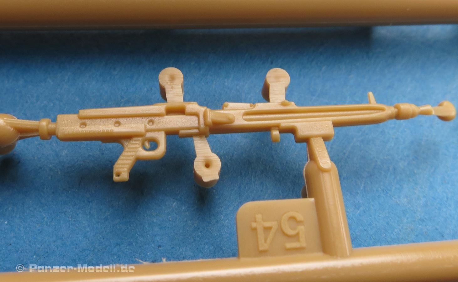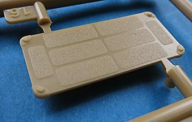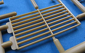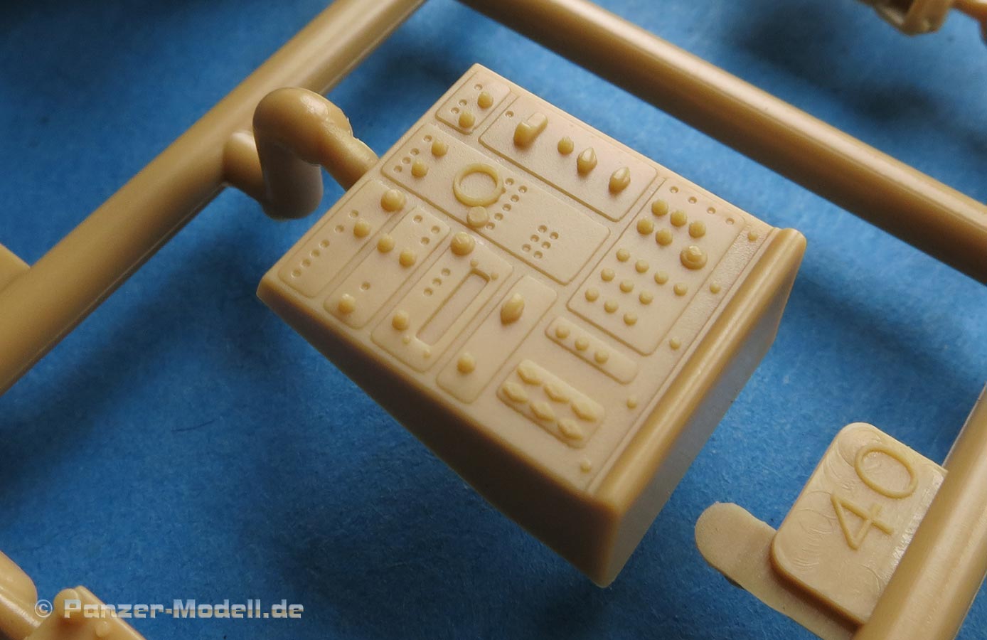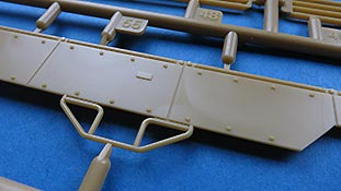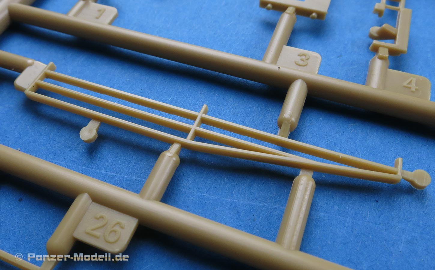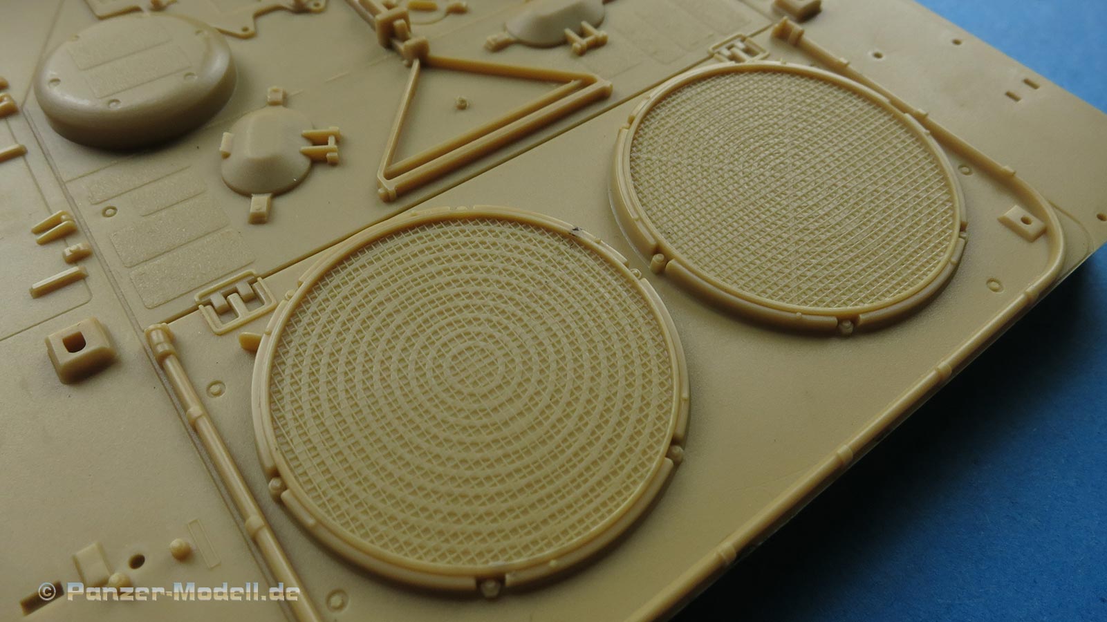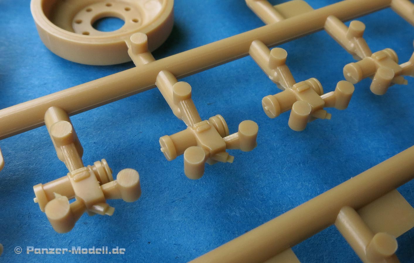 Die seitliche Zusatzpanzerungselemente sind jeweils einteilig und die Frontpanzerungselemente bestehen aus zwei Teilen. Die aufgeprägten Details sind recht schön, fein und sauber. Die hinteren Schürzenelemente sind die Standardschürzen der 3.Generation und auch jeweils einteilig.