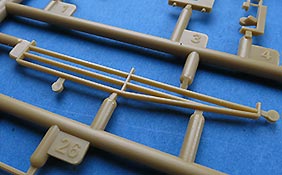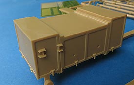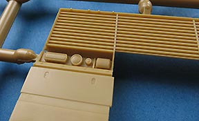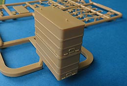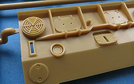 An der Außenseite des Kranarms im abgelegten Zustand werden zwei Elemente an SLAT Armor angebracht - diese ist, wie auch an der Wanne, in Spritzguss dargestellt - das ist auf der einen Seite einfach für den Modellbauer und die Qualität ist sauber und glatt. Auf der anderen Seite sind die Streben natürlich etwas sehr stark und damit maßstäblich zu dick. PE wäre hier sinnvoll, aber das würde deutlich komplizierter für den Modellbauer sein.
