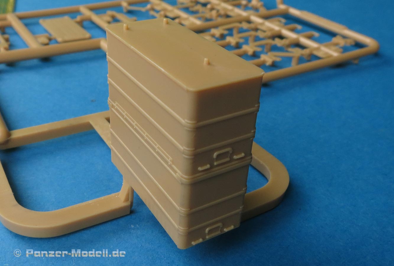 Das bergepanzerspezifische Werkzeug und Zubehör, das auf der Wanne mitgeführt wird, liegt alles bei. Und hier kommt dann auch die andere große Änderung zum Vorgänger Büffel, denn das Motordeck ist koplett anders bestückt als zuvor. Eine große Tragplatte, die UTP, ersetzt die zuvor aufgebrachte Motortraverse und das klappbare Werkzeugrack am Heck. Diese setzt sich hier aus mehreren Platten mit PE Teilen, neuen Staukästen, eine große Kiste mit abgedeckten Riffelblechen und Zargesboxen zusammen. Die Qualität der Bauteile ist ganz schön, gerade das Riffelblech und die kleinen einzelnen Handgriffe sind schön gespritzt. Die UTP Erweiterung und der Bergeschlitten sind hier ebenfalls enthalten.