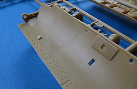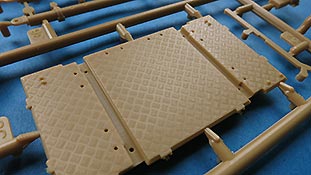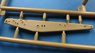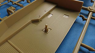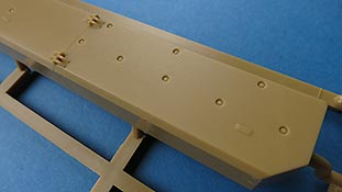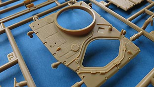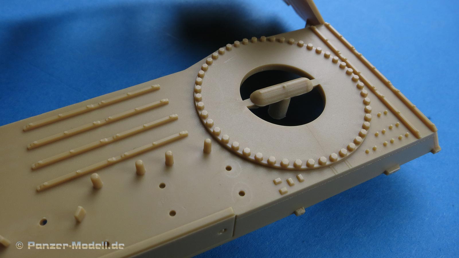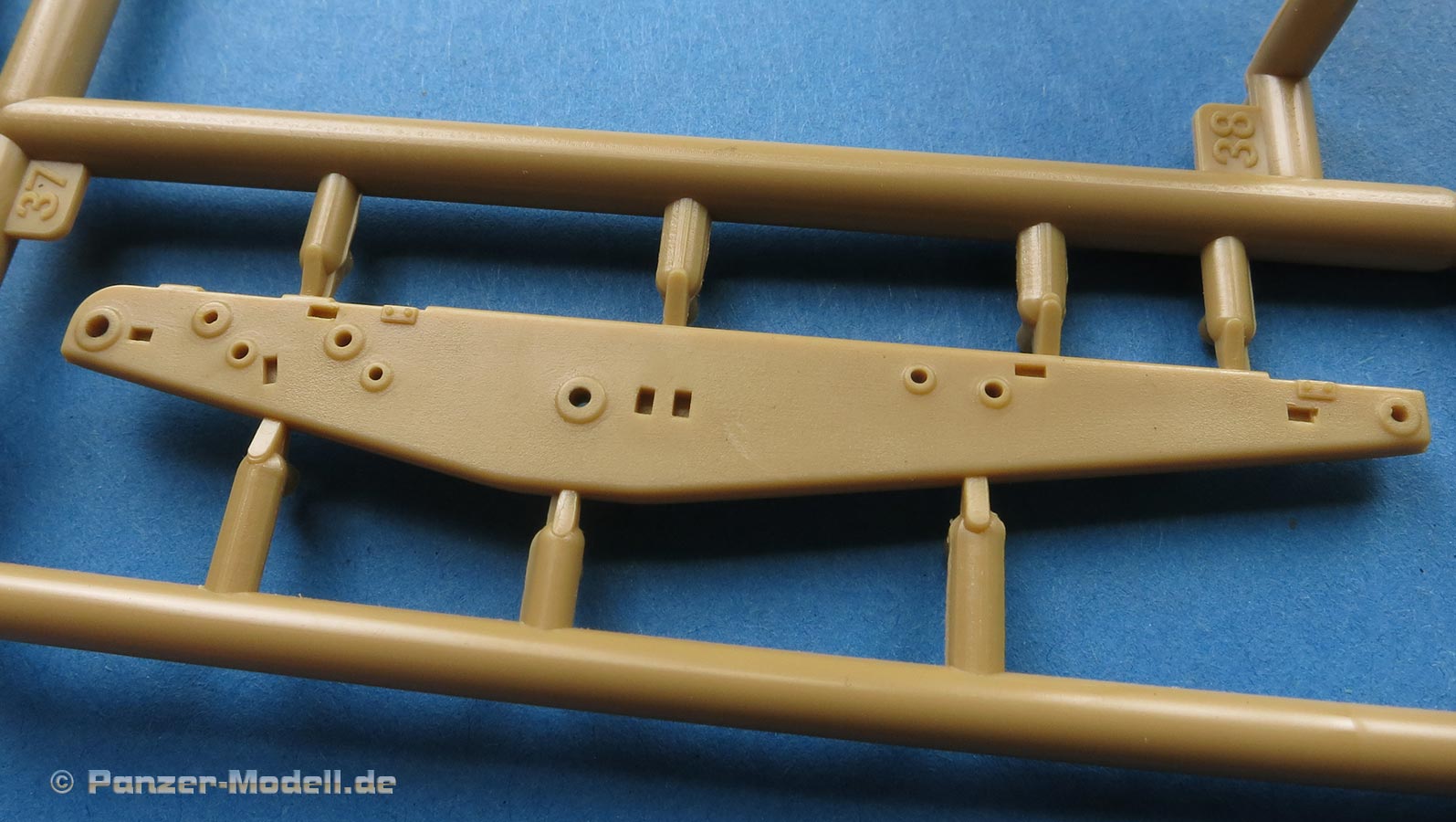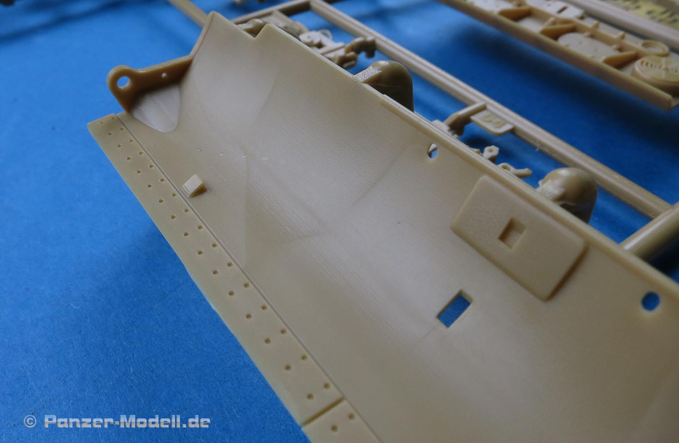 Die Unterwanne ist einteilig was den Bau vereinfacht und die bereits aufgeprägten Details sind sehenswert und an der Front sind schon die Ausschnitte für die Arme des Stützschilds eingearbeitet. Leider hat Hobby Boss hier am Heck die 3 Verstärkungsstreben mit dargestellt, die der Büffel tatsächlich gar nicht hatte.