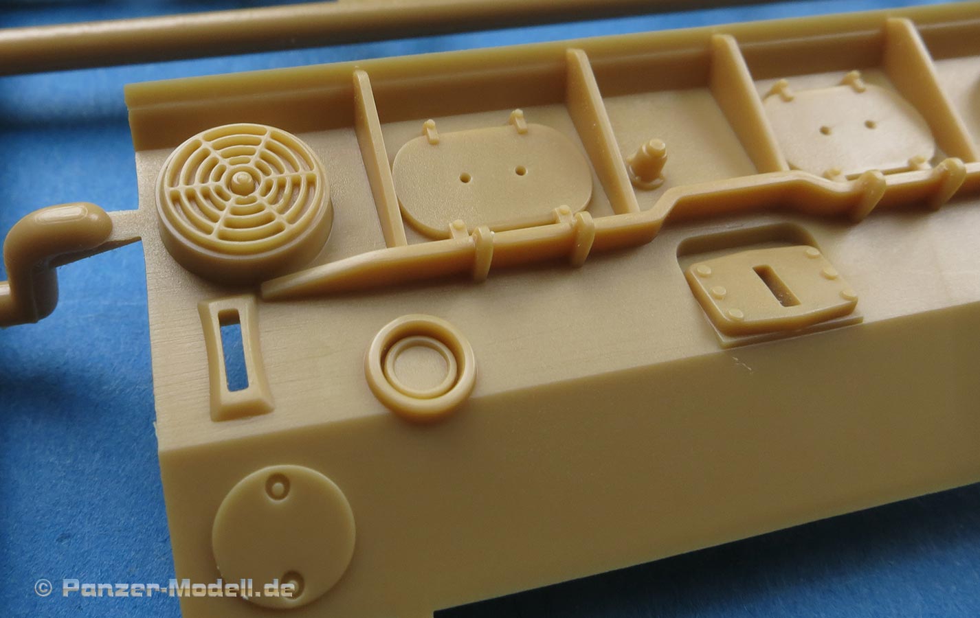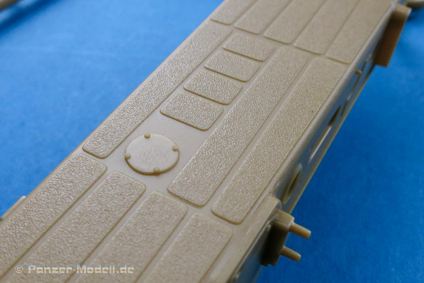 Die Antirutschpads sind bereits aufgeprägt - hier soweit ganz ok mit der rauen Struktur, auch wenn ich sie eine Idee zu dick empfinde. Auch die Struktur der beiden Rundlüfter auf dem Motordeck ist sehr schön und fein aufgeprägt. Extra PE Teile gibt es nicht dafür - das ist ok, aber nicht Stand der Technik heutzutage.