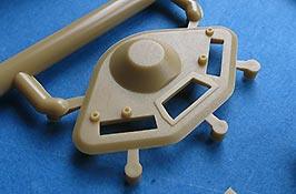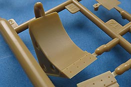 Das bewegliche Stützschild an der Front kann höhenbeweglich eingebaut werden. Das Schild selber ist wirklich hervorragend geformt mit der Rundung und den kleinen, feinen Details, die die Rippen und Bohrungen an der verstärkten Lippe unten. Dafür fehlen leider auf der Rückseite nach wie vor einige der Details, die schon beim Vorgängerbausatz gefehlt haben - imd gerade was die Halterungen für die Stützschildverbreiterung angeht, ist das schon echt eklatant. Die Stützschildverbreiterungen indes liegen beide bei.
