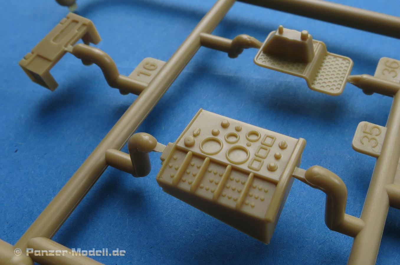 Der Kampfraum ist wirklich ziemlich komplett ausgestattet mit den Arbeitsplätzen von Fahrer, Kommandant und Bergegehilfe, Armaturen und Zubehör- Die Sitze der Besatzung sind gut dargestellt, die Bodenplatte mit feinem Riffelblechmuster und auch der Stauraum, der sich hinter der letzten Seitentür verbirgt ist entsprechend dargestellt - der Detailgrad all dieser Teile ist sehr gut, fast wirkt es ein wenig sehr kleinteilig, aber das ist dann wohl so, wenn viele kleine Teile im Innenraum dargestellt werden müssen. ABER! Leider ist das 1:1 der Kampfraum des "Normalen" Büffels und ist seitens Hobby Boss nicht auf den A1 Stand gebracht worden. Auf der anderen Seite kann man den auch beruhigt weglassen, denn der EInblick ist nur noch über die Dachluken möglich und da ist die Sicht nach Innen doch recht begrenzt.