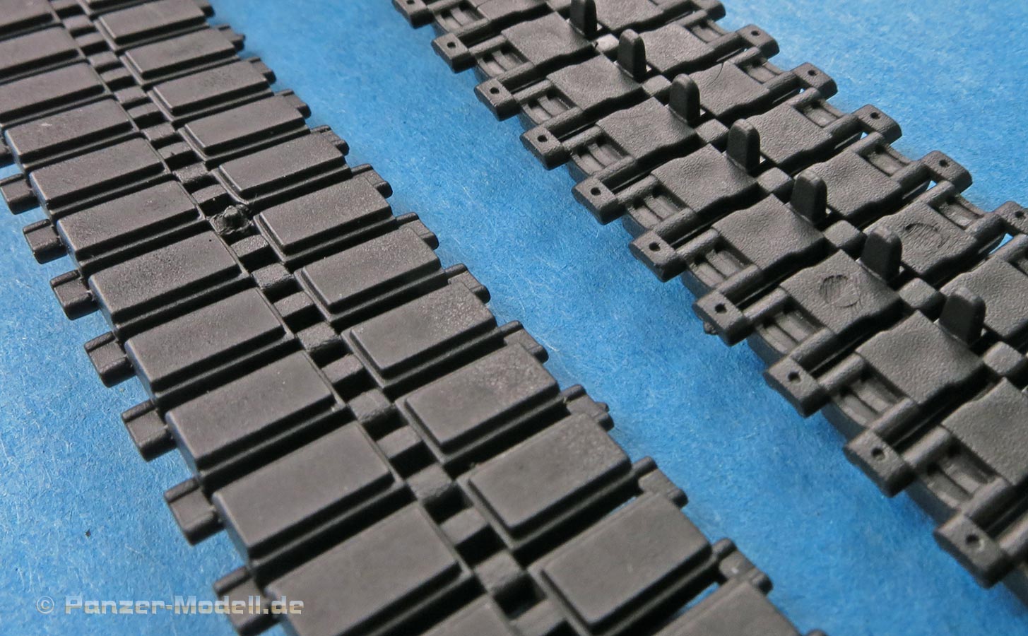 Die Ketten liegen als je zwei Stränge Vinylketten bei, die einen recht guten Eindruck machen, wobei es natürlich hier Defizite gegenüber Spritzguss oder 3D Druck gibt - gerade die Auswerferstellen alle paar Glieder auf der Innenseite sind ein wenig ärgerlich, zumal sich das weiche Plastik da kaum versäubern lässt. Dafür ist der Bau recht schnell und einfach.
