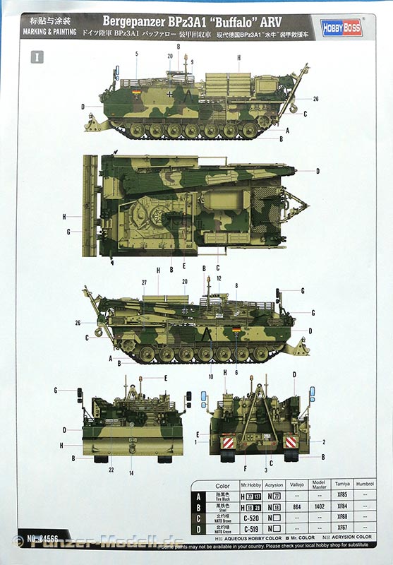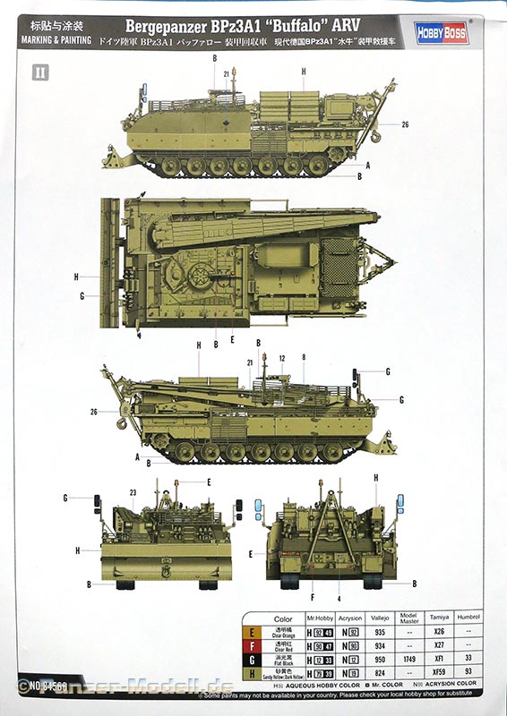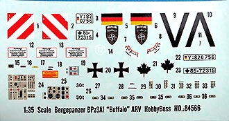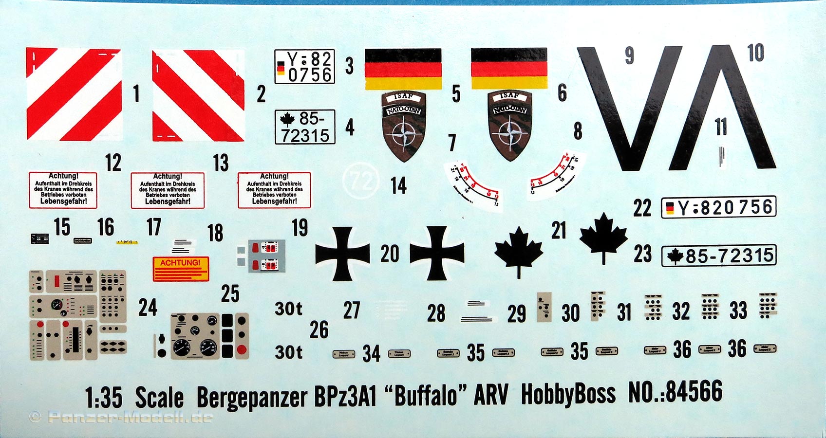 Auf einem einzeln beiliegenden, doppelseitig bedruckten Bogen sind 2x Farbprofile zur Markierung und Bemalung des Büffels. Der Decalbogen umfasst sämtlich Warnschilder und Anzeigen für Instrumente - das ist schonmal sehr löblich.